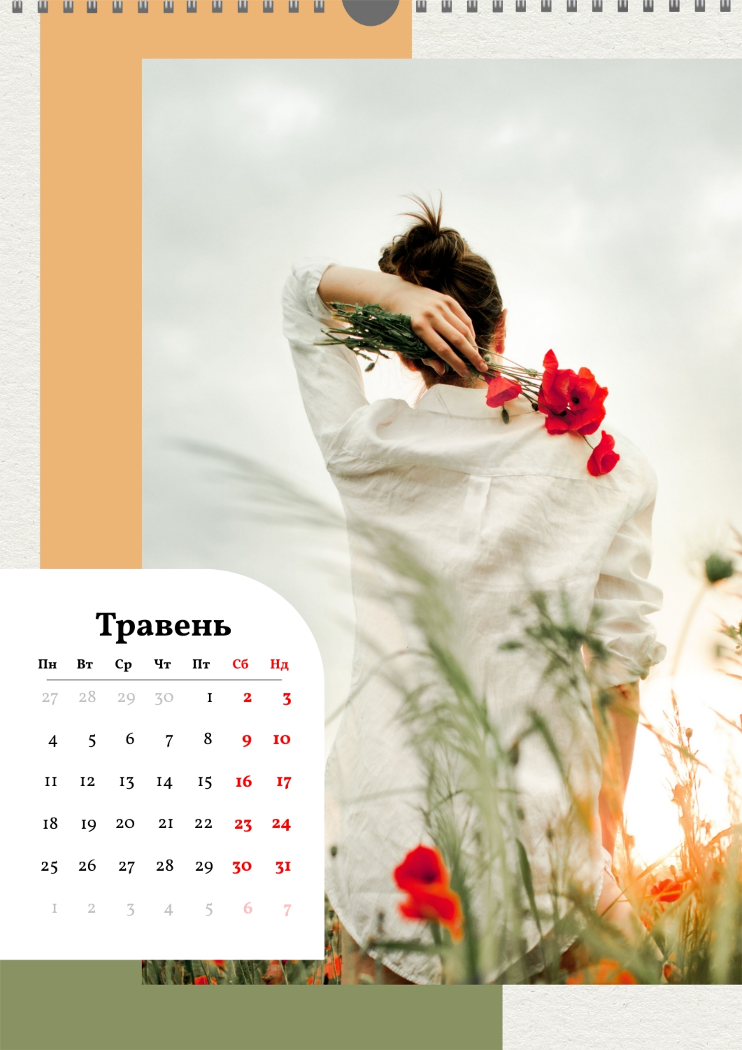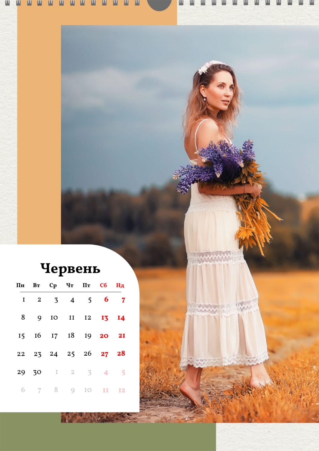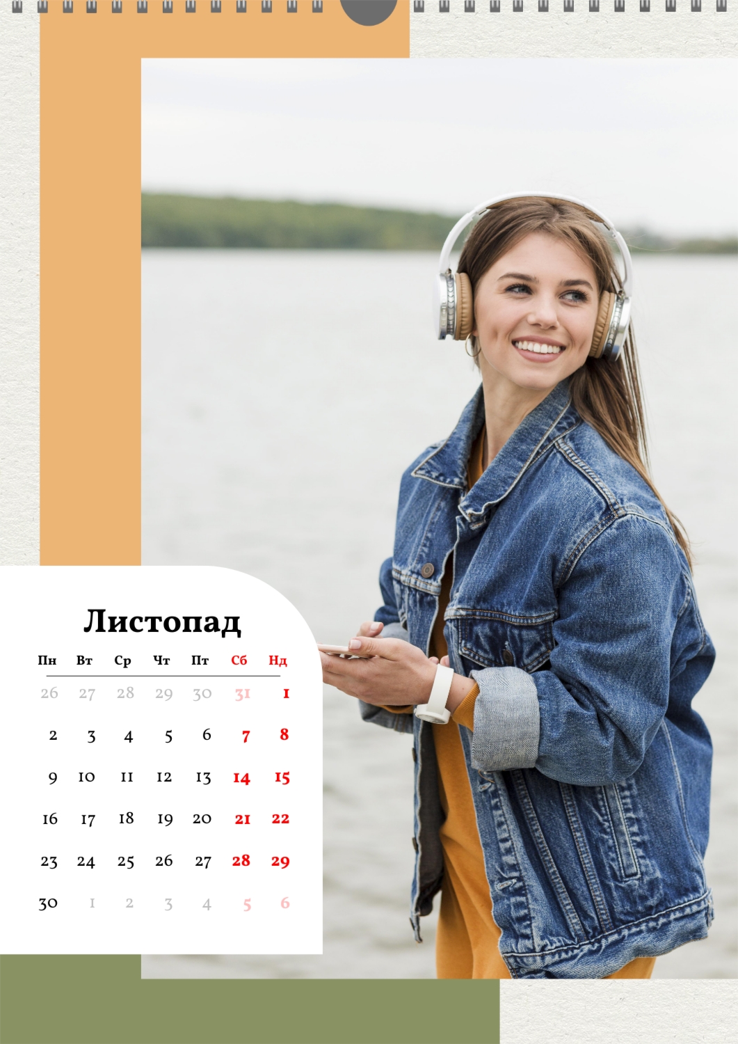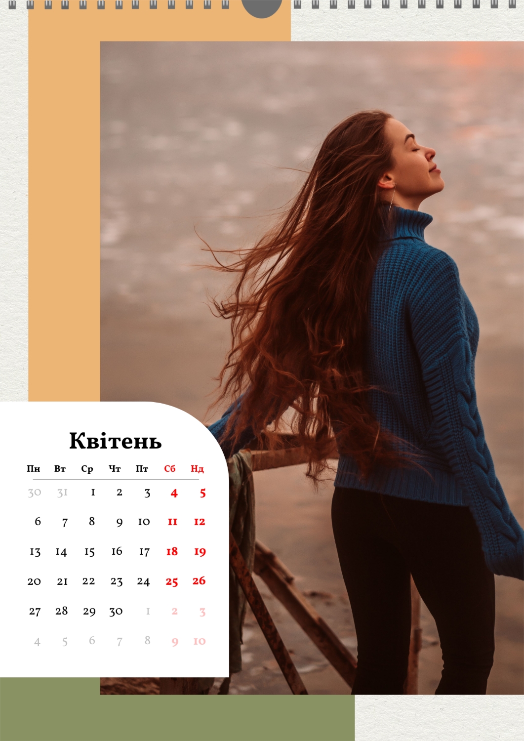 Наш настінний календар "кращі спогади" в нашому онлайн-конструкторі надає унікальні можливості для творчості та персоналізації. Весь дизайн шаблону спрямований на підкреслення значущих подій і важливих дат, дозволяючи вам створити календар, який повністю відображає вашу індивідуальність. Спеціальні розділи шаблону надають простір для ваших фотографій, щоб ви могли зафіксувати найяскравіші моменти свого життя. Завдяки інтуїтивно зрозумілому редактору, ви зможете легко додавати, змінювати і переміщати зображення, щоб створити гармонійний композиційний баланс. Ви також маєте можливість регулювати яскравість, контрастність і насиченість фотографій, щоб кожен знімок виглядав так, як ви хочете. Параметри колірної схеми шаблону дозволяють вибрати ті відтінки, які відповідають вашому смаку та уподобанням. Це не тільки створює гармонійний дизайн, але й допомагає виділити ключові елементи вашого календаря. Таким чином, ваші найкращі моменти будуть не тільки збережені, але й виділені в цьому унікальному та персоналізованому вертикальному календарі.