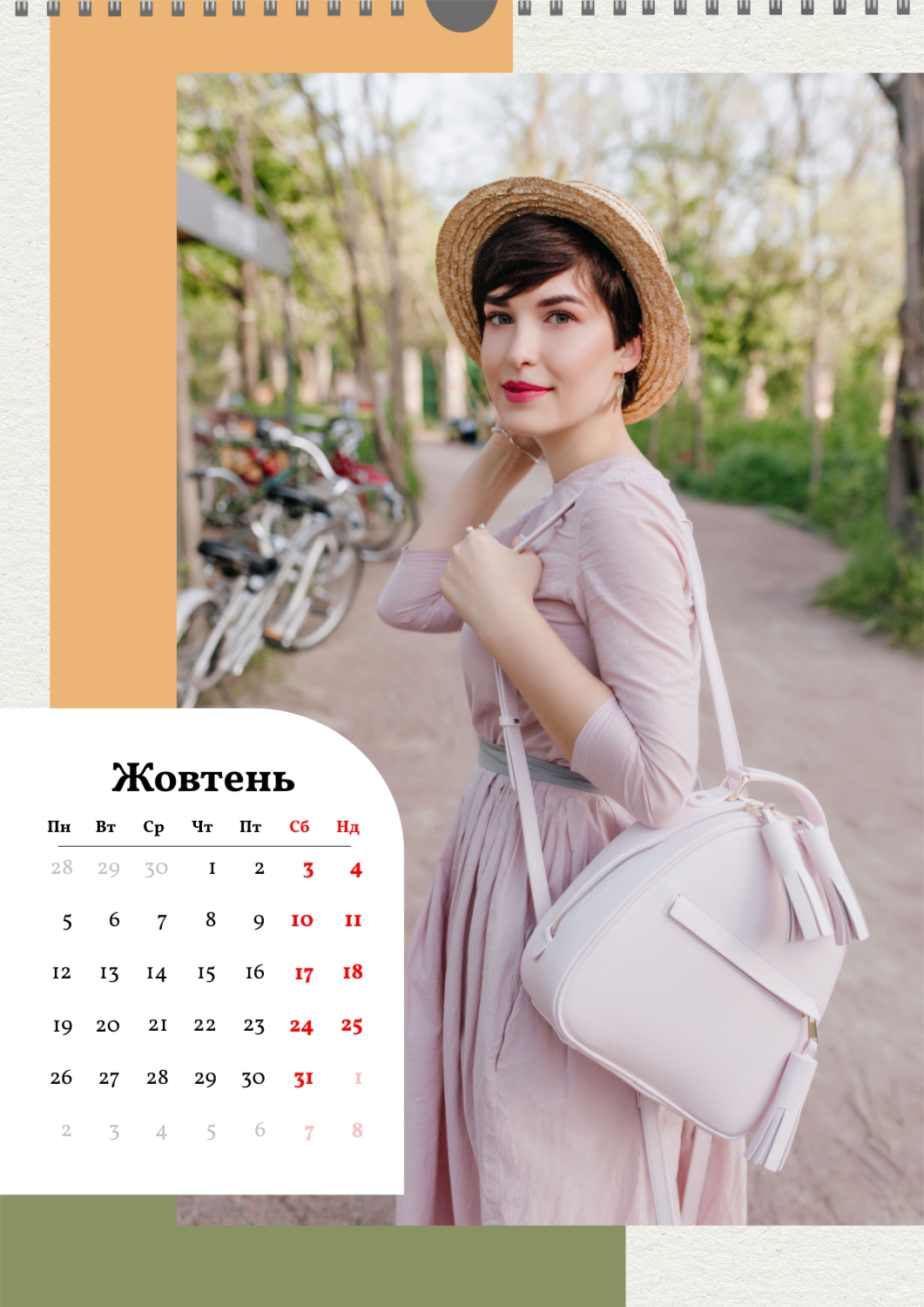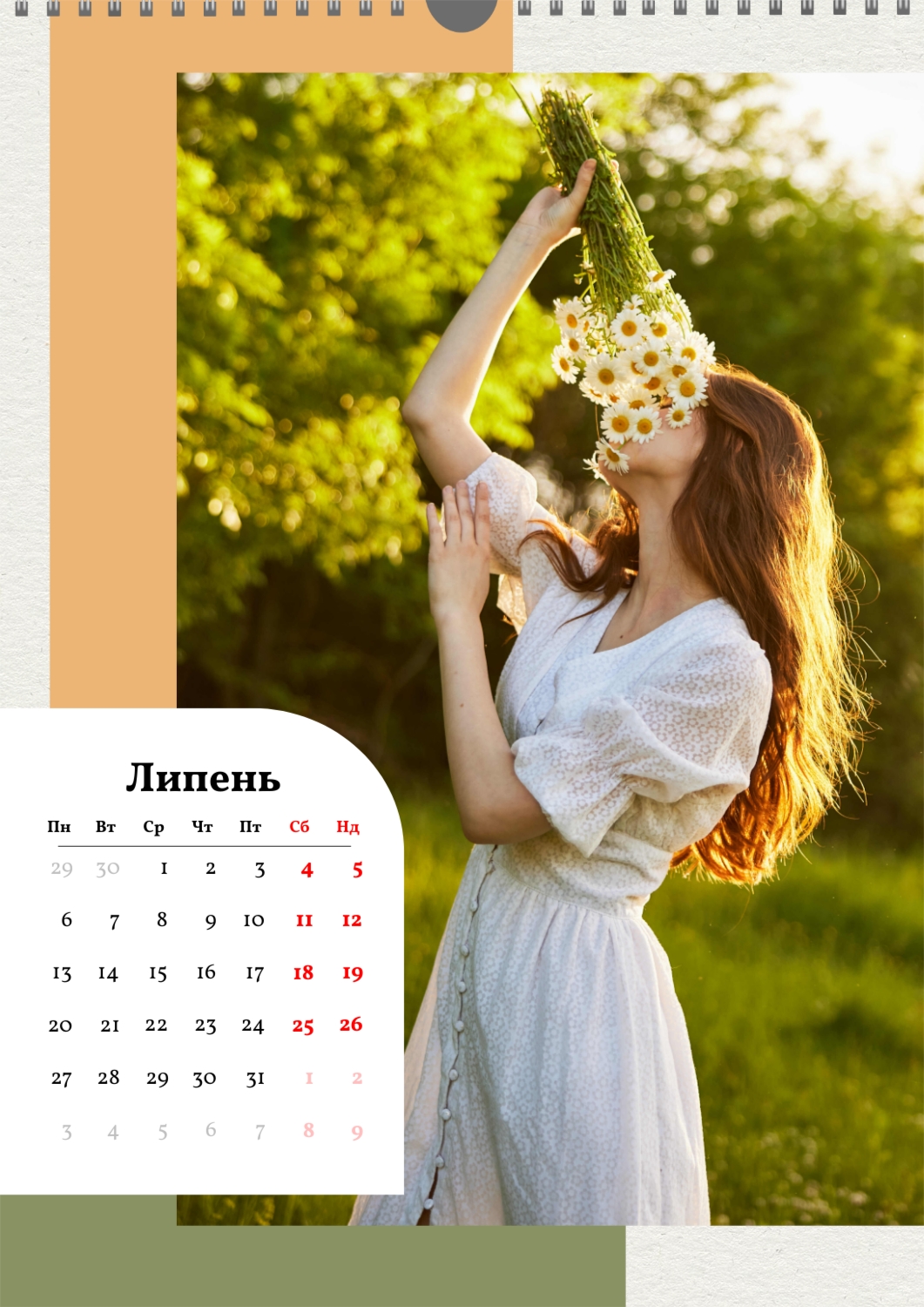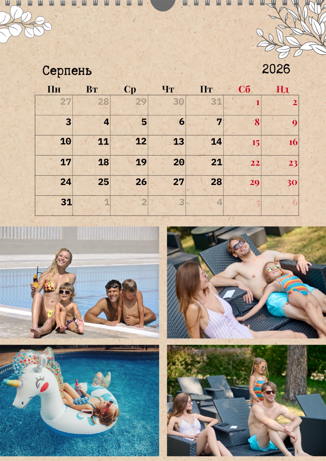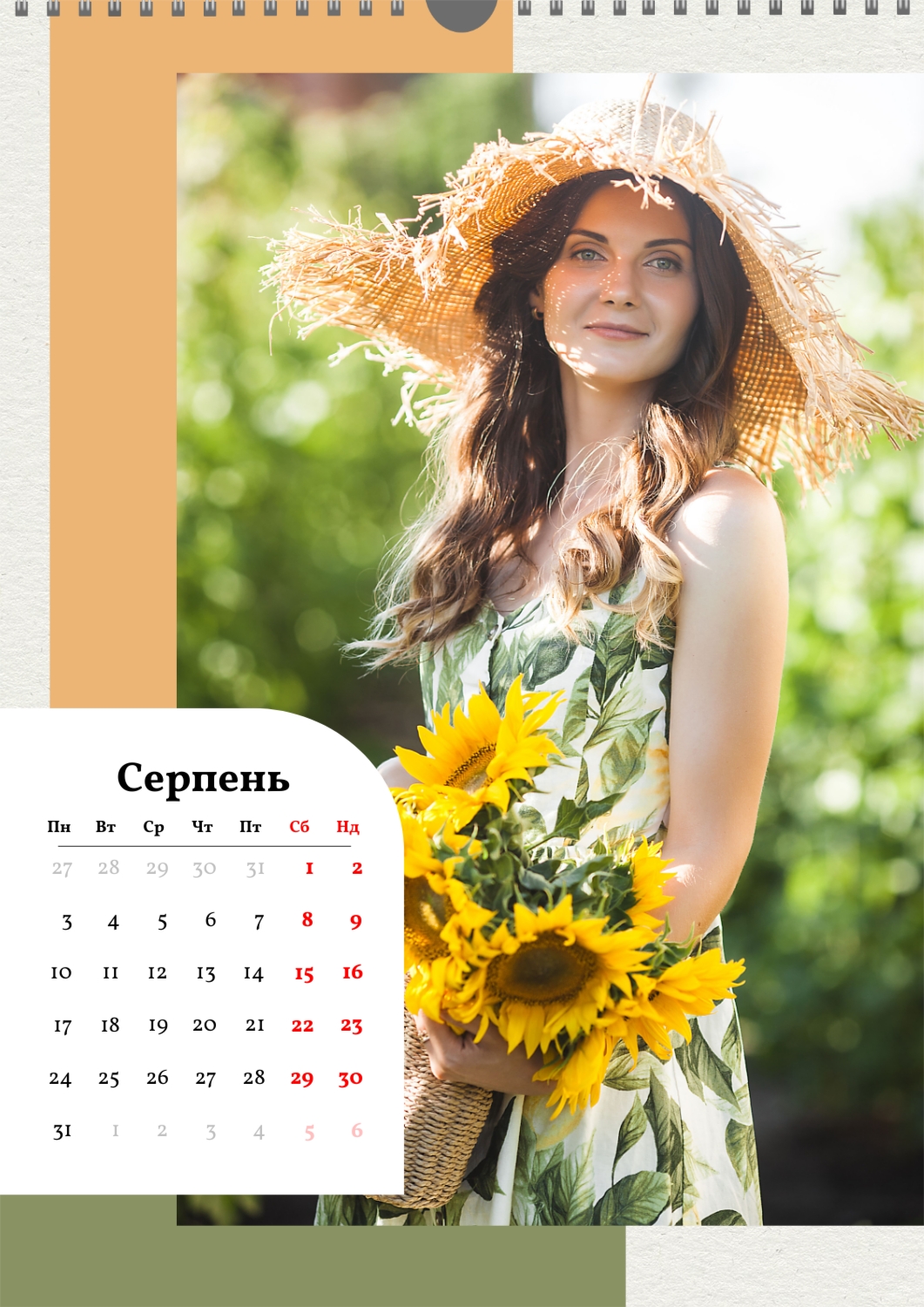 Наш настінний календар "кращі спогади" в нашому онлайн-конструкторі надає унікальні можливості для творчості та персоналізації. Весь дизайн шаблону спрямований на підкреслення значущих подій і важливих дат, дозволяючи вам створити календар, який повністю відображає вашу індивідуальність. Спеціальні розділи шаблону надають простір для ваших фотографій, щоб ви могли зафіксувати найяскравіші моменти свого життя. Завдяки інтуїтивно зрозумілому редактору, ви зможете легко додавати, змінювати і переміщати зображення, щоб створити гармонійний композиційний баланс. Ви також маєте можливість регулювати яскравість, контрастність і насиченість фотографій, щоб кожен знімок виглядав так, як ви хочете. Параметри колірної схеми шаблону дозволяють вибрати ті відтінки, які відповідають вашому смаку та уподобанням. Це не тільки створює гармонійний дизайн, але й допомагає виділити ключові елементи вашого календаря. Таким чином, ваші найкращі моменти будуть не тільки збережені, але й виділені в цьому унікальному та персоналізованому вертикальному календарі.
