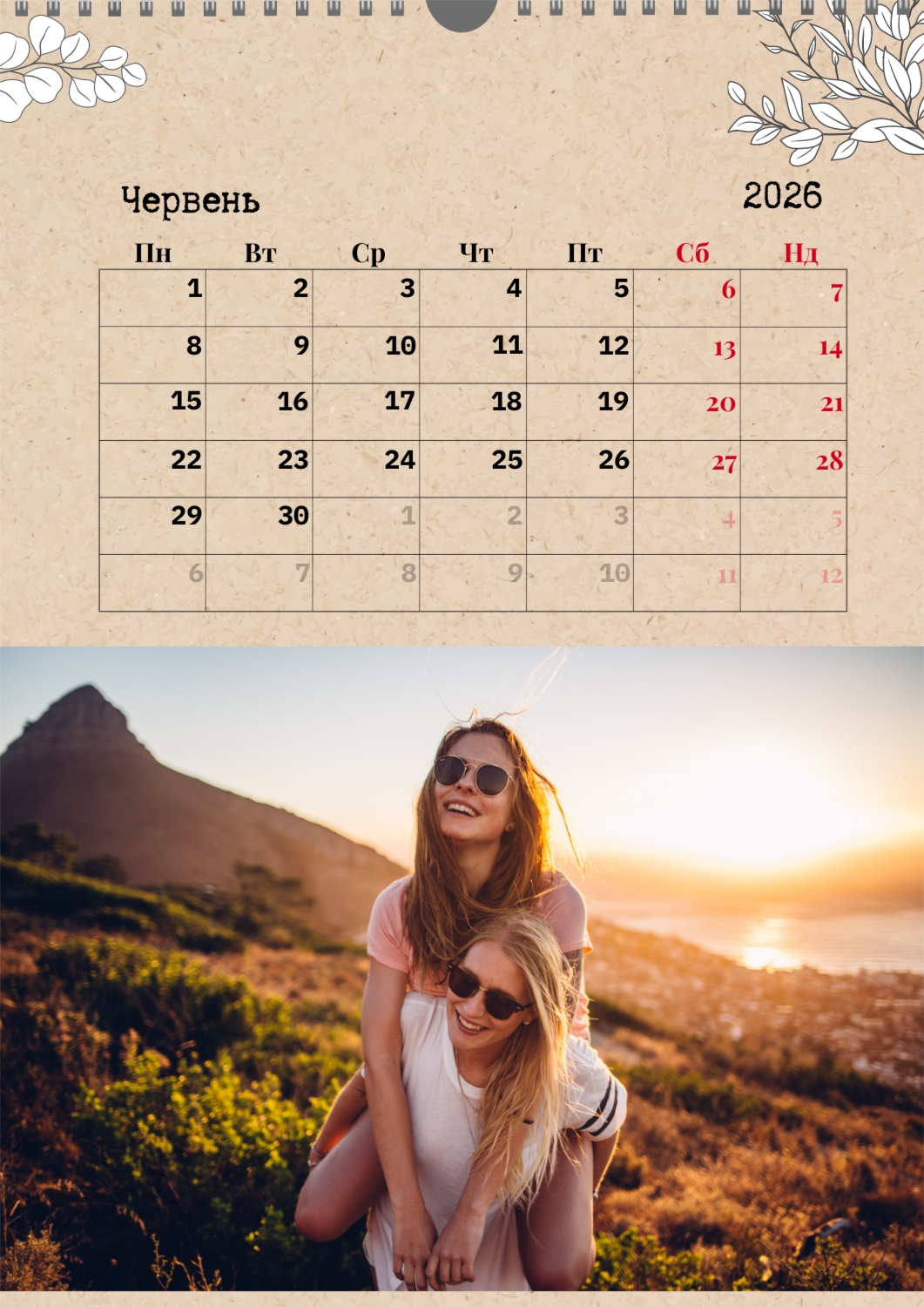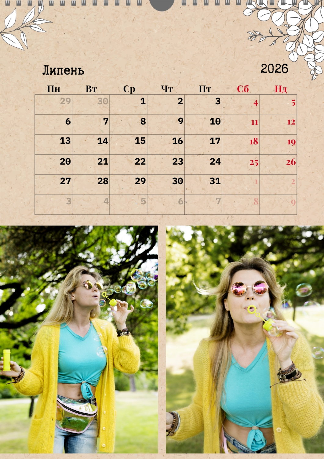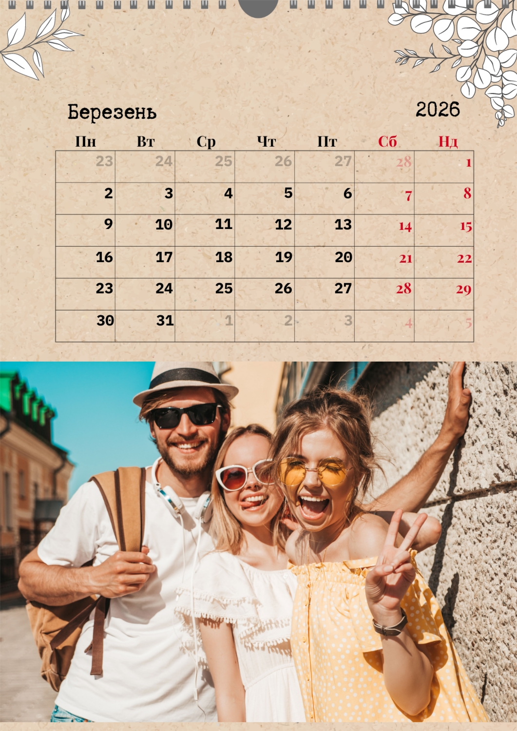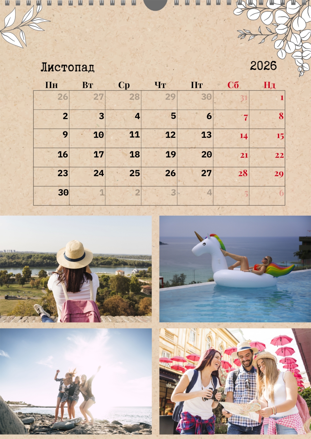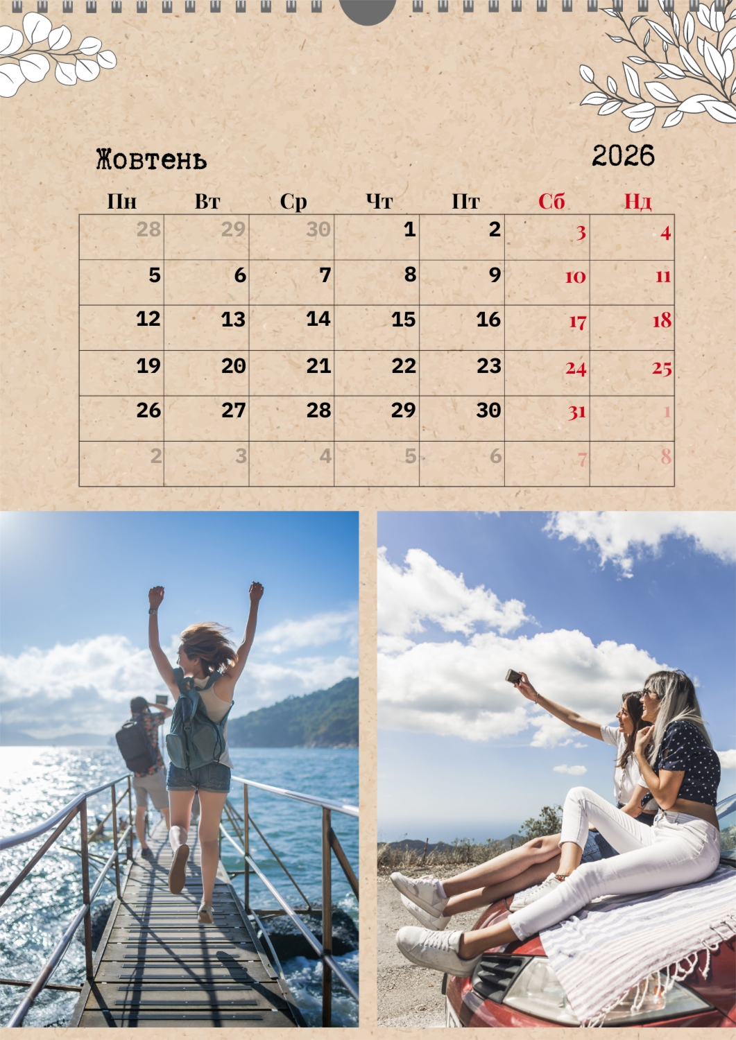 Наш настінний календар "кращі спогади" в нашому онлайн-конструкторі надає унікальні можливості для творчості та персоналізації. Весь дизайн шаблону спрямований на підкреслення значущих подій і важливих дат, дозволяючи вам створити календар, який повністю відображає вашу індивідуальність. Спеціальні розділи шаблону надають простір для ваших фотографій, щоб ви могли зафіксувати найяскравіші моменти свого життя. Завдяки інтуїтивно зрозумілому редактору, ви зможете легко додавати, змінювати і переміщати зображення, щоб створити гармонійний композиційний баланс. Ви також маєте можливість регулювати яскравість, контрастність і насиченість фотографій, щоб кожен знімок виглядав так, як ви хочете. Параметри колірної схеми шаблону дозволяють вибрати ті відтінки, які відповідають вашому смаку та уподобанням. Це не тільки створює гармонійний дизайн, але й допомагає виділити ключові елементи вашого календаря. Таким чином, ваші найкращі моменти будуть не тільки збережені, але й виділені в цьому унікальному та персоналізованому вертикальному календарі.