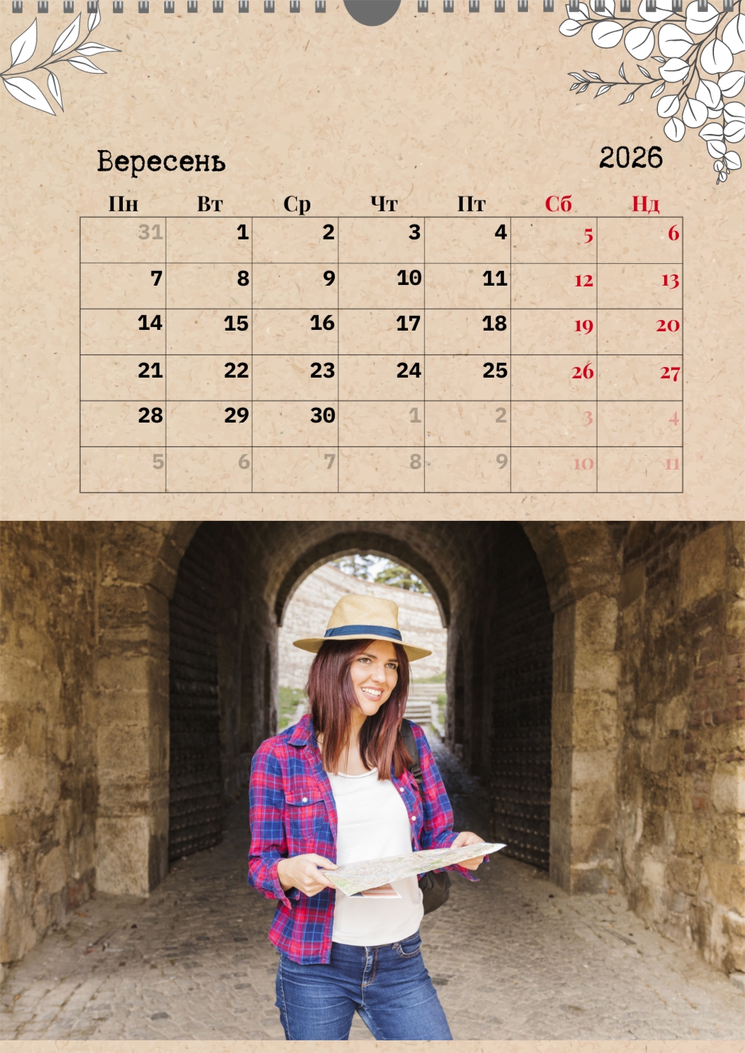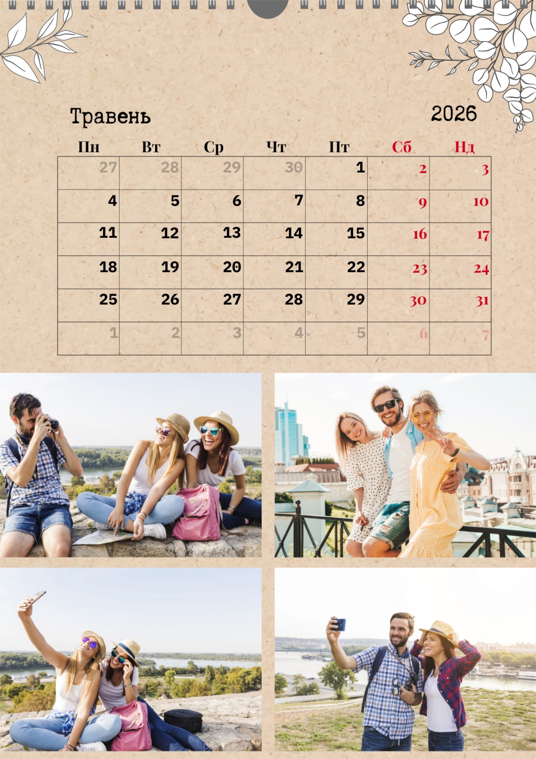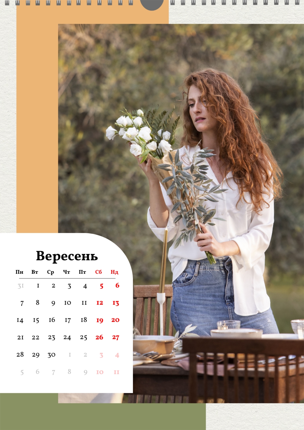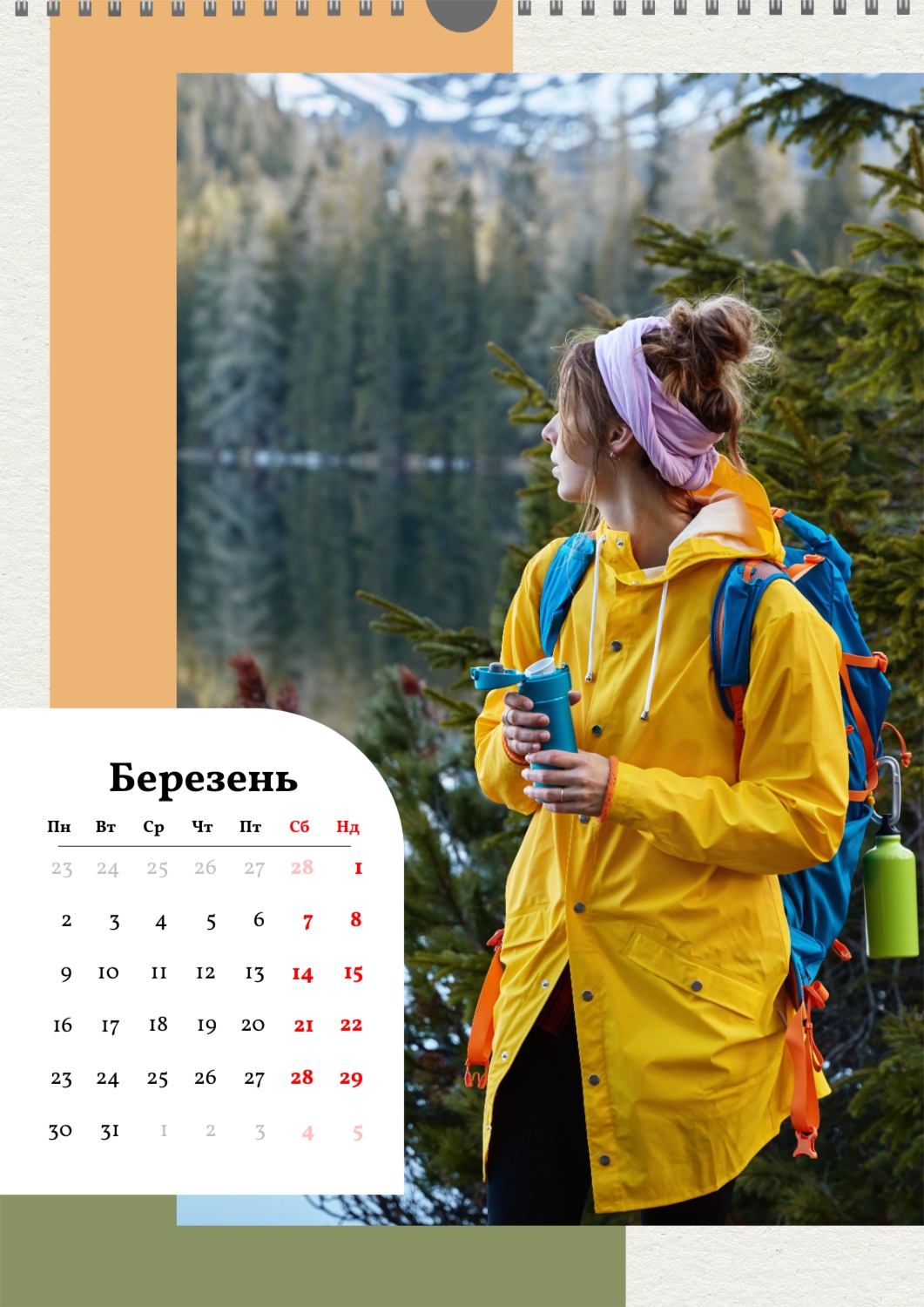 Наш настінний календар "кращі спогади" в нашому онлайн-конструкторі надає унікальні можливості для творчості та персоналізації. Весь дизайн шаблону спрямований на підкреслення значущих подій і важливих дат, дозволяючи вам створити календар, який повністю відображає вашу індивідуальність. Спеціальні розділи шаблону надають простір для ваших фотографій, щоб ви могли зафіксувати найяскравіші моменти свого життя. Завдяки інтуїтивно зрозумілому редактору, ви зможете легко додавати, змінювати і переміщати зображення, щоб створити гармонійний композиційний баланс. Ви також маєте можливість регулювати яскравість, контрастність і насиченість фотографій, щоб кожен знімок виглядав так, як ви хочете. Параметри колірної схеми шаблону дозволяють вибрати ті відтінки, які відповідають вашому смаку та уподобанням. Це не тільки створює гармонійний дизайн, але й допомагає виділити ключові елементи вашого календаря. Таким чином, ваші найкращі моменти будуть не тільки збережені, але й виділені в цьому унікальному та персоналізованому вертикальному календарі.