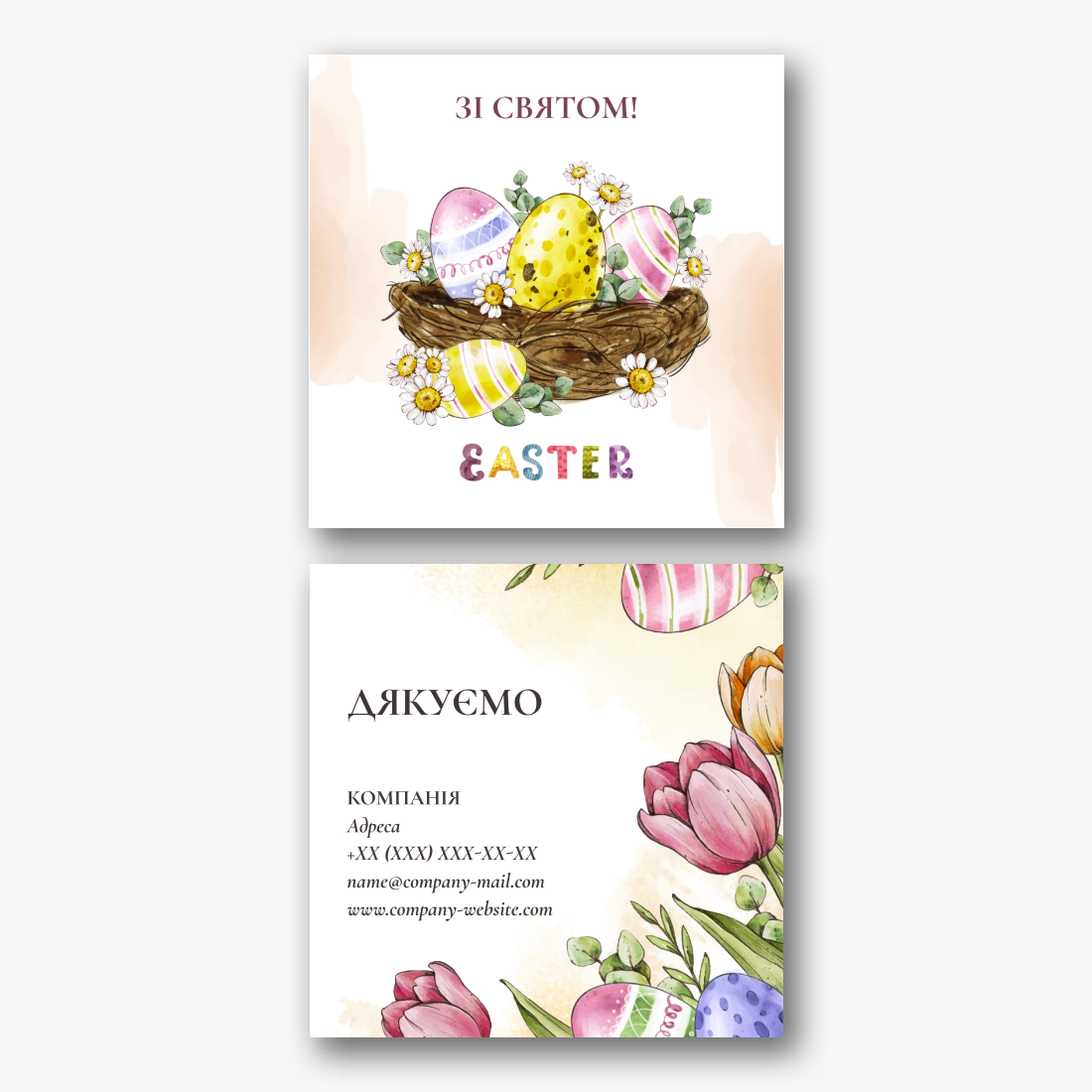 Готовий шаблон картки "Спасибі" з великоднім принтом — Це ідеальний спосіб висловити подяку в світле свято. Ніжні весняні відтінки, зображення прикрашених яєць, квітів і символів Великодня створюють теплу і святкову атмосферу. Такий дизайн особливо актуальний для кондитерів, пекарів, флористів, магазинів подарунків, а також для творчих майстерень, які організовують великодні заходи. Картку можна використовувати в упаковці солодощів, сувенірів або в якості доповнення до замовлення, підкреслюючи турботу про клієнтів. В онлайн-конструкторі цей шаблон легко піддається змінам. Можна редагувати текст, вибравши більш відповідний шрифт і колір, додати ім'я відправника або навіть персоналізоване звернення. Якщо хочеться зробити картку унікальною, можна замінити фон, змінити розташування декоративних елементів або додати логотип бренду. Завдяки зручному інтерфейсу редагування доступно кожному, навіть без навичок роботи з графічними програмами. Створити власну пасхальну картку "спасибі" в нашому онлайн-конструкторі — це швидкий і зручний спосіб підкреслити увагу до деталей і залишити приємне враження у одержувача. Такий жест робить подяку особливою, а саму картку — стильним і незабутнім елементом святкового оформлення.