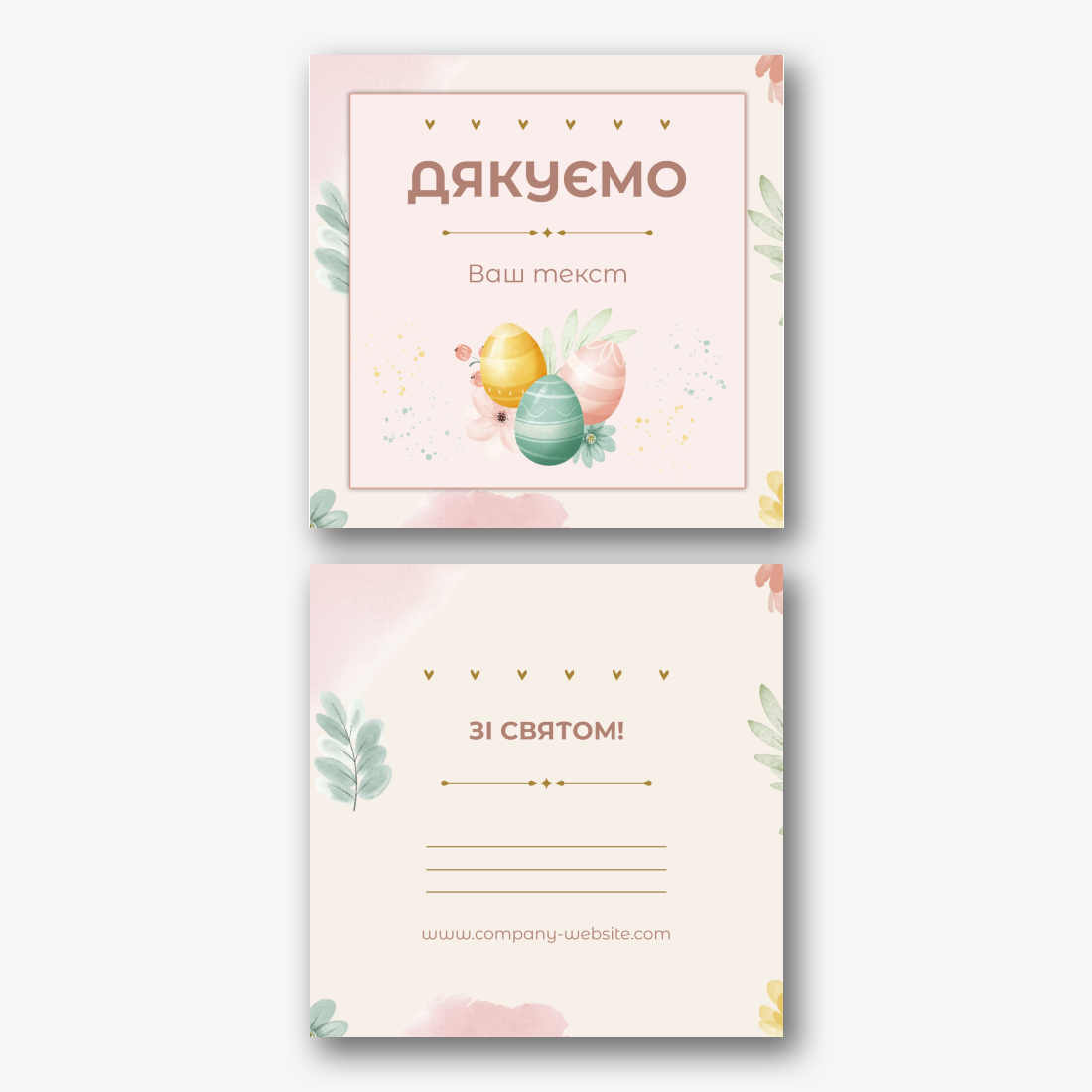 Готовий шаблон картки "Спасибі" з великоднім принтом, прикрашеним яскравими крашанками, – це прекрасний спосіб висловити подяку в святковій атмосфері. Ніжні весняні кольори, витончені візерунки і символіка Великодня роблять цей дизайн теплим і радісним. Такий шаблон відмінно підійде для пекарів, кондитерів, власників сімейних кафе, магазинів зі святковими товарами, а також для майстрів хендмейду, що створюють тематичні подарунки. Його можна використовувати як доповнення до замовлення, листівку для клієнтів або просто знак уваги для близьких. В онлайн-конструкторі цей шаблон легко редагується, дозволяючи адаптувати його під будь-яке завдання. Можна змінити текст подяки, додавши ім'я одержувача або індивідуальне побажання. Шрифт, колір букв і їх розташування можна налаштувати під свій стиль. При необхідності легко замінити фон, додати логотип компанії або контакти, щоб картка стала фірмовим елементом бренду. Також можна вставити декоративні деталі-квіткові акценти, візерунки або інші великодні символи, що підкреслюють святковий настрій. Створюючи картку в онлайн-конструкторі, не потрібно володіти спеціальними навичками-інтерфейс інтуїтивно зрозумілий, а редагування займає всього кілька хвилин. Це дає можливість кожному зробити унікальну пасхальну картку "спасибі", яка стане красивим і значущим доповненням до подарунка або замовлення.