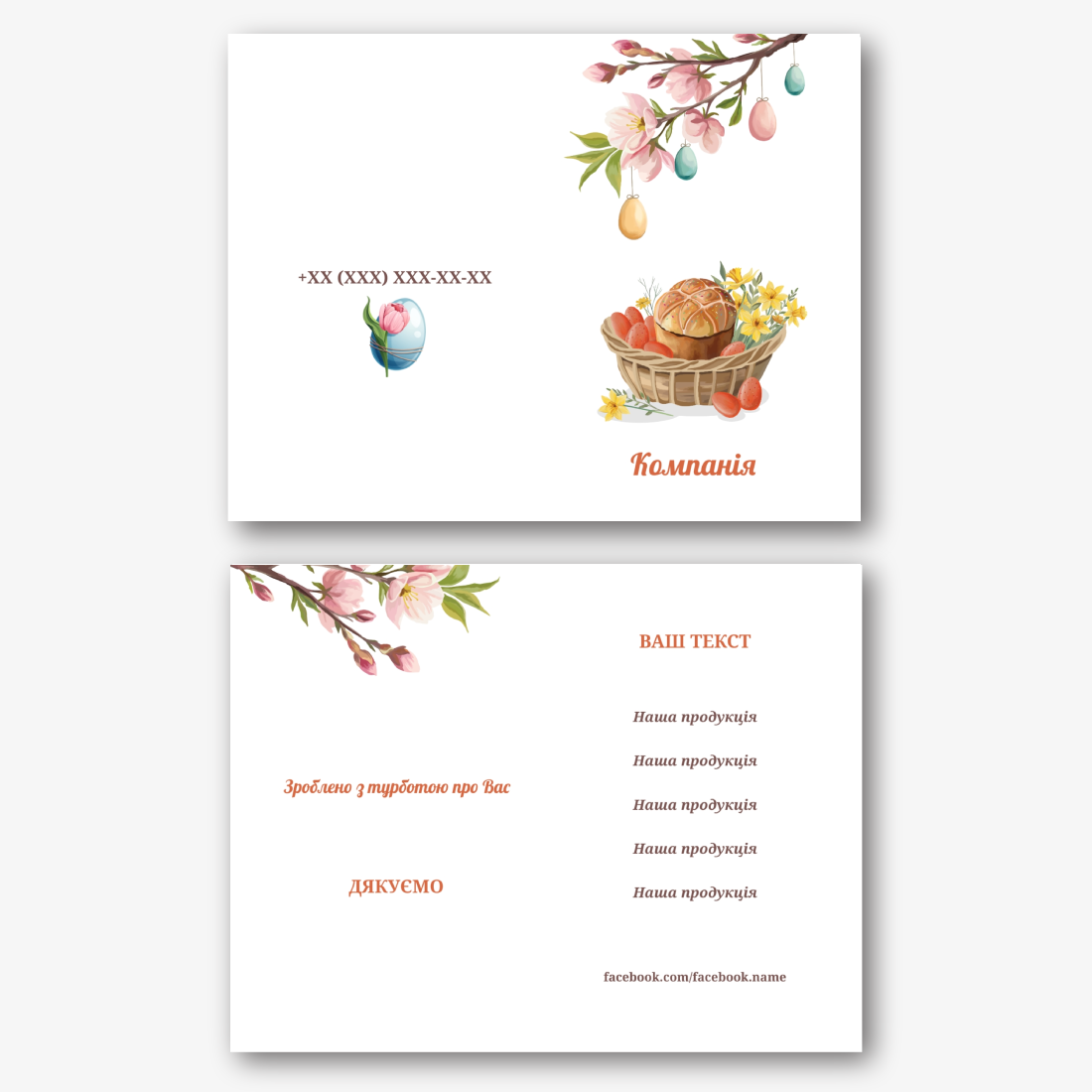 Готовий шаблон пасхальної бирки-це ідеальне рішення для оформлення святкових подарунків, упаковки продукції або декору до світлого свята. Така бирка відмінно підійде пекарям і кондитерам для прикраси упаковки великодньої випічки, магазинам зі святковими сувенірами, а також рукодільникам, що створює унікальні вироби до свята. В онлайн-конструкторі цей шаблон легко піддається редагуванню, дозволяючи створити абсолютно унікальний дизайн. Можна змінити текст, вибравши інший шрифт і колір, додати персональні привітання або навіть логотип, якщо бирка використовується для оформлення товарів. Доступна заміна фонових елементів і прикрас – можна додати більше квіткових візерунків або, навпаки, зробити композицію мінімалістичною. Розмір бирки також легко коригується, щоб вона ідеально вписалася в упаковку або святкову композицію.