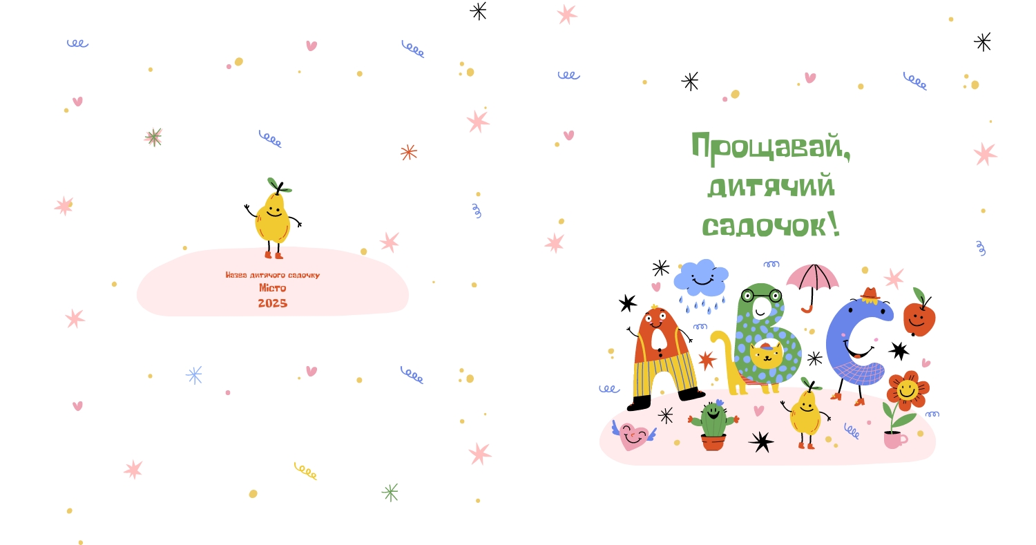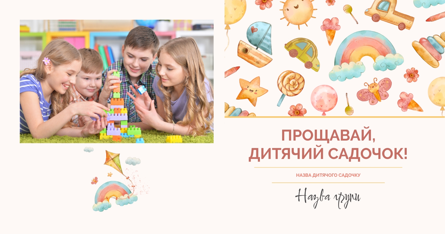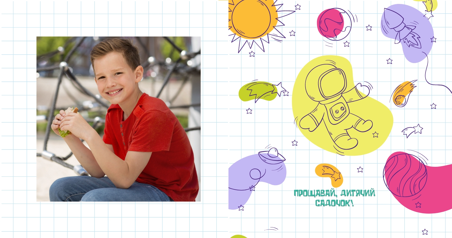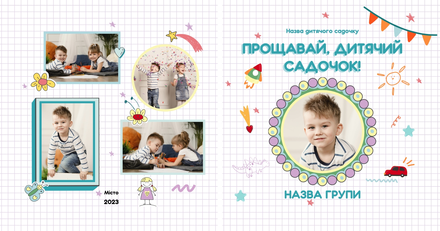 Готовий шаблон випускної квадратної віньєтки для дитячого садка-це яскравий і зворушливий макет, створений спеціально для того, щоб зберегти важливі моменти перших кроків у житті маленьких випускників. Милі ілюстрації, добрі кольори і продумана композиція роблять цей шаблон особливо привабливим для оформлення дитячих спогадів. Він відмінно підійде для вихователів дитячих садків, співробітників дошкільних установ, приватних дитячих студій і фотографів, які спеціалізуються на дитячій зйомці і створенні альбомів. В онлайн-конструкторі цей шаблон можна легко адаптувати під будь-яку групу і будь-який захід. Ви можете замінити фотографії, відредагувати імена, вибрати шрифти, які найкраще відповідають стилю вашої групи, змінити колірну гамму або додати декоративні елементи — наприклад, малюнки, які діти зробили самі. Також можна вставити логотип садка або зворушливе прощальне вірш, що додасть віньєтці особливу емоційну глибину. Редагування відбувається в інтуїтивно зрозумілому інтерфейсі, де кожен елемент можна перемістити, масштабувати або видалити. Це дає повний контроль над процесом створення макета-від вибору фону до розстановки фотографій. Навіть без дизайнерського досвіду ви зможете створити професійну віньєтку, яка буде радувати батьків, вихователів і самих дітей довгі роки.
