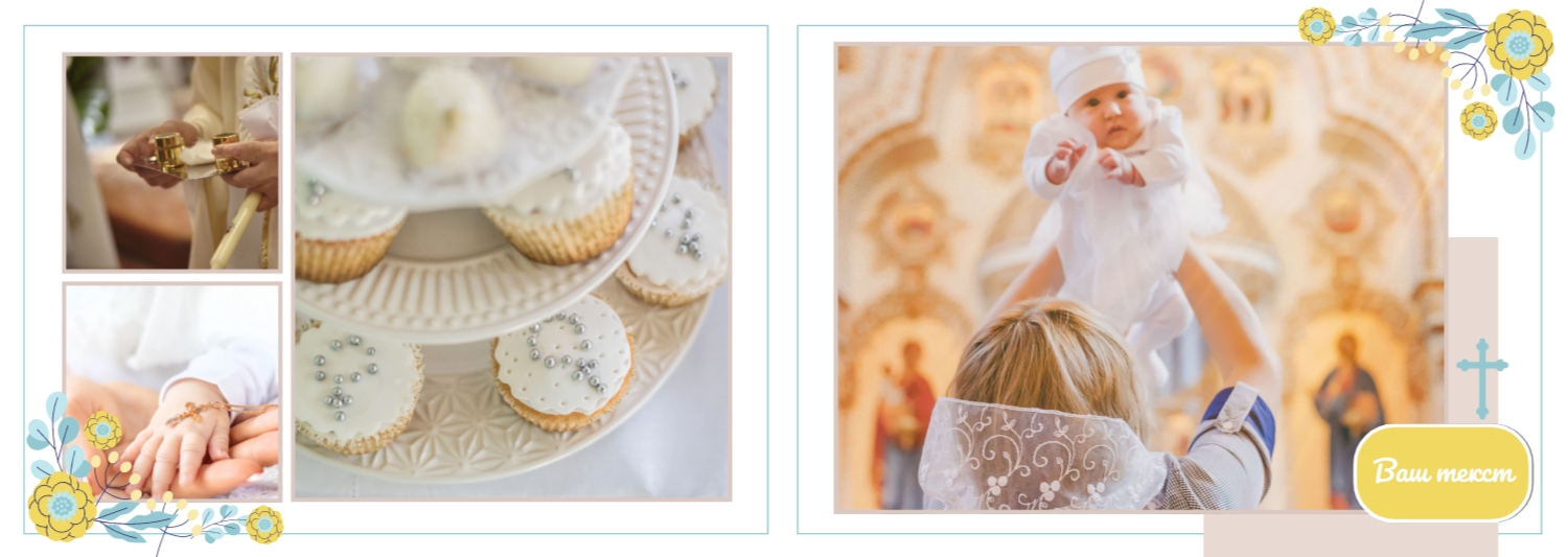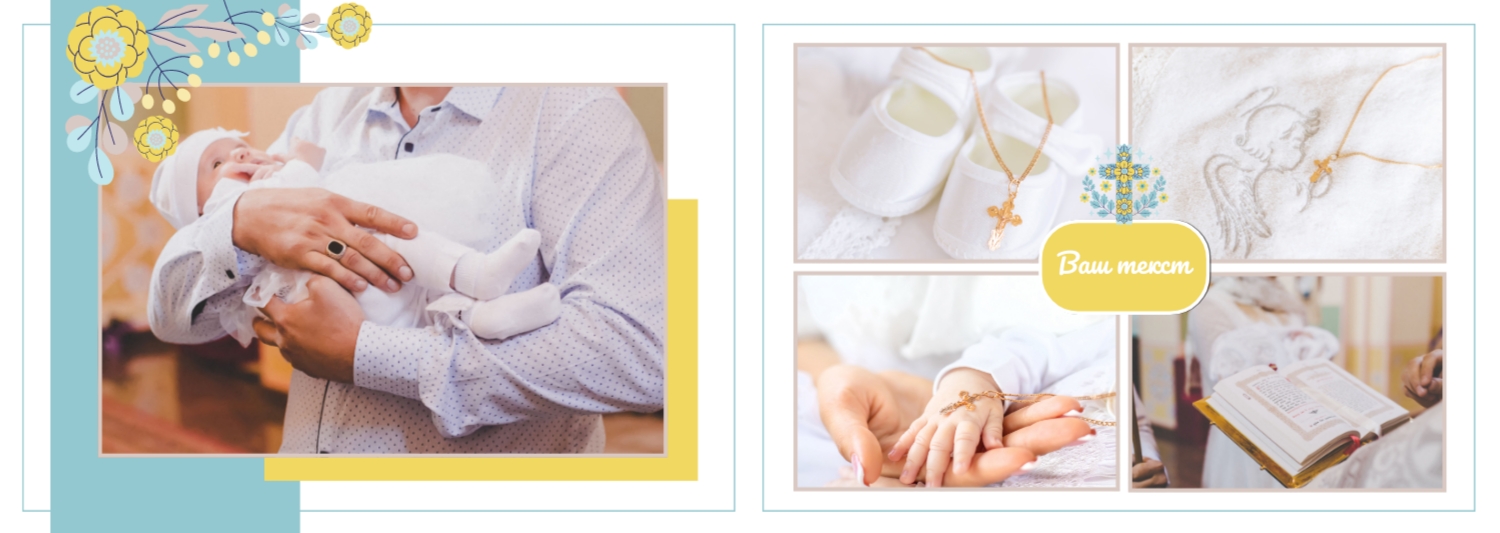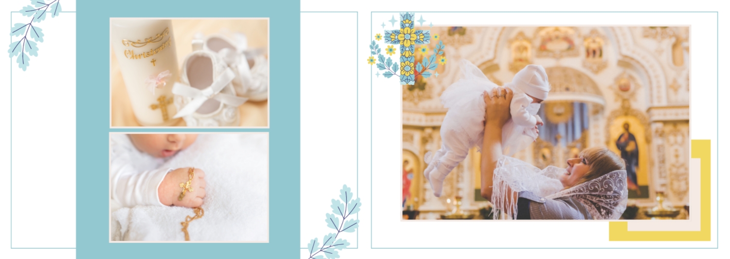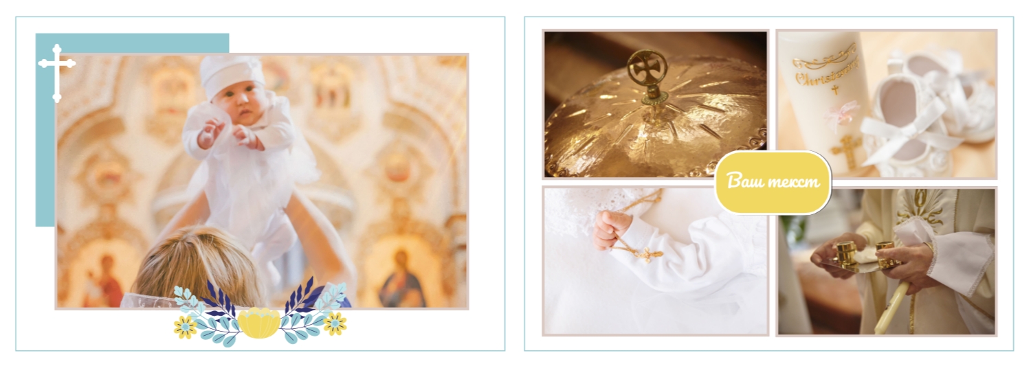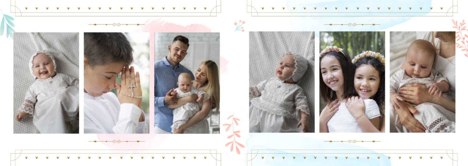 Готовий шаблон горизонтальної фотокниги в твердій обкладинці "Таїнство Хрещення" для дівчинки — це ніжний і зворушливий дизайн, який допоможе зберегти в пам'яті один з найважливіших днів у житті дитини. В оформленні переважають світлі, пастельні відтінки, витончені візерунки і символічні елементи, такі як ангели, свічки і хрестики, що створюють атмосферу духовності і урочистості. Такий шаблон ідеально підійде не тільки для батьків, які бажають відобразити моменти Хрещення своєї дочки, але і для професійних фотографів, які працюють з сімейними та церковними фотосесіями, а також для церковних друкарень і майстерень, що займаються оформленням пам'ятних альбомів. В онлайн-конструкторі цей шаблон можна легко адаптувати під особисті переваги. Кожна сторінка редагується: можна змінити розташування фотографій, додати нові знімки або прибрати непотрібні елементи. Тексти, підписи і вірші також піддаються налаштуванню — можна вибрати інший шрифт, змінити розмір букв або підібрати відтінки, які краще поєднуються з обраними фотографіями. Крім того, можна вставити імена хрещених батьків, дату і місце проведення таїнства, що додасть фотокнизі унікальність і зробить її по-справжньому персональної.
