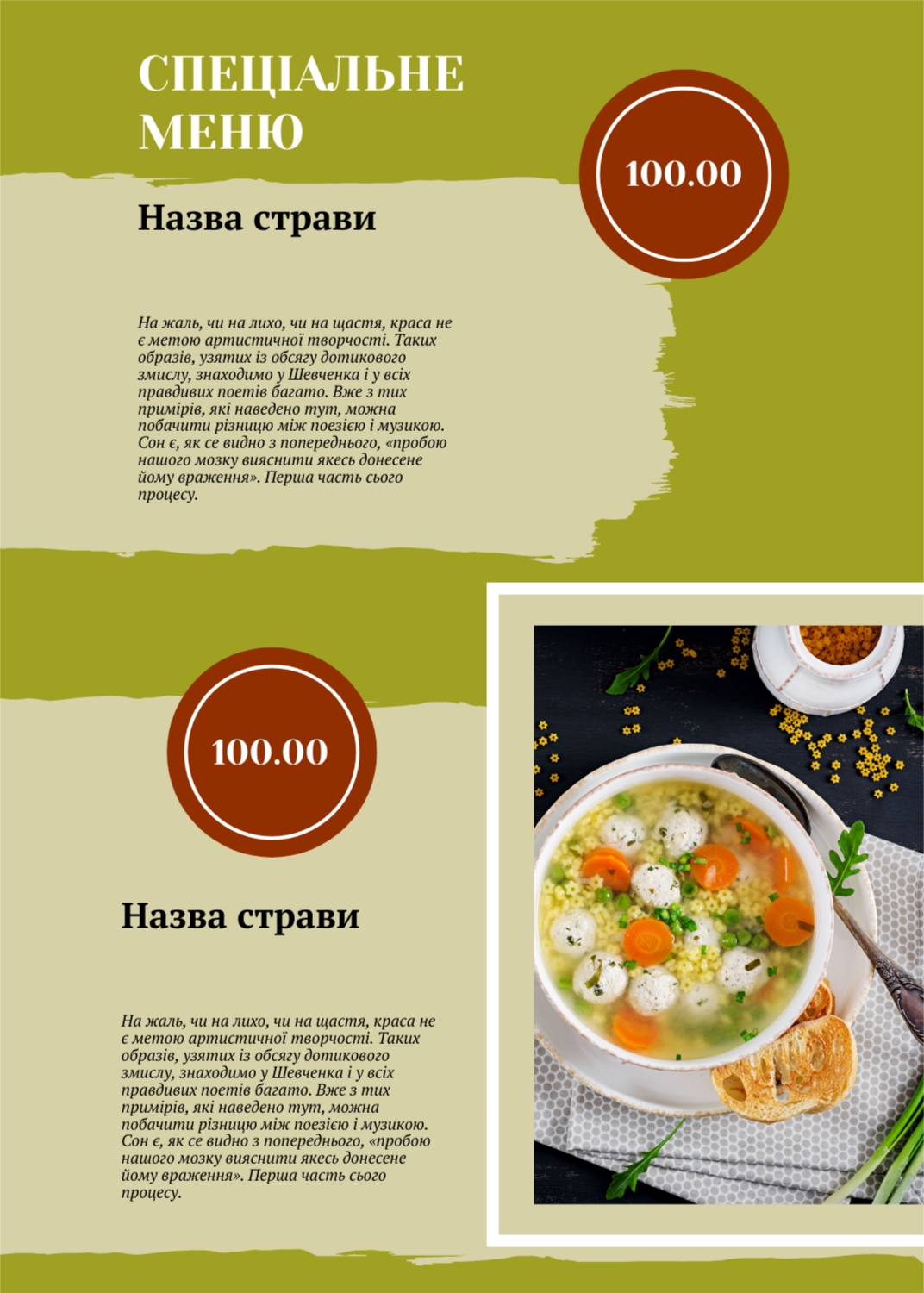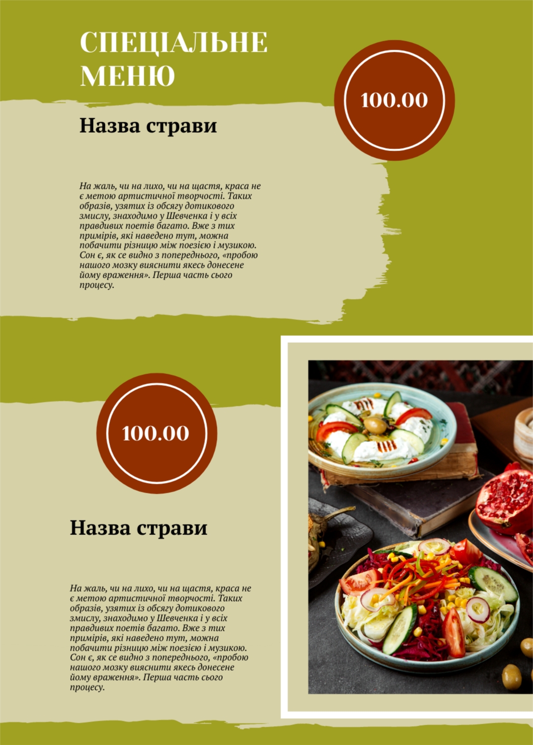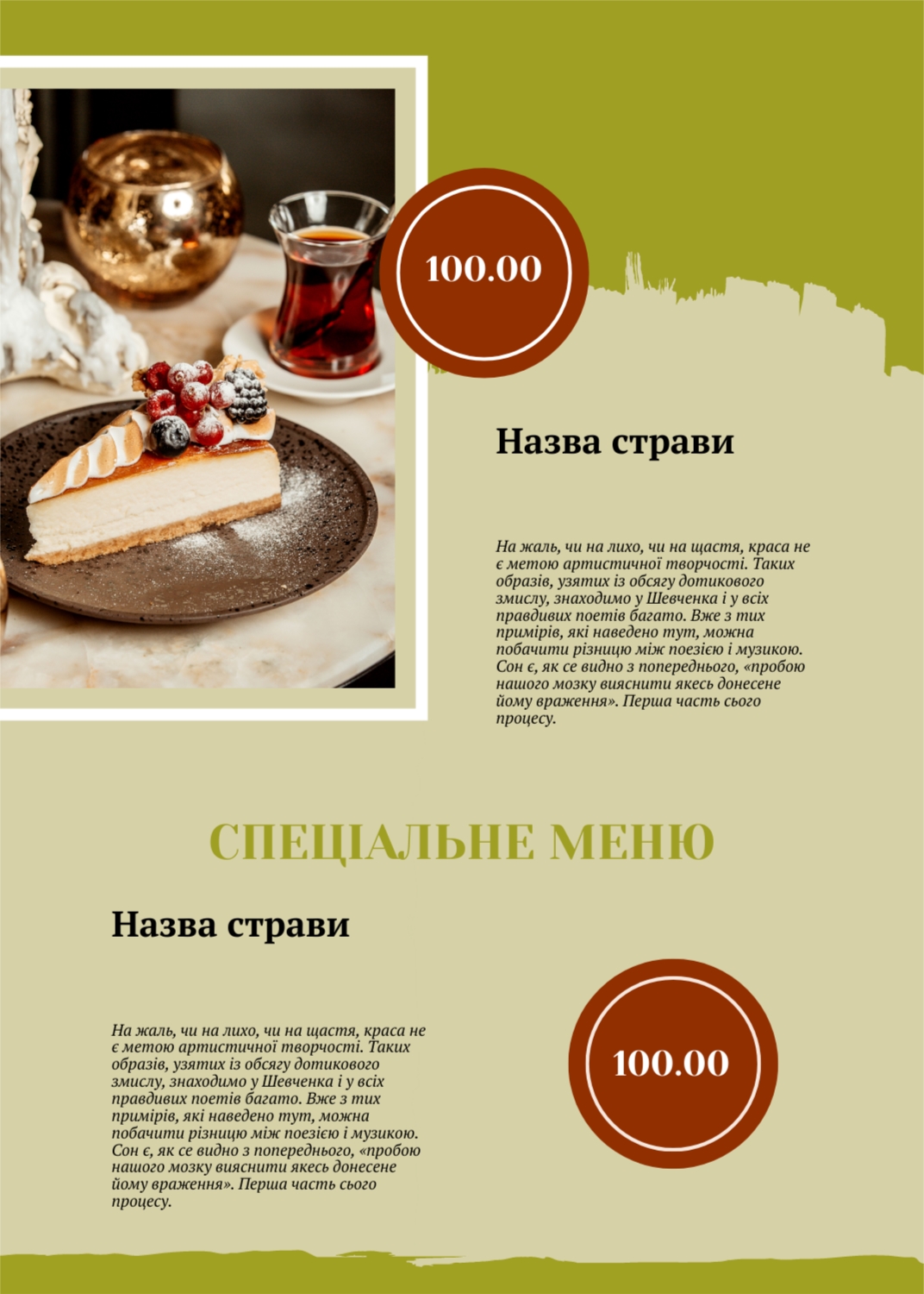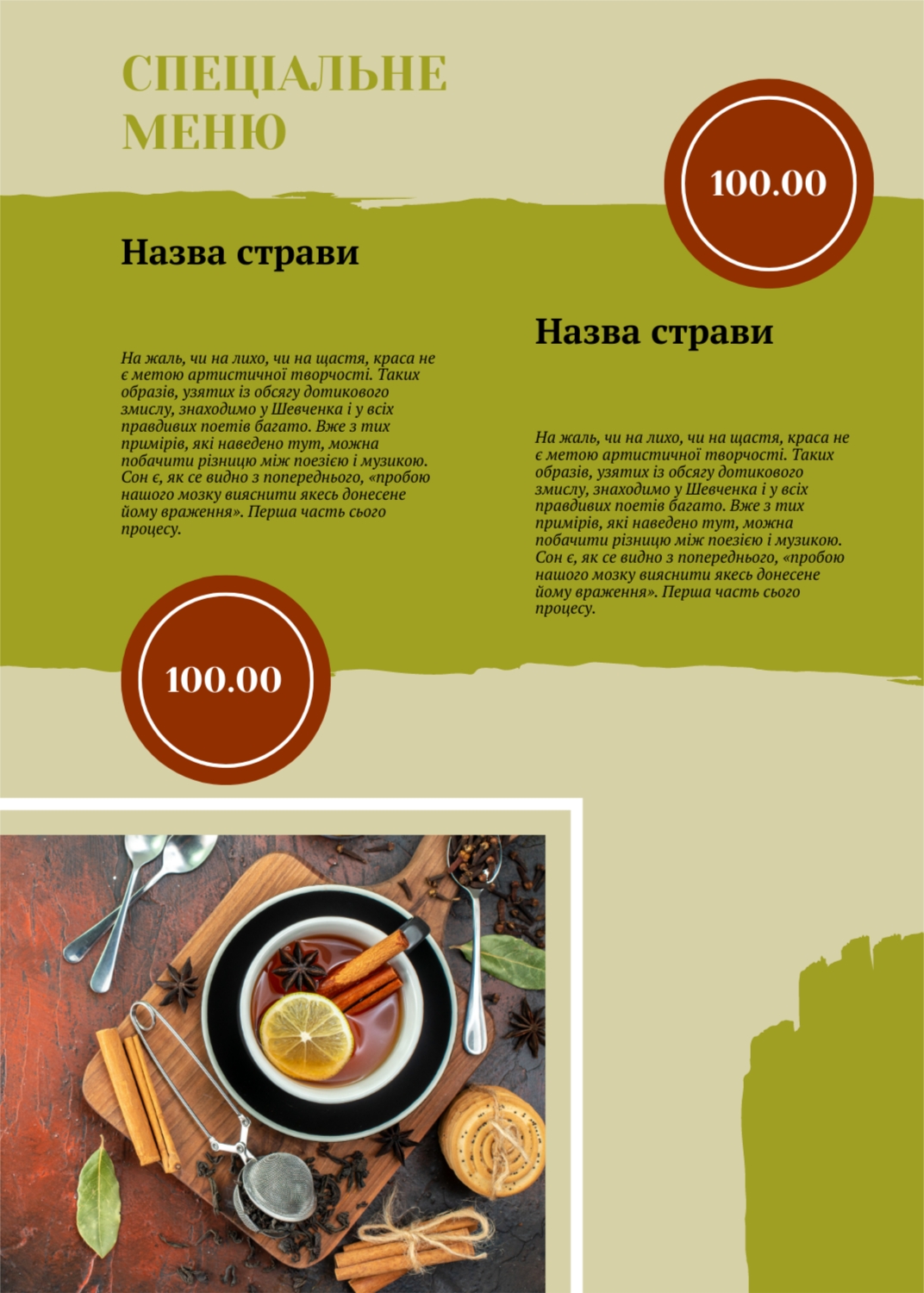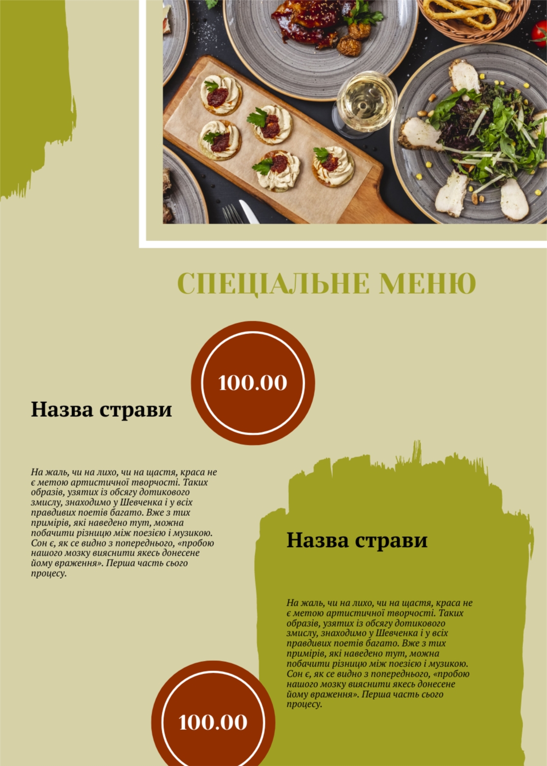 Готовий шаблон меню ресторану-це стильне і функціональне рішення, яке відмінно підійде для кафе, ресторанів, барів, кейтерингових компаній та інших закладів громадського харчування. Такий шаблон розроблений з урахуванням зручності сприйняття інформації гостями і допомагає підкреслити унікальну атмосферу закладу. У дизайні можна знайти продумане розташування розділів зі стравами і напоями, а також гармонійне поєднання кольорів і шрифтів, які роблять меню не тільки інформативним, але і привабливим. В онлайн-конструкторі цей шаблон легко піддається повному налаштуванню і редагуванню, що дозволяє створювати по-справжньому унікальне меню. Ви можете замінити Тексти, додавати або видаляти страви, змінювати ціни, коригувати опис і акценти відповідно до особливостей вашого бізнесу. Крім того, доступна заміна шрифтів і кольорової палітри, завдяки чому можна адаптувати меню під фірмовий стиль закладу. Можна легко додати логотип, фотографії страв або будь-які графічні елементи, які зроблять меню більш живим і персоналізованим. Інтуїтивно зрозумілий інтерфейс конструктора дозволяє вносити зміни швидко і без спеціальних навичок, що ідеально підходить для ресторанних менеджерів, маркетологів і власників бізнесу, які бажають самостійно контролювати візуальну складову меню. Це робить процес створення меню доступним, зручним і творчим, дозволяючи не тільки заощадити час і гроші, але і підкреслити індивідуальність закладу за допомогою стильного і сучасного оформлення.