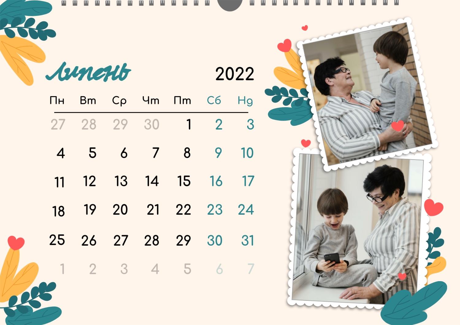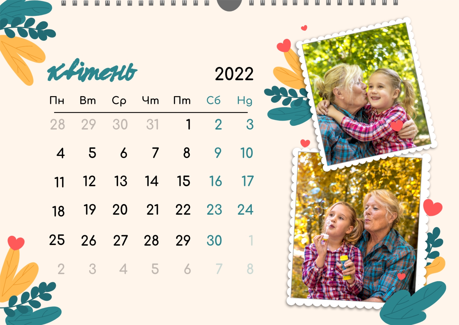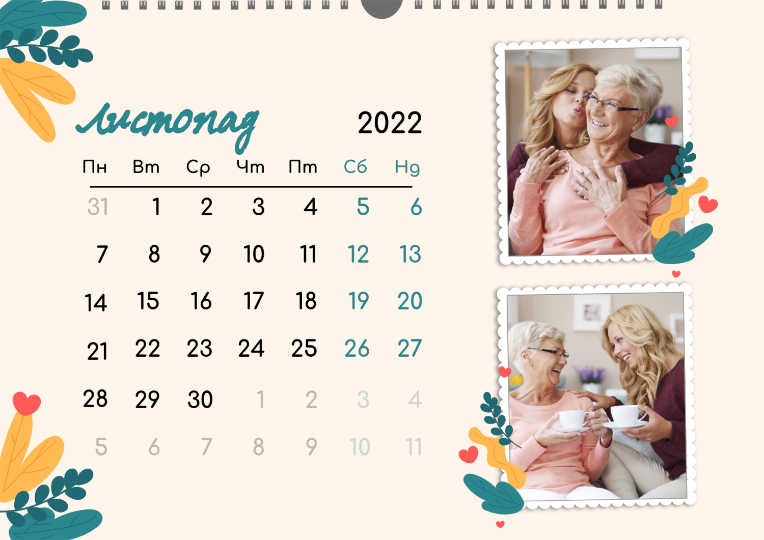 Готовий шаблон настінного горизонтального календаря для коханої мами-це зворушлива і красива основа для створення персонального подарунка, який наповнений теплом і турботою. В онлайн-конструкторі шаблон легко перетворюється в унікальний продукт. Можна вставити сімейні фотографії, вибрати улюблені моменти з життя, додати написи з теплими словами, змінити кольори і шрифти під індивідуальні переваги. Кожен місяць можна оформити в своєму стилі, вставляючи фото або побажання, пов'язані з певним часом року або важливими сімейними датами. Також доступно додавання власних свят і заміток прямо на календарну сітку. Конструктор дозволяє працювати інтуїтивно, навіть тим, хто вперше створює дизайн з нуля. Це дає повну свободу творчості і можливість створити по-справжньому унікальний настінний календар, який буде радувати маму кожен день протягом року.