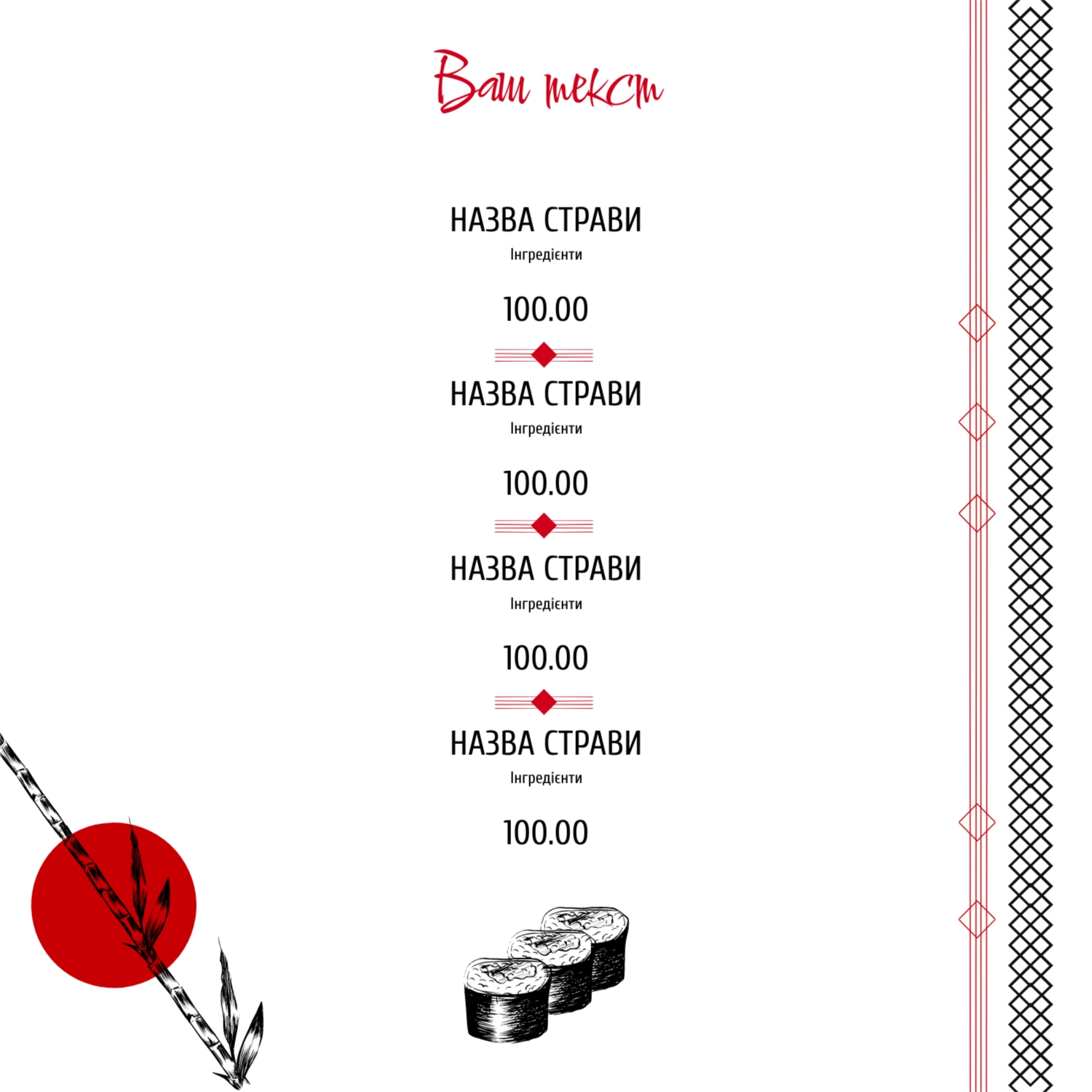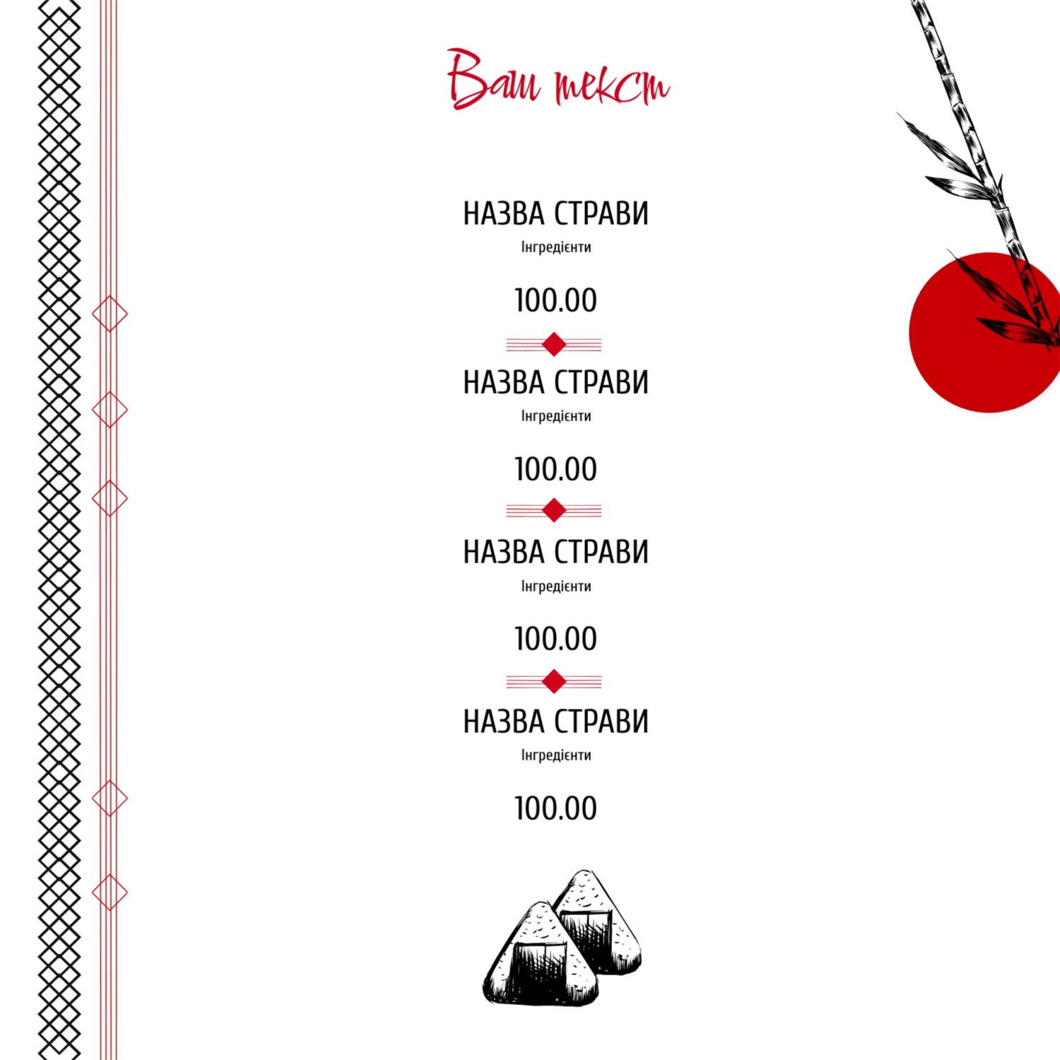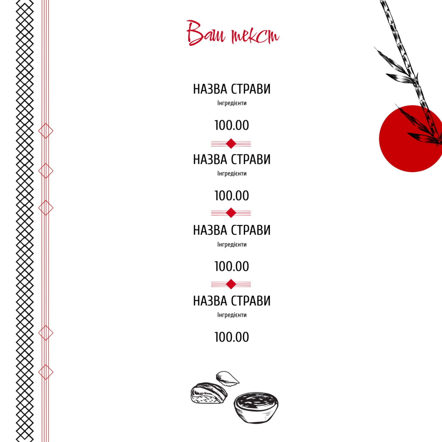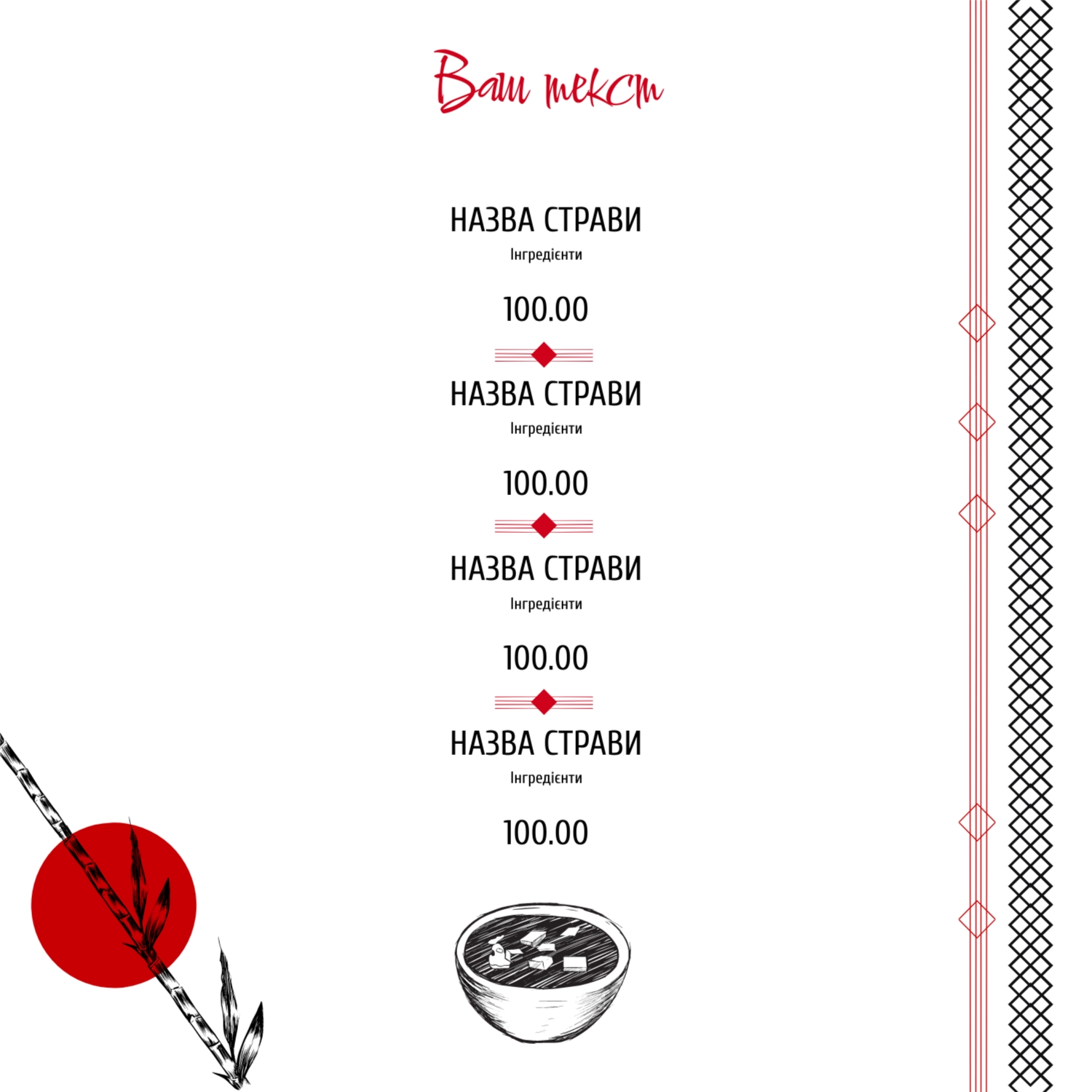 Готовий шаблон квадратного меню ресторану-це зручне і стильне рішення для закладів громадського харчування, які прагнуть створити професійне і запам'ятовується оформлення своєї пропозиції. Дизайн шаблону продуманий до дрібниць: чітка структура, гармонійні шрифти і акценти на головних стравах роблять його універсальним для ресторанів, кафе, барів, пекарень і кав'ярень. Він підійде як для гастрономічних закладів з вишуканим меню, так і для невеликих точок швидкого харчування або авторських кухонь. Особливість цього шаблону - в його повної настроюваності через онлайн-конструктор. Користувач може змінити кольори фону, замінити декоративні елементи, Додати фотографії страв, скорегувати розташування блоків і тексту. Назви страв, описи і ціни легко редагуються, при цьому шрифт можна вибрати під стиль закладу — класичний, мінімалістичний або з акцентом на оригінальність. Можливість завантажити логотип і контактні дані робить макет повноцінним фірмовим носієм.