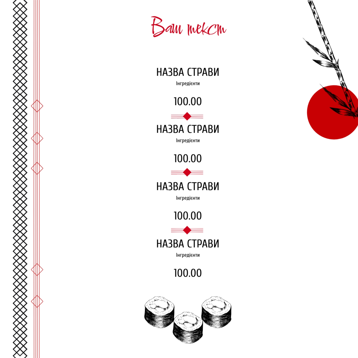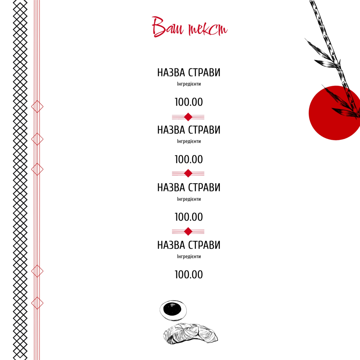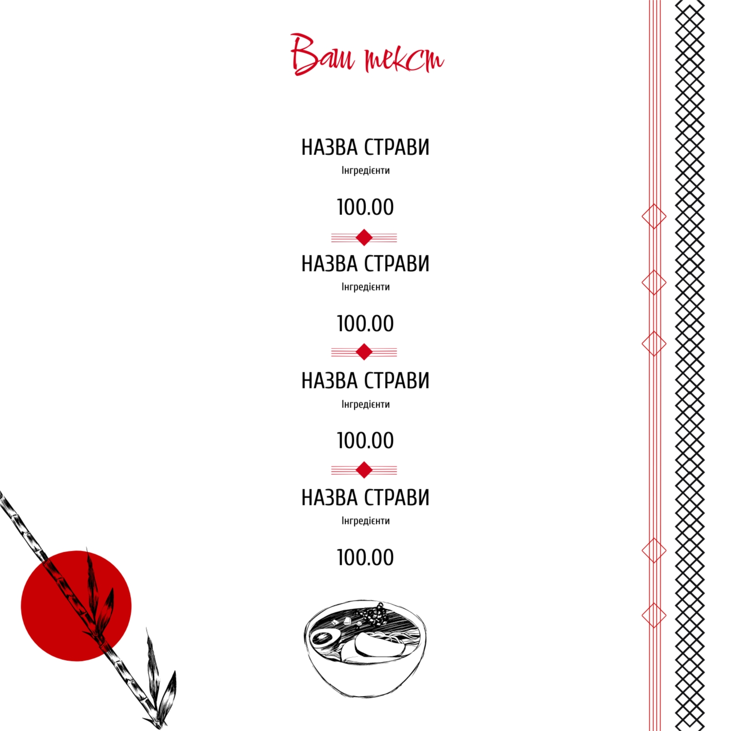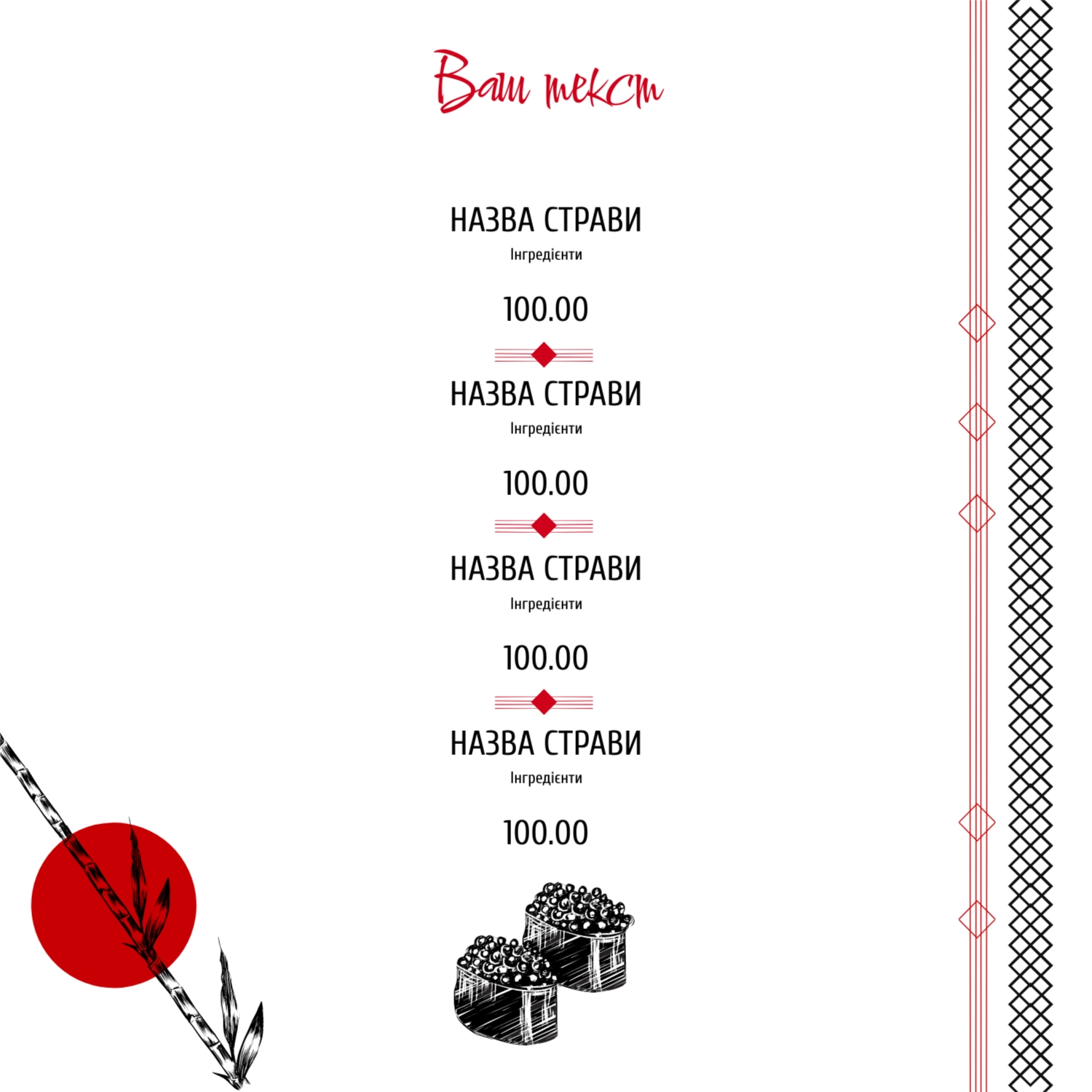 Готовий шаблон квадратного меню ресторану-це зручне і стильне рішення для закладів громадського харчування, які прагнуть створити професійне і запам'ятовується оформлення своєї пропозиції. Дизайн шаблону продуманий до дрібниць: чітка структура, гармонійні шрифти і акценти на головних стравах роблять його універсальним для ресторанів, кафе, барів, пекарень і кав'ярень. Він підійде як для гастрономічних закладів з вишуканим меню, так і для невеликих точок швидкого харчування або авторських кухонь. Особливість цього шаблону - в його повної настроюваності через онлайн-конструктор. Користувач може змінити кольори фону, замінити декоративні елементи, Додати фотографії страв, скорегувати розташування блоків і тексту. Назви страв, описи і ціни легко редагуються, при цьому шрифт можна вибрати під стиль закладу — класичний, мінімалістичний або з акцентом на оригінальність. Можливість завантажити логотип і контактні дані робить макет повноцінним фірмовим носієм.