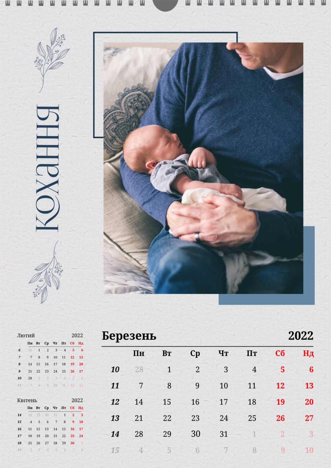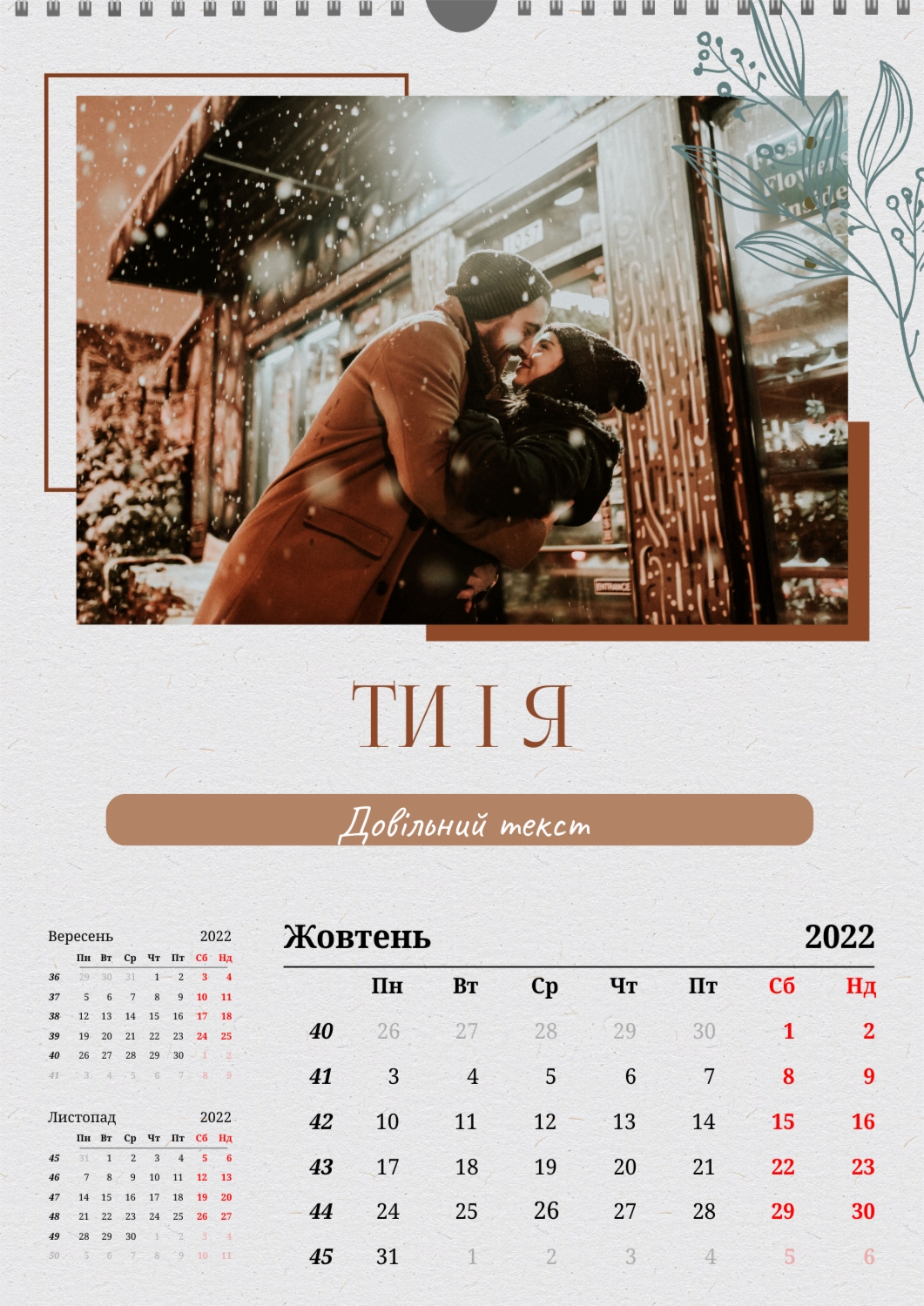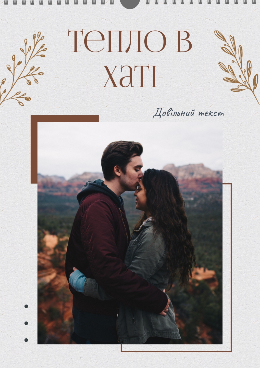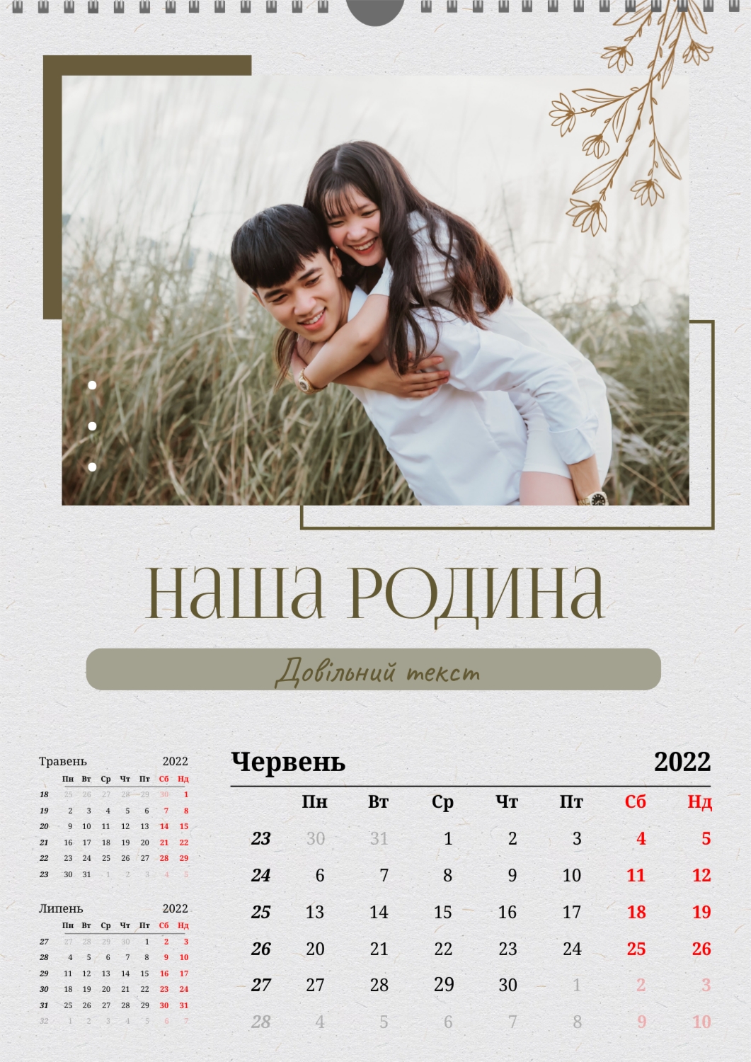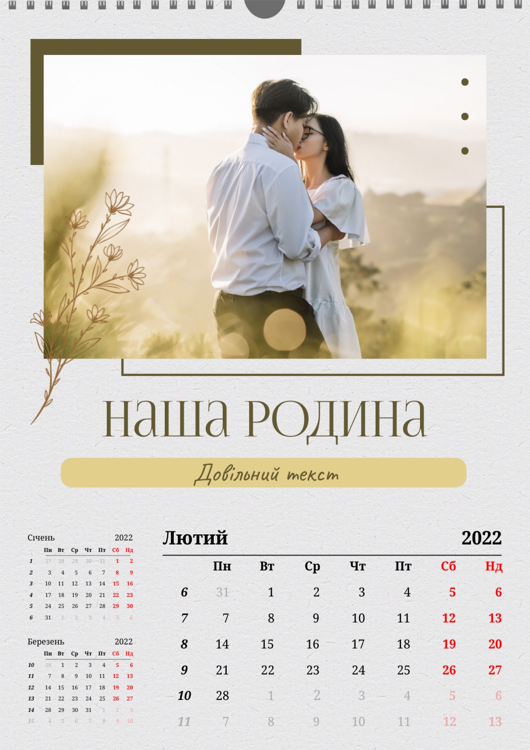Готовий шаблон українського календаря «Наша сім'я» — це теплий та душевний варіант оформлення, який особливо підійде для тих, хто цінує сімейні традиції та хоче зберегти важливі моменти у гарному та практичному вигляді. Його дизайн наповнений затишком та національним колоритом, що робить календар відмінним рішенням не тільки для домашнього використання, а й для професіоналів, що працюють у сфері сімейної фотографії, приватних студій, організаторів свят, педагогів початкової школи та психологів, які ведуть сімейні практики. Ключова особливість цього шаблону - гнучкість та зручність редагування в онлайн-конструкторі. Кожен елемент можна адаптувати до себе: завантажити власні фотографії членів сім'ї, змінити написи, важливі дати і навіть стилістику шрифтів. За необхідності можна додати власні свята, сімейні події, дні народження та пам'ятні дати – календар стає не просто корисним аксесуаром, а справжньою сімейною хронікою. Шаблон легко налаштовується завдяки простому та інтуїтивному інтерфейсу конструктора. Можна змінити колірну гаму, замінити фонове зображення або прикрасити сторінки додатковими елементами – від декоративних рамок до тематичних ікон. У результаті створюється унікальний календар, зроблений своїми руками, з душею і турботою, який радуватиме весь рік.