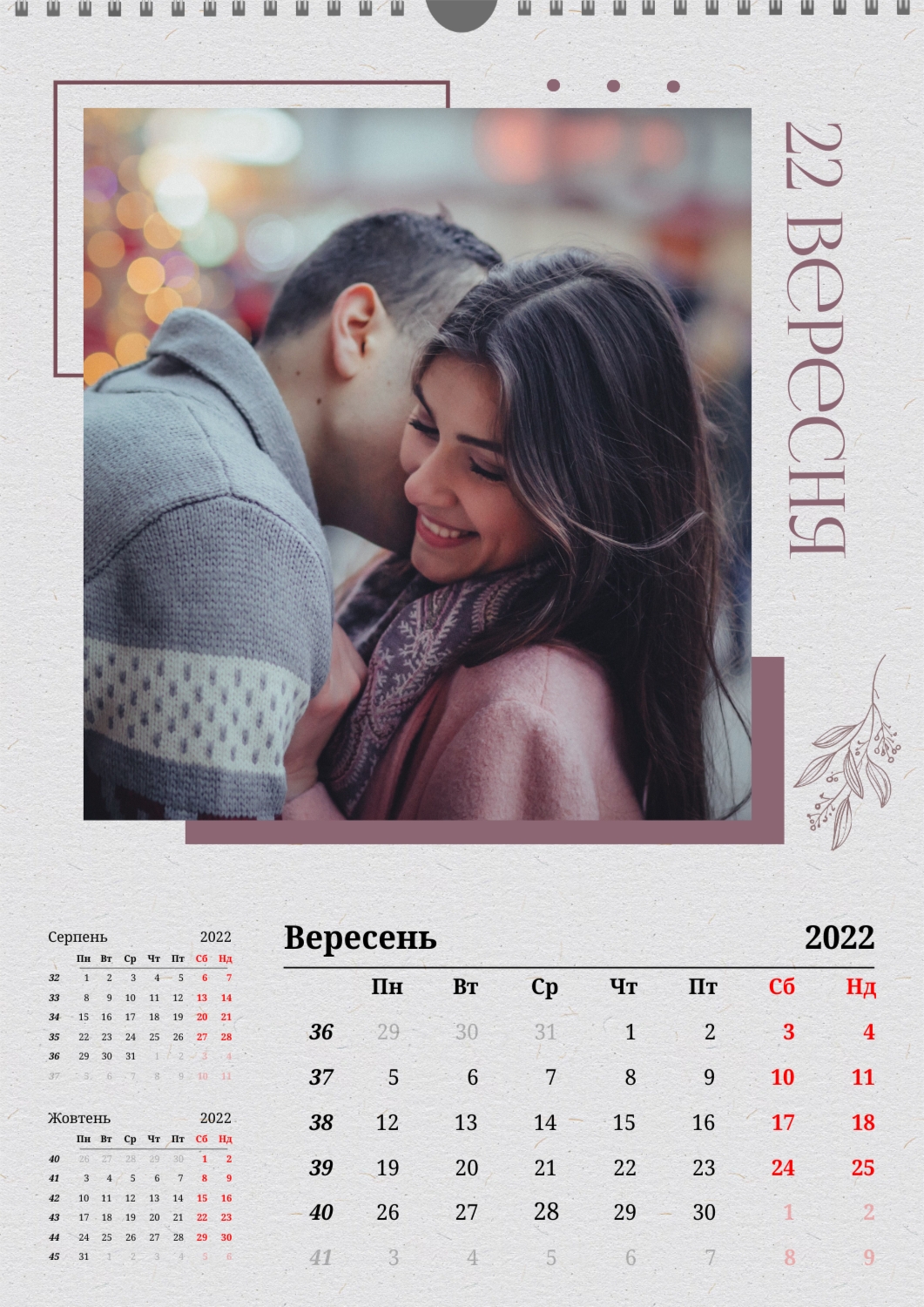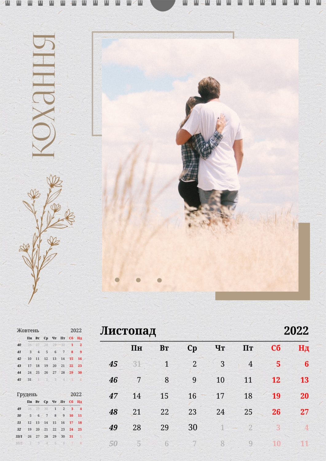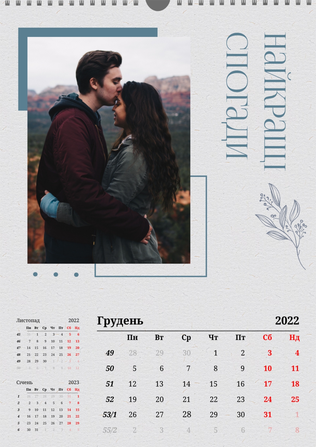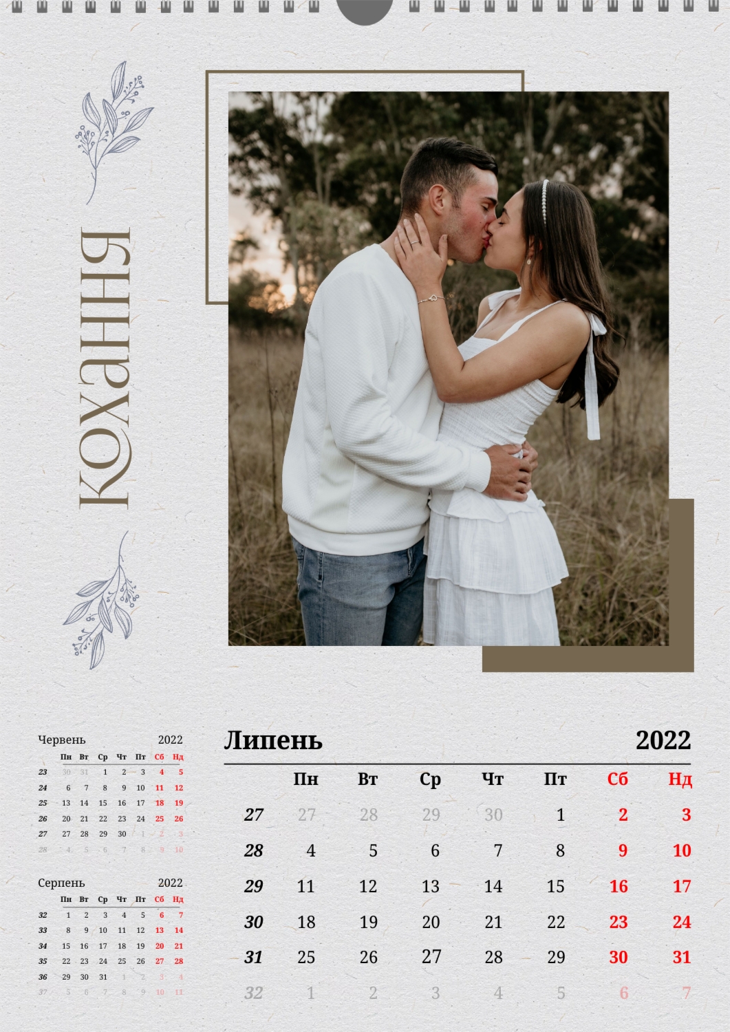Готовий шаблон українського календаря «Наша сім'я» — це теплий та душевний варіант оформлення, який особливо підійде для тих, хто цінує сімейні традиції та хоче зберегти важливі моменти у гарному та практичному вигляді. Його дизайн наповнений затишком та національним колоритом, що робить календар відмінним рішенням не тільки для домашнього використання, а й для професіоналів, що працюють у сфері сімейної фотографії, приватних студій, організаторів свят, педагогів початкової школи та психологів, які ведуть сімейні практики. Ключова особливість цього шаблону - гнучкість та зручність редагування в онлайн-конструкторі. Кожен елемент можна адаптувати до себе: завантажити власні фотографії членів сім'ї, змінити написи, важливі дати і навіть стилістику шрифтів. За необхідності можна додати власні свята, сімейні події, дні народження та пам'ятні дати – календар стає не просто корисним аксесуаром, а справжньою сімейною хронікою. Шаблон легко налаштовується завдяки простому та інтуїтивному інтерфейсу конструктора. Можна змінити колірну гаму, замінити фонове зображення або прикрасити сторінки додатковими елементами – від декоративних рамок до тематичних ікон. У результаті створюється унікальний календар, зроблений своїми руками, з душею і турботою, який радуватиме весь рік.