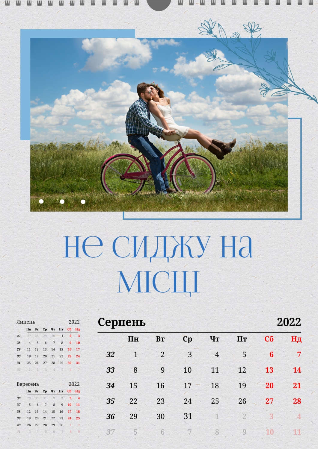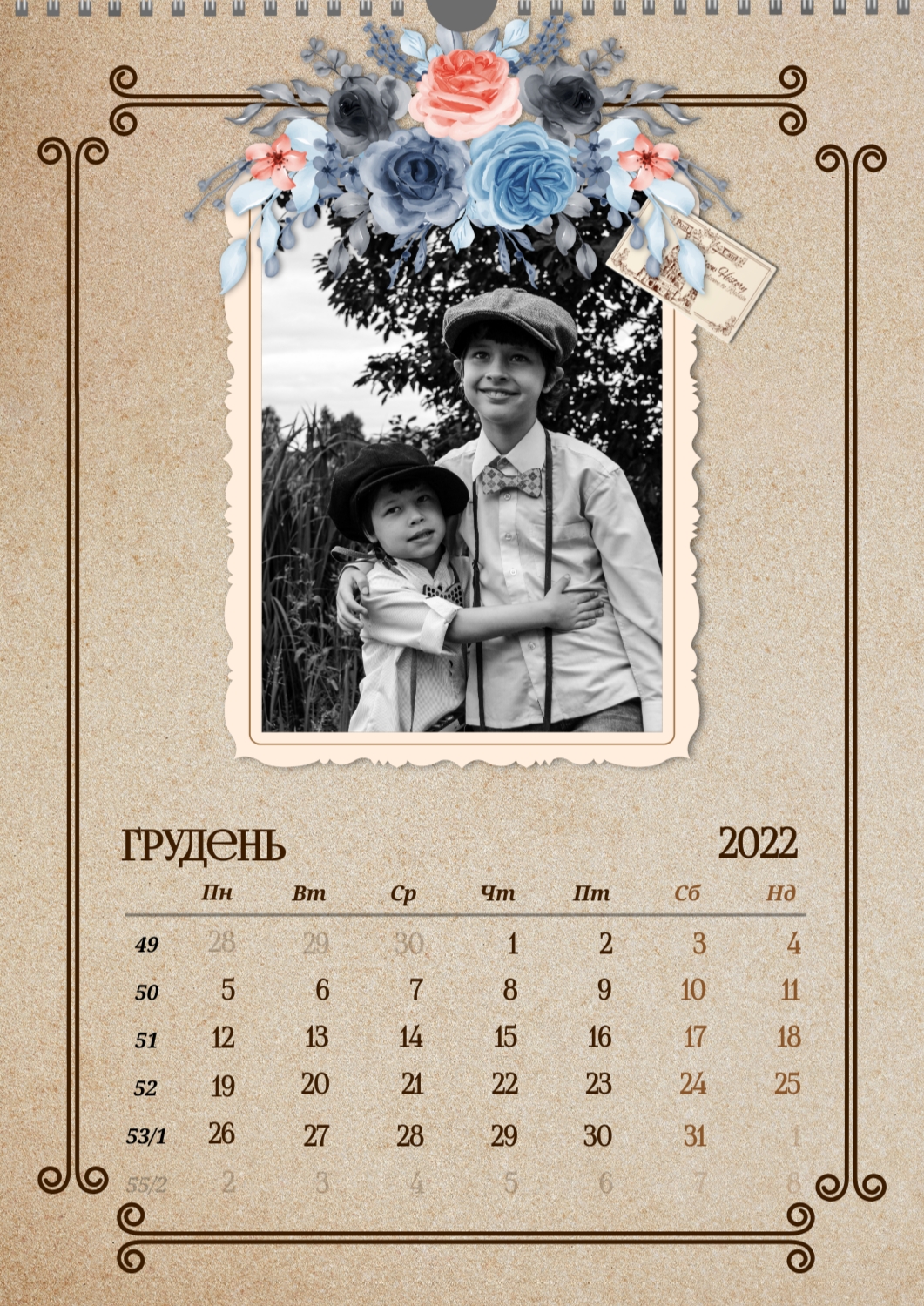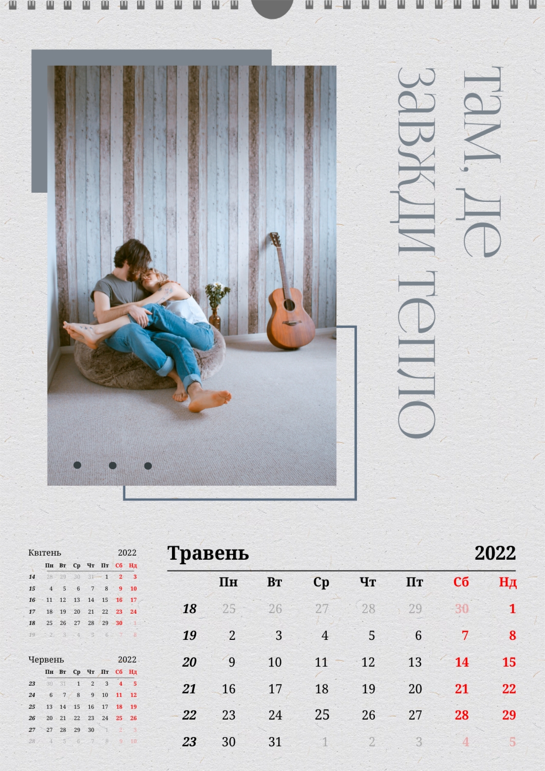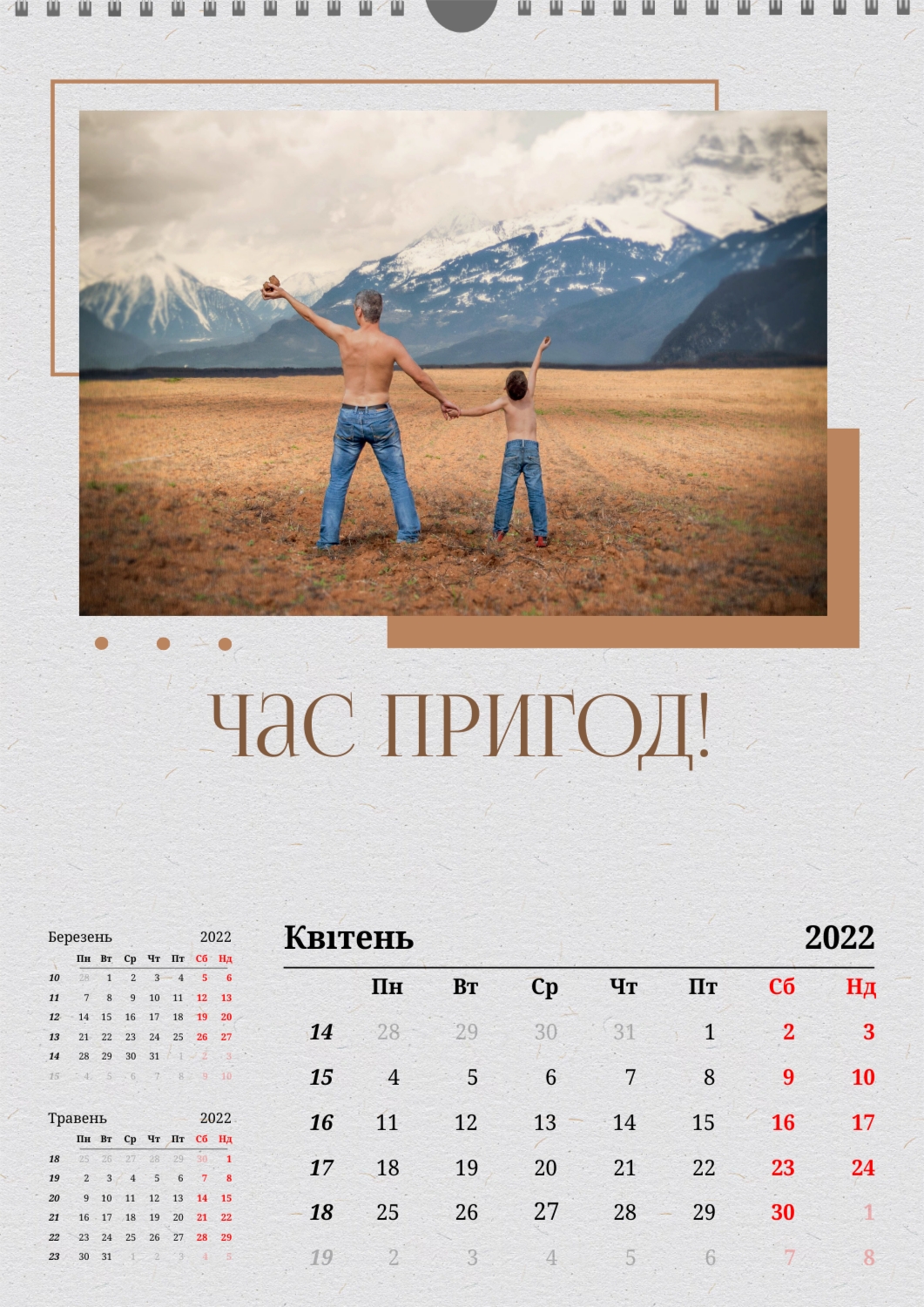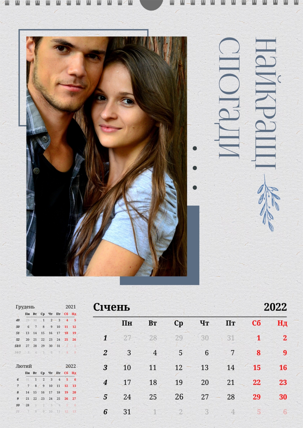 Готовий шаблон українського календаря «Наша сім'я» — це теплий та душевний варіант оформлення, який особливо підійде для тих, хто цінує сімейні традиції та хоче зберегти важливі моменти у гарному та практичному вигляді. Його дизайн наповнений затишком та національним колоритом, що робить календар відмінним рішенням не тільки для домашнього використання, а й для професіоналів, що працюють у сфері сімейної фотографії, приватних студій, організаторів свят, педагогів початкової школи та психологів, які ведуть сімейні практики. Ключова особливість цього шаблону - гнучкість та зручність редагування в онлайн-конструкторі. Кожен елемент можна адаптувати до себе: завантажити власні фотографії членів сім'ї, змінити написи, важливі дати і навіть стилістику шрифтів. За необхідності можна додати власні свята, сімейні події, дні народження та пам'ятні дати – календар стає не просто корисним аксесуаром, а справжньою сімейною хронікою. Шаблон легко налаштовується завдяки простому та інтуїтивному інтерфейсу конструктора. Можна змінити колірну гаму, замінити фонове зображення або прикрасити сторінки додатковими елементами – від декоративних рамок до тематичних ікон. У результаті створюється унікальний календар, зроблений своїми руками, з душею і турботою, який радуватиме весь рік.