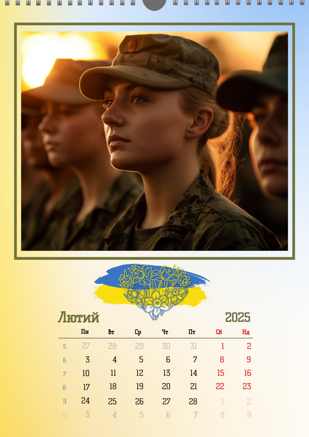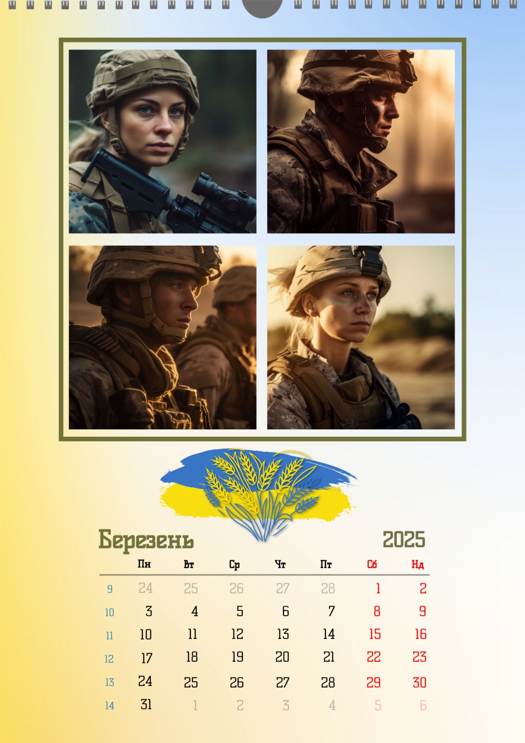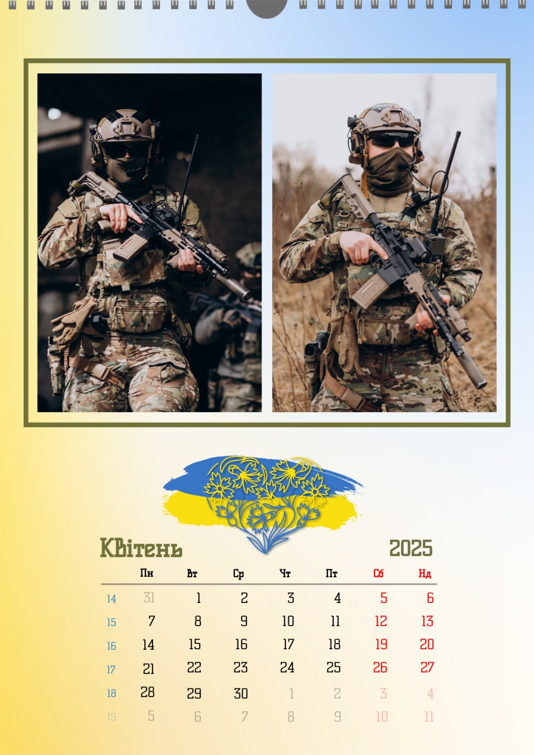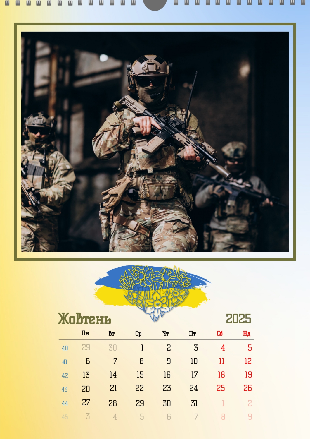 Готовий шаблон українського календаря для військових — це патріотичне та змістовне оформлення, яке несе у собі не лише практичну функцію, а й емоційне посилання. Такий календар особливо актуальний для військовослужбовців, ветеранів, волонтерів, представників оборонної сфери та всіх, хто так чи інакше пов'язаний із армією чи військовими організаціями. В онлайн-конструкторі цей шаблон можна легко адаптувати під конкретні цілі та потреби. Ви можете замінити фотографії на власні знімки — як портретні, так і групові, змінити підписи, додати індивідуальні тексти або важливі дати, пов'язані з військовою службою, пам'ятними подіями або особистими досягненнями. Також є можливість редагувати шрифти, кольори, оформлення сітки календаря і навіть додати власні цитати або емблеми. Інтерфейс конструктора інтуїтивно зрозумілий, що дозволяє швидко внести правки та побачити результат у реальному часі. Це чудовий спосіб створити персоналізований подарунок для бійця, командира чи цілого підрозділу — календар, у якому відображено не лише структуру місяців, а й повагу, подяку та пам'ять. Такий шаблон стає не просто друкованим виробом, а важливим символом підтримки та гордості.