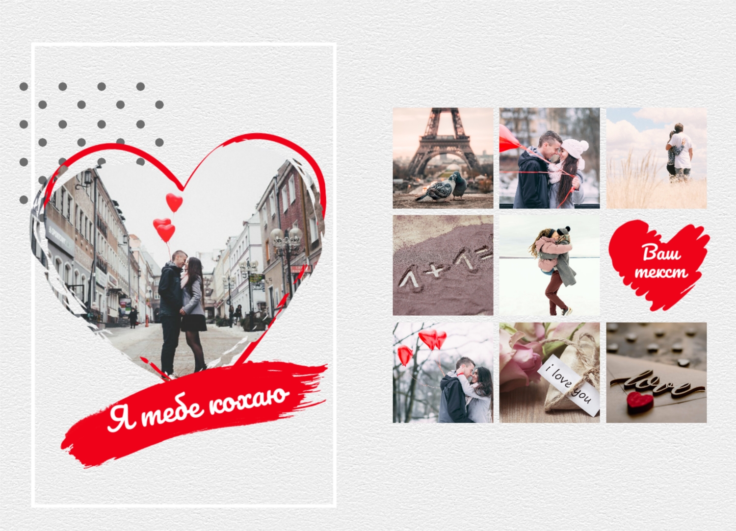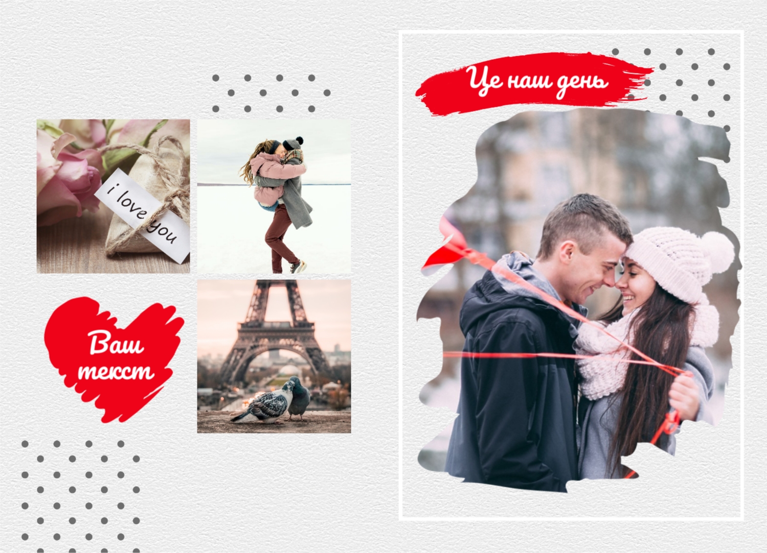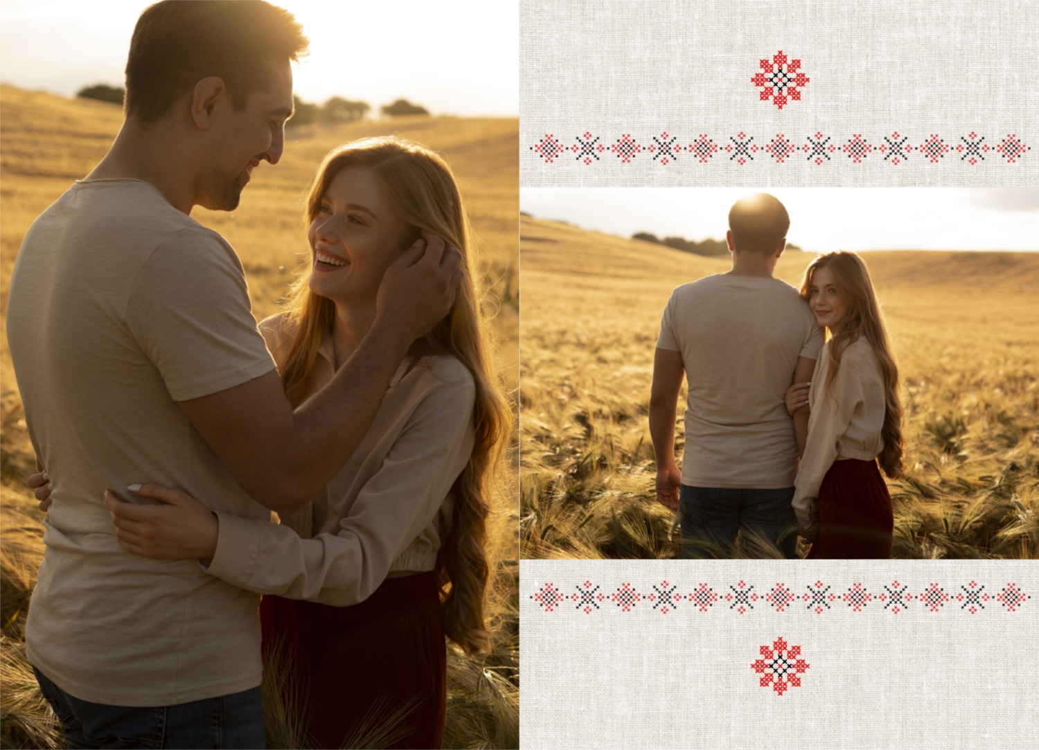 Готовий шаблон вертикальної фотокниги у твердій обкладинці для закоханих в українському стилі — це зворушливе та самобутнє оформлення, в якому поєднуються національні мотиви, м'які орнаменти, традиційні кольори та елементи української символіки. Такий шаблон ідеально підійде для пар, які цінують своє коріння і хочуть зберегти спогади про важливий етап відносин в автентичному та душевному оформленні. В онлайн-конструкторі ви можете легко змінити будь-які елементи шаблону, щоб зробити фотокнигу ще більш особистою та унікальною. Доступно редагування тексту, зміна шрифтів, кольорів та розташування блоків. Ви можете додати більше сторінок, вставити власні зображення, замінити візерунки на ті, що ближчі за духом саме вам, або навіть доповнити оформлення цитатами, віршами, важливими датами та символами вашої історії.