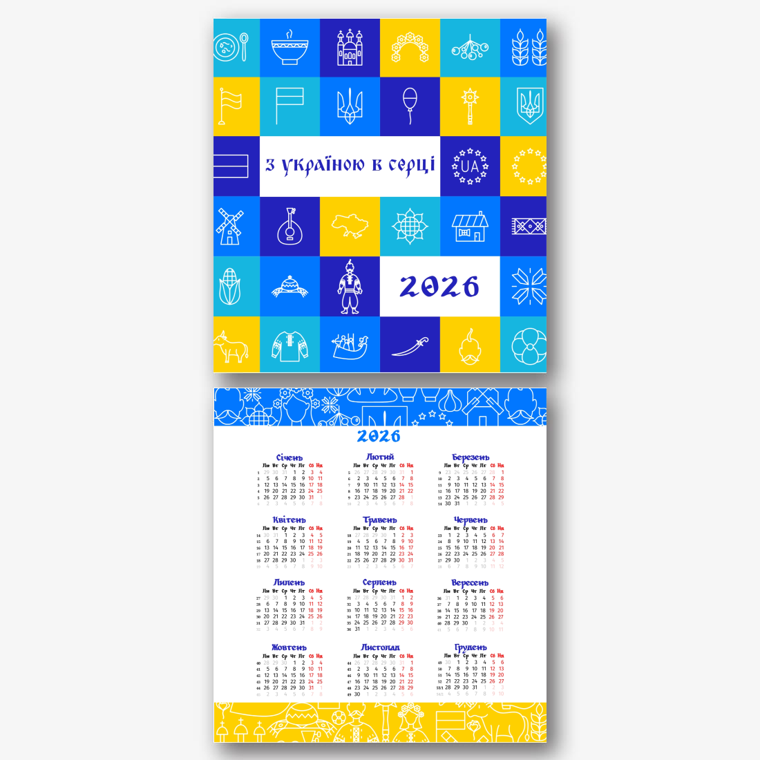 Готовий шаблон українського календаря — це стильне та практичне рішення для тих, хто хоче створити персоналізований настільний календар із національним характером. Онлайн-конструктор дозволяє гнучко редагувати шаблон під конкретні завдання. Можна змінити заголовки місяців, додати фото – як пейзажі, так і портрети – вставити логотип компанії або свій власний текст із важливими датами, подіями та привітаннями. Всі елементи дизайну доступні для налаштування: шрифти, кольори, фон, іконки та рамки легко замінюються або рухаються. Навіть якщо ви раніше ніколи не створювали макети, інтуїтивний інтерфейс конструктора допоможе вам впоратися із завданням без зайвих зусиль. За допомогою цього шаблону можна створити унікальний український календар своїми руками – особистий, корпоративний чи подарунковий.