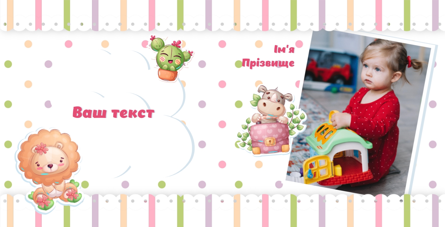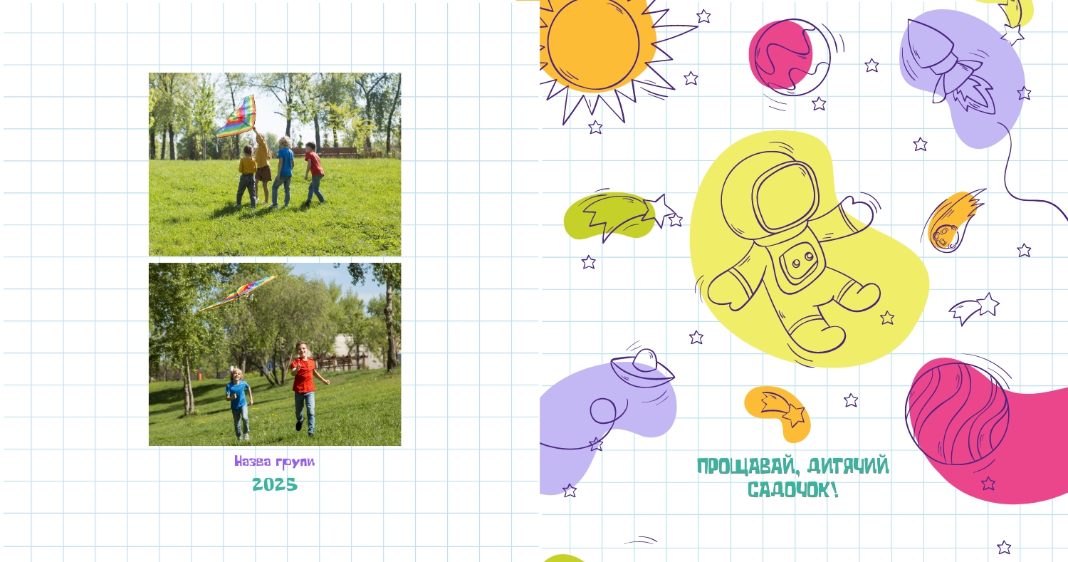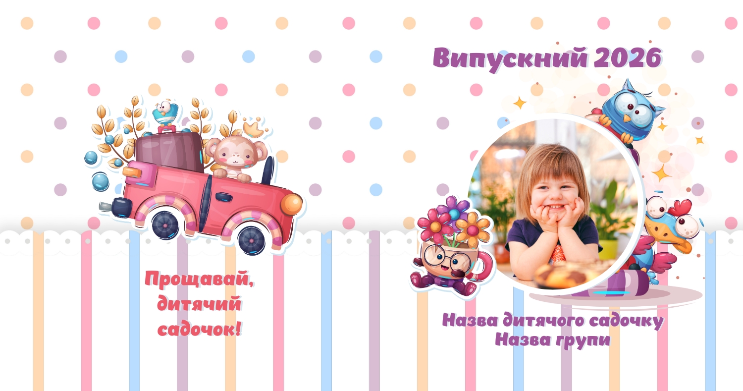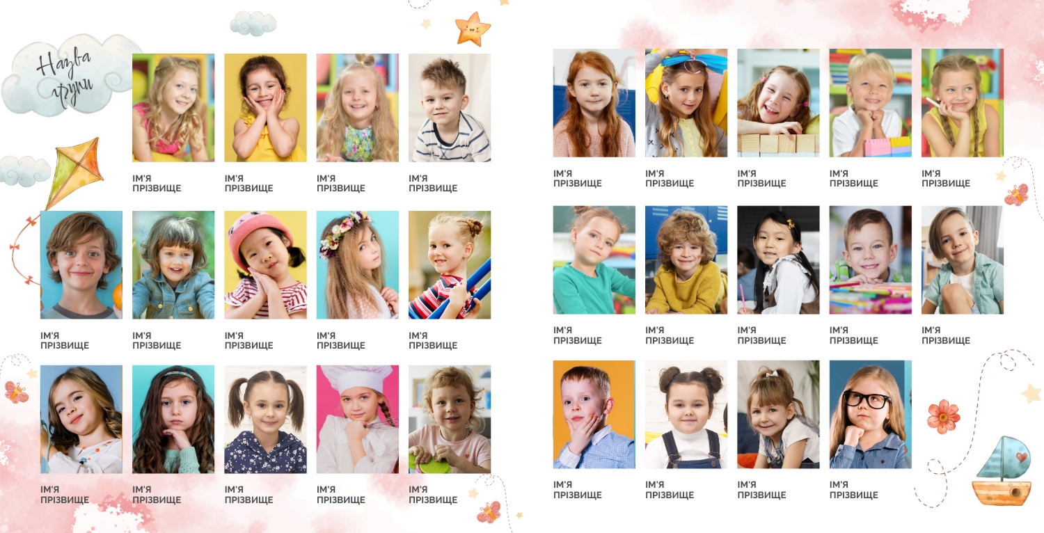 Готовий шаблон випускної української квадратної фотокниги для дитячого садка — це яскраве та зворушливе оформлення, яке допомагає зберегти найважливіші спогади про перші кроки у житті дитини. У дизайні поєднуються національні мотиви, ніжні кольори, дитячі ілюстрації та теплі деталі, що створюють атмосферу радості, безтурботності та кохання. Цей шаблон ідеально підійде для вихователів, завідувачів дитячих садків, фотографів, які працюють із дитячими закладами, а також для батьків, які бажають самостійно оформити фотокнигу до випускного свята. Онлайн-конструктор дозволяє легко адаптувати шаблон під конкретну групу, садок чи захід. Можна замінити фотографії, вписати імена дітей та вихователів, змінити шрифти та колір тексту, доповнити сторінки віршами, привітаннями чи навіть малюнками самих малюків. Фони, рамки, декоративні елементи - все можна редагувати, переміщати і комбінувати, щоб фотокнига вийшла не тільки красивою, а й унікальною.