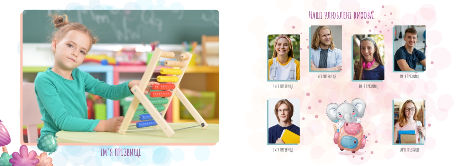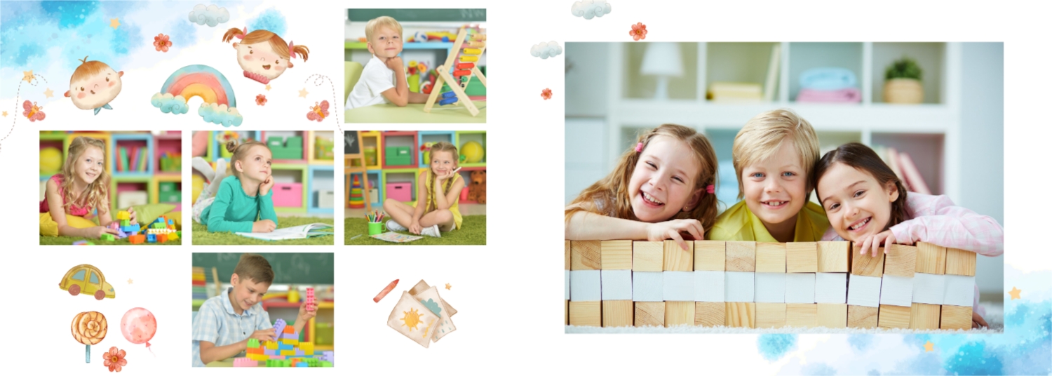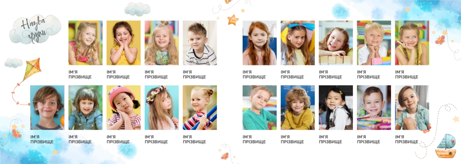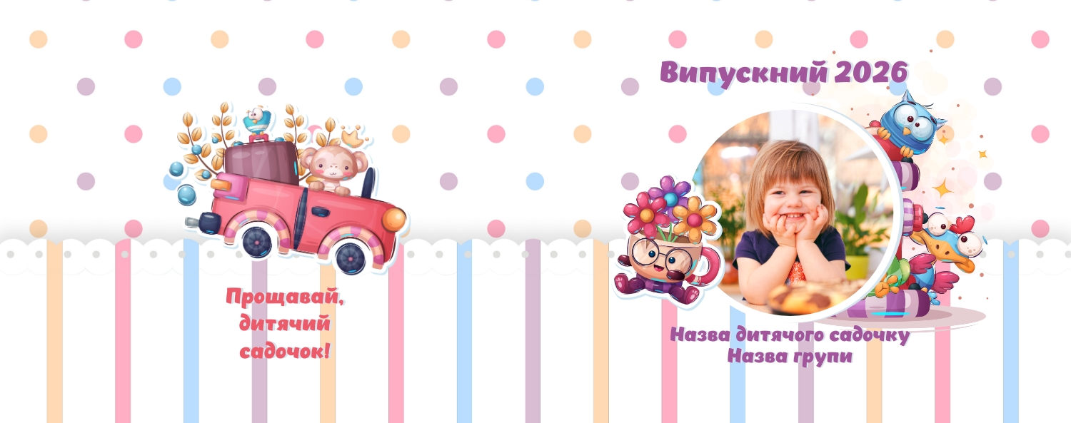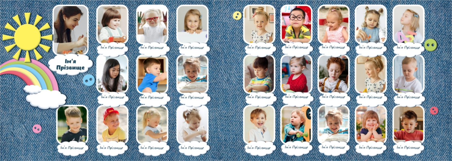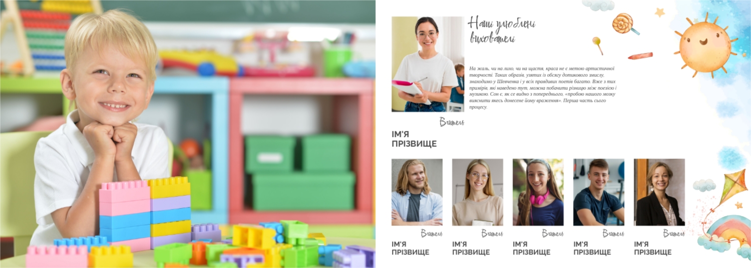 Готовий шаблон випускної української горизонтальної панорамної фотокниги для дитячого садка — це яскраве та зворушливе оформлення, яке допомагає зберегти найважливіші спогади про перші кроки у житті дитини. У дизайні поєднуються національні мотиви, ніжні кольори, дитячі ілюстрації та теплі деталі, що створюють атмосферу радості, безтурботності та кохання. Цей шаблон ідеально підійде для вихователів, завідувачів дитячих садків, фотографів, які працюють із дитячими закладами, а також для батьків, які бажають самостійно оформити фотокнигу до випускного свята. Онлайн-конструктор дозволяє легко адаптувати шаблон під конкретну групу, садок чи захід. Можна замінити фотографії, вписати імена дітей та вихователів, змінити шрифти та колір тексту, доповнити сторінки віршами, привітаннями чи навіть малюнками самих малюків. Фони, рамки, декоративні елементи - все можна редагувати, переміщати і комбінувати, щоб фотокнига вийшла не тільки красивою, а й унікальною.