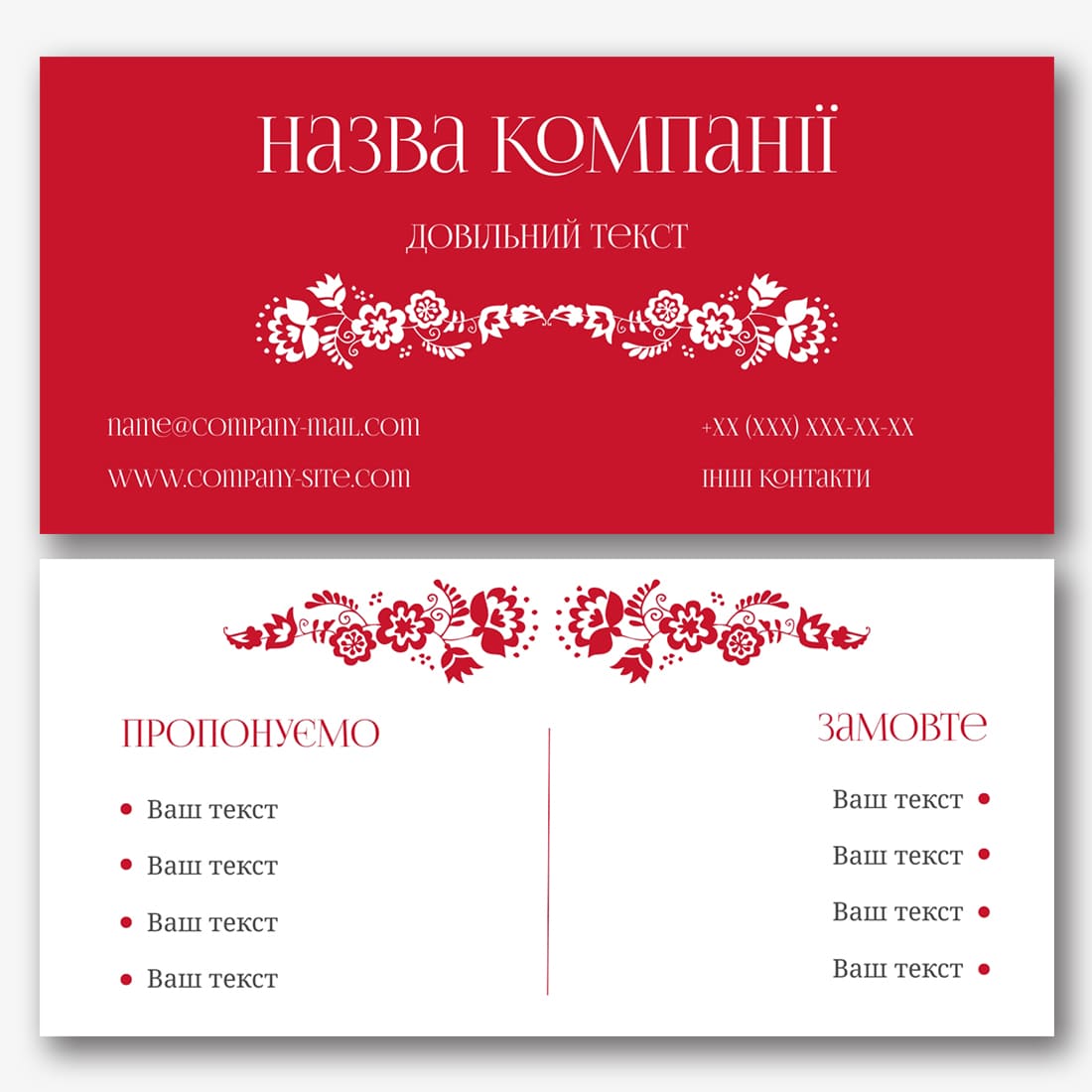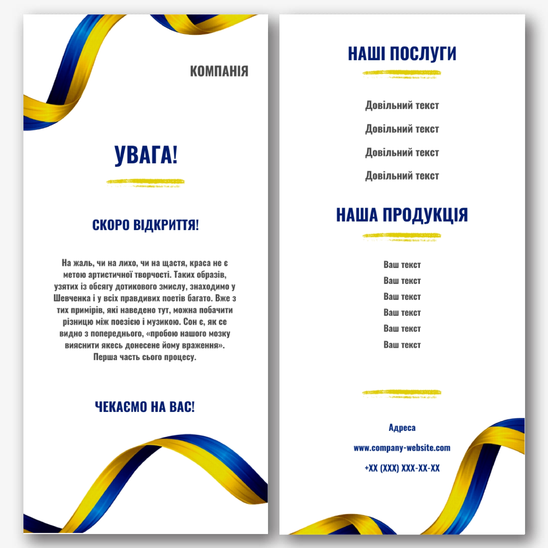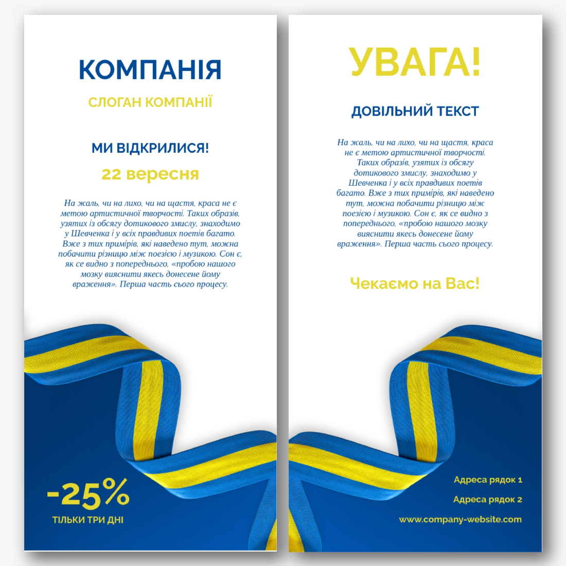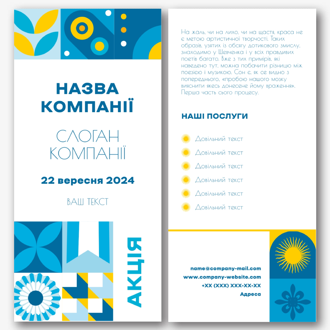 Готовий шаблон флаєра в українському стилі зі спеціальною пропозицією – це сучасне і водночас автентичне рішення, яке одразу привертає увагу. Такий дизайн особливо актуальний для ресторанів української кухні, етно-кафе, магазинів сувенірів та ремісничих виробів, туристичних компаній, культурних центрів, організаторів фестивалів та майстер-класів. Він відмінно підійде і для локальних бізнесів, які хочуть наголосити на зв'язку з національними традиціями та запропонувати клієнтам особливі акції чи знижки. В онлайн-конструкторі цей шаблон легко трансформується під конкретні завдання. Можна змінити текст пропозиції, додати логотип компанії, контакти або QR-код для швидкого переходу на сайт. Фон, кольори та декоративні елементи також можна редагувати: за бажання зробити дизайн більш мінімальним або навпаки підкреслити етнічні акценти. Завдяки гнучким параметрам змінюється розташування блоків, розміри шрифтів і фотографій, а також додаються нові зображення або ілюстрації.