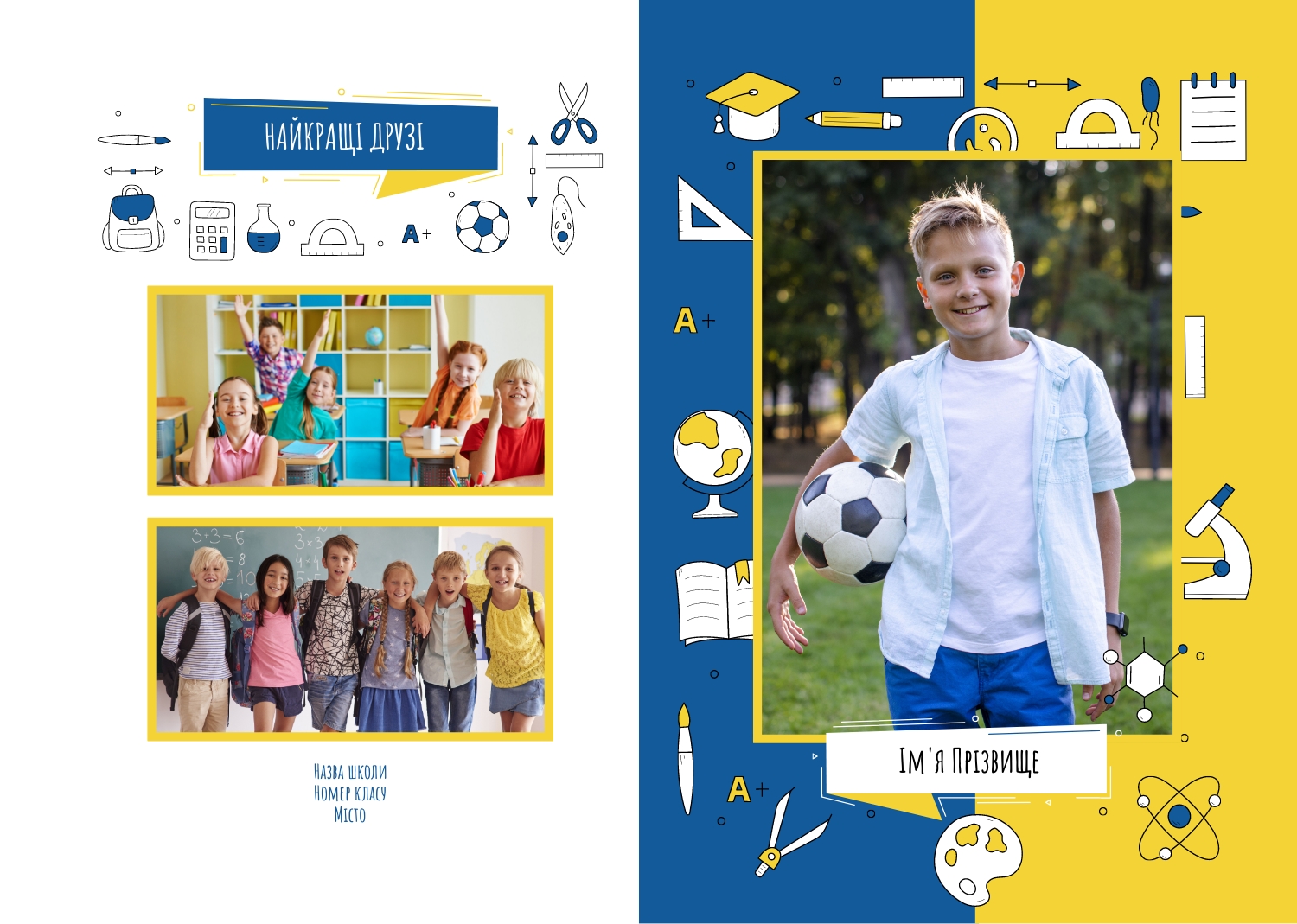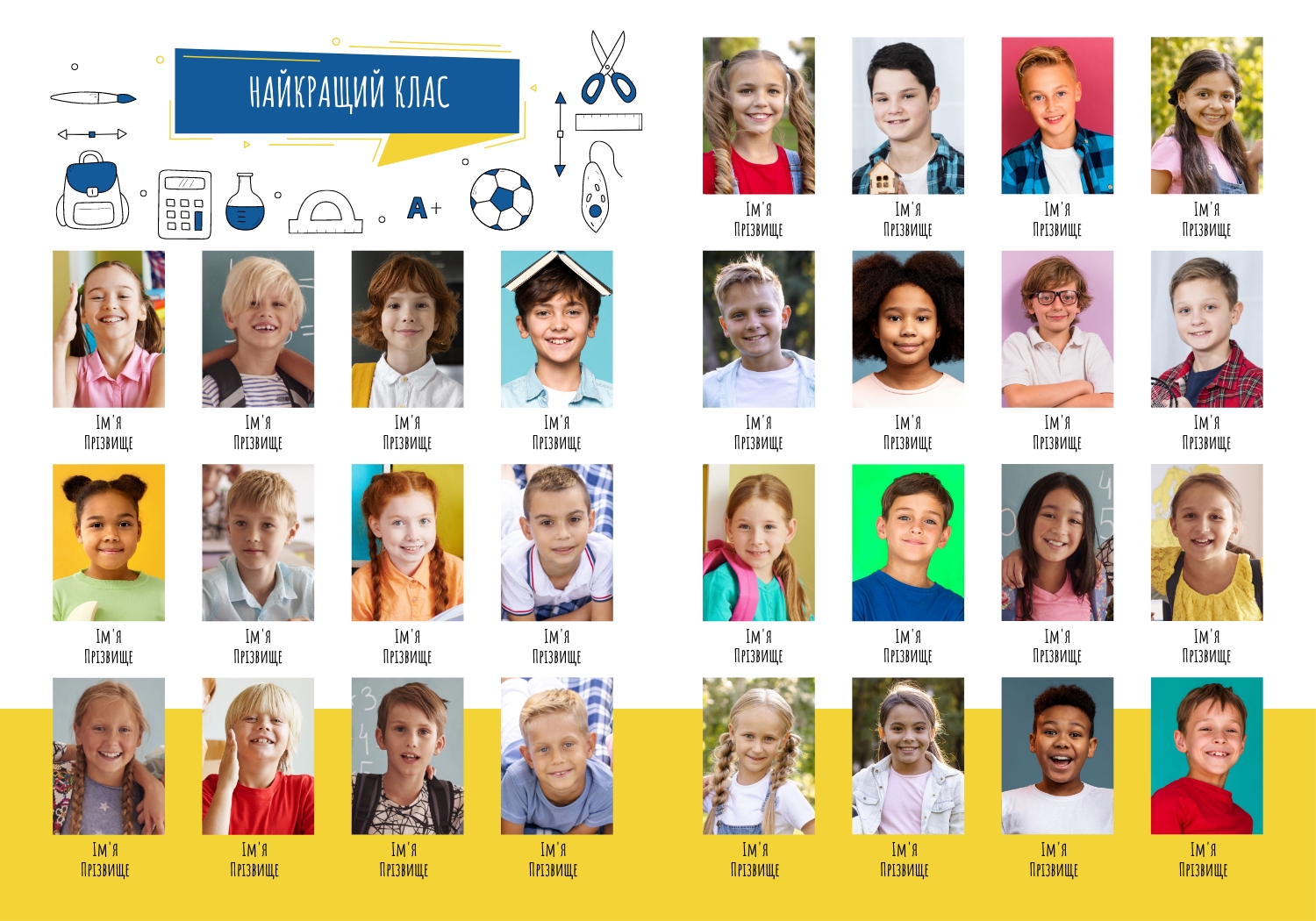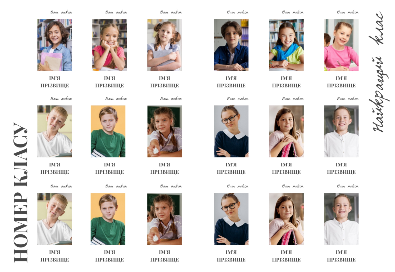 Готовий патріотичний шаблон вертикальної віньєтки для середньої школи створений спеціально для того, щоб підкреслити любов до рідної країни та повагу до її символів. В оформленні використані національні кольори та елементи, які створюють урочистий та гармонійний настрій. В онлайн-конструкторі цей шаблон легко редагується: можна змінювати фонові елементи, додавати написи з гаслами чи девізами класу, редагувати розташування фотографій та підписів. За потреби допускається заміна колірної гами або окремих графічних деталей, що дозволяє адаптувати макет під конкретний навчальний заклад чи подію. Також є можливість додавання герба школи, емблеми міста чи іншої символіки, що робить віньєтку максимально персоналізованою.
