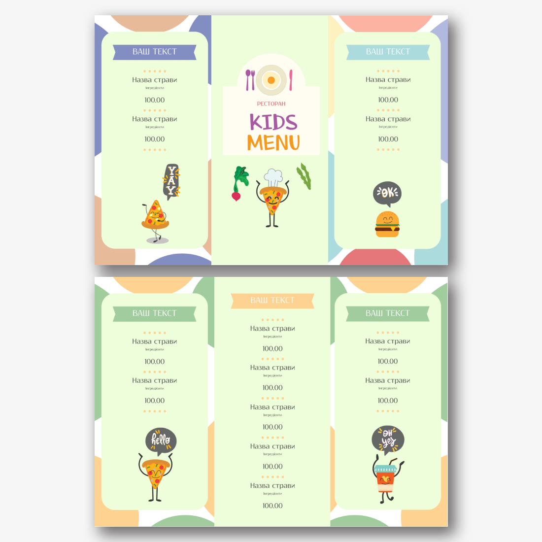 Готовий шаблон дитячого меню на аркуші створений спеціально для того, щоб зробити оформлення смачним, яскравим і привабливим для малюків. Веселі ілюстрації, життєрадісні кольори і зручна структура дозволяють відразу виділити основні страви і напої, які сподобаються дітям. Такий шаблон ідеально підійде для кафе і ресторанів з дитячими зонами, сімейних закладів, дитячих садків і шкіл, дитячих клубів, а також для організаторів святкових заходів і кейтерингових компаній, де важливо підкреслити увагу до маленьких гостей. В онлайн-конструкторі цей шаблон можна повністю адаптувати під конкретні завдання. Можна змінити колірну гамму, додати власні ілюстрації або логотип закладу, відредагувати Тексти, вказати ціни і склад страв. При бажанні легко замінити шрифти на більш грайливі або, навпаки, зробити їх більш суворими, щоб меню виглядало стильно і сучасно. Фотографії страв можна завантажувати самостійно, розміщуючи їх саме там, де потрібно, а фон легко підлаштовується під інтер'єр закладу або фірмовий стиль.