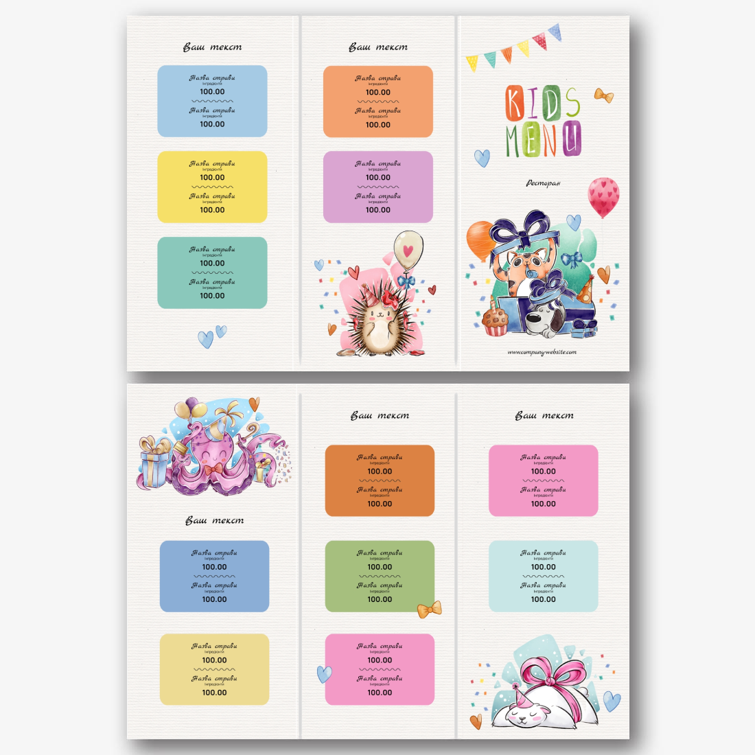 Готовий шаблон яскравого дитячого меню буклету-це барвисте і життєрадісне рішення, яке відразу привертає увагу малюків і їх батьків. В онлайн-конструкторі цей шаблон можна легко редагувати під конкретні завдання. Меню можна наповнити своїми стравами, поміняти шрифти і кольори тексту, додати фірмові логотипи та контактні дані закладу. Кожен елемент можна перемістити, змінити розміри ілюстрацій або замінити їх на власні зображення, щоб дизайн повністю відповідав стилю бренду. Якщо потрібно, яскраві деталі можна зробити м'якше, а акценти змістити на фотографії страв, щоб підкреслити апетитність частувань. Редагування в онлайн-конструкторі не вимагає спеціальних знань, тому створити унікальне дитяче меню своїми руками зможе будь-який співробітник. Це дозволяє не тільки заощадити час, але і отримати готовий результат, який буде оригінальним, професійним і ідеально підходить саме для вашого закладу.