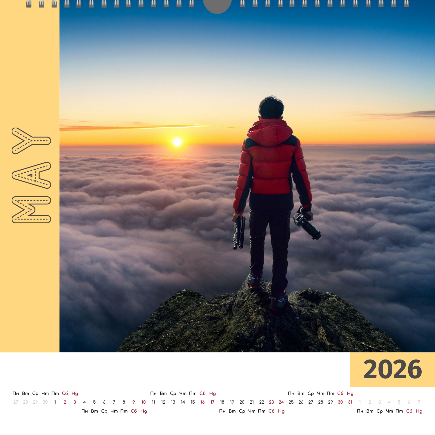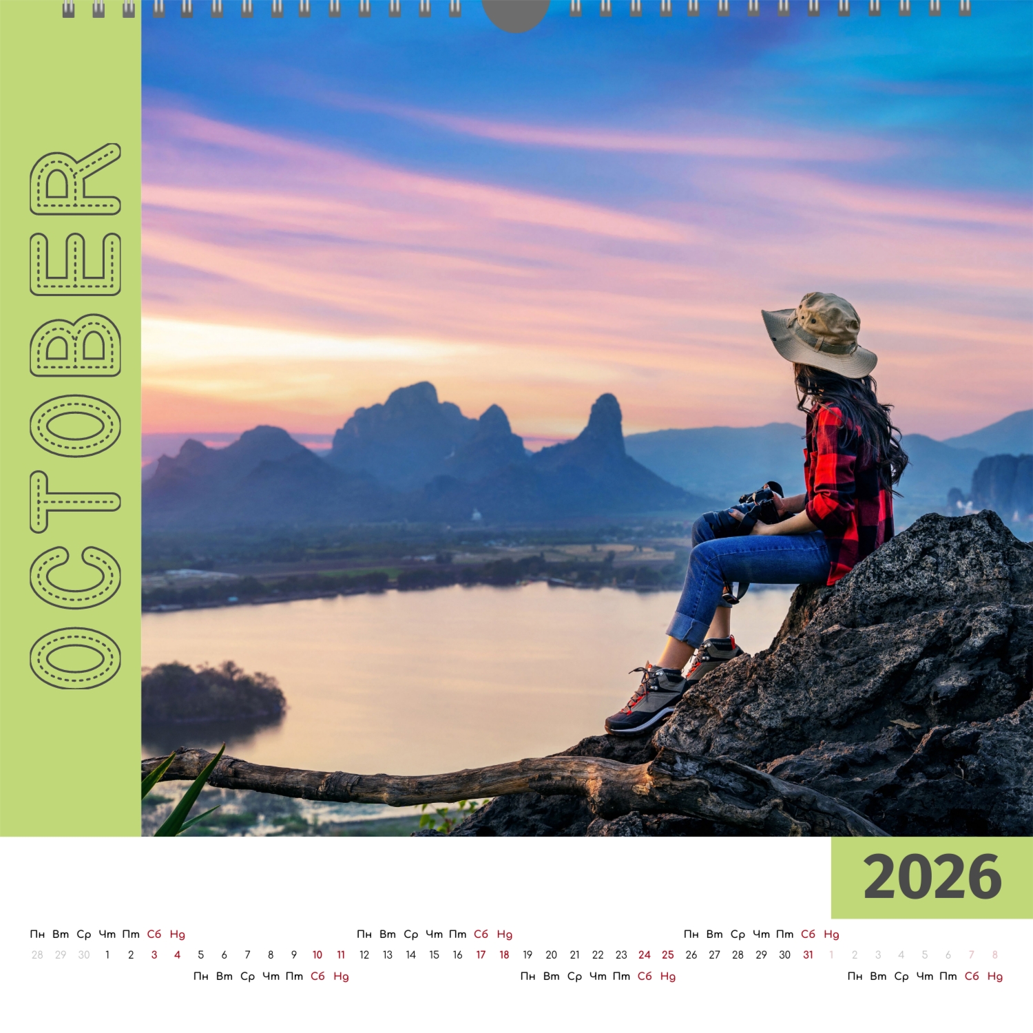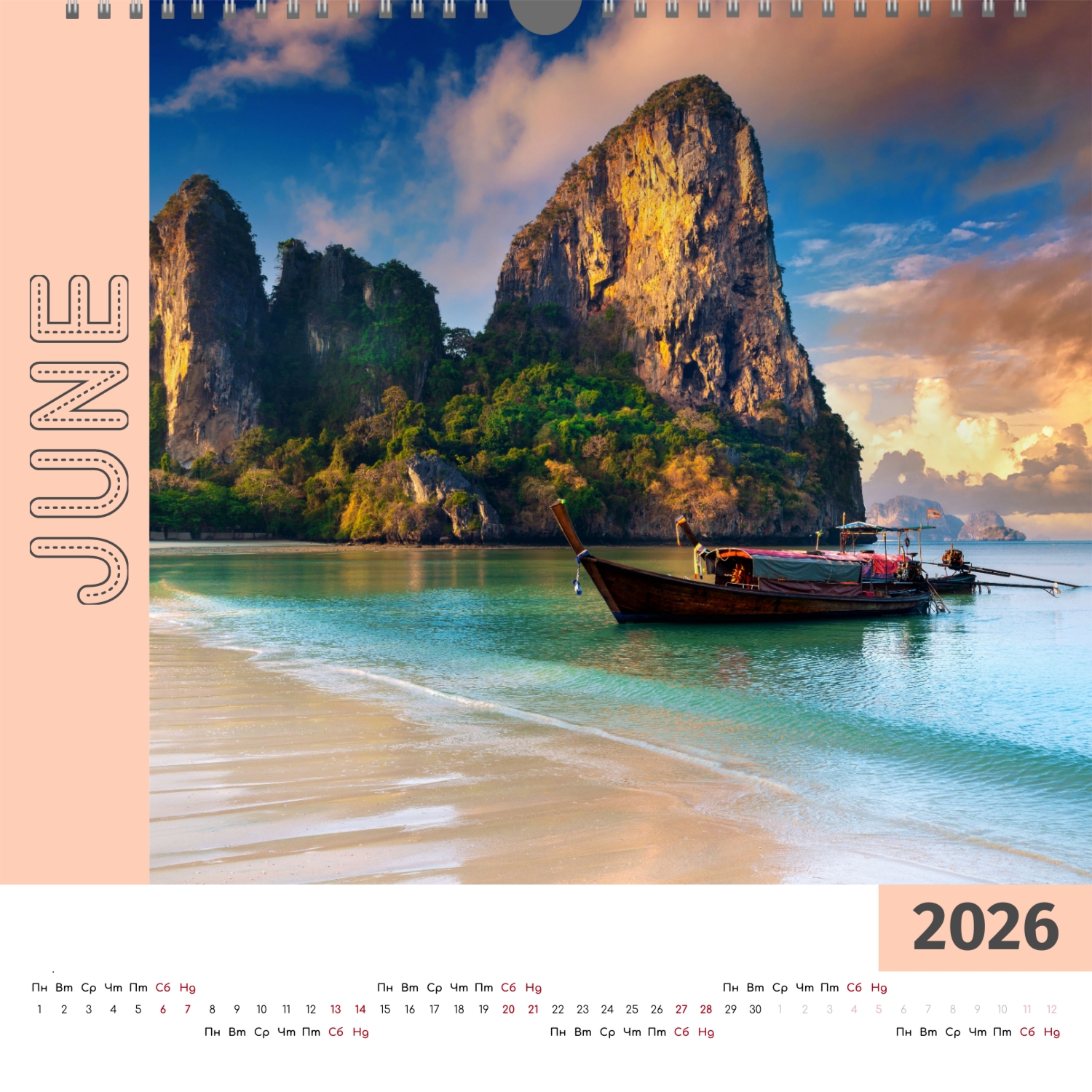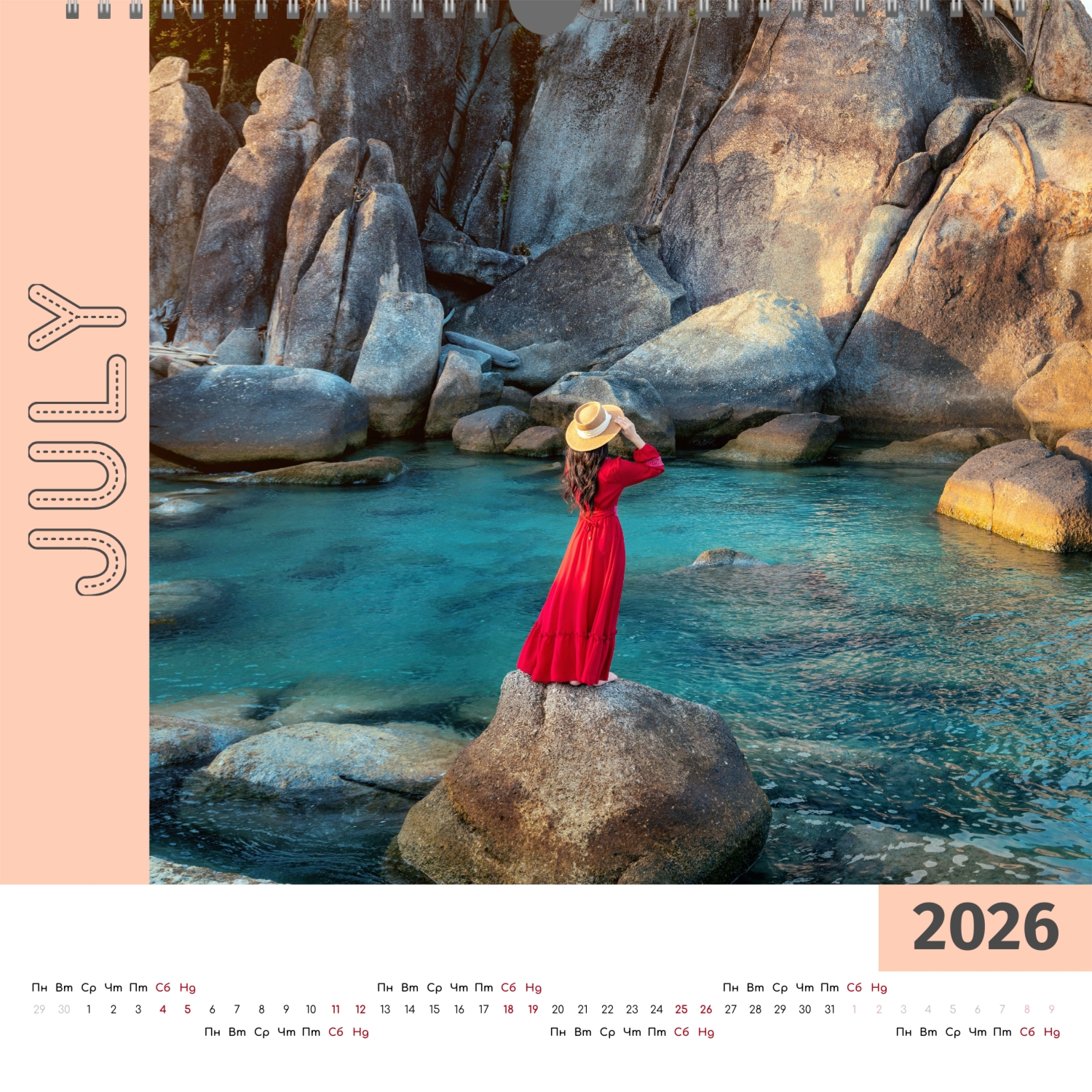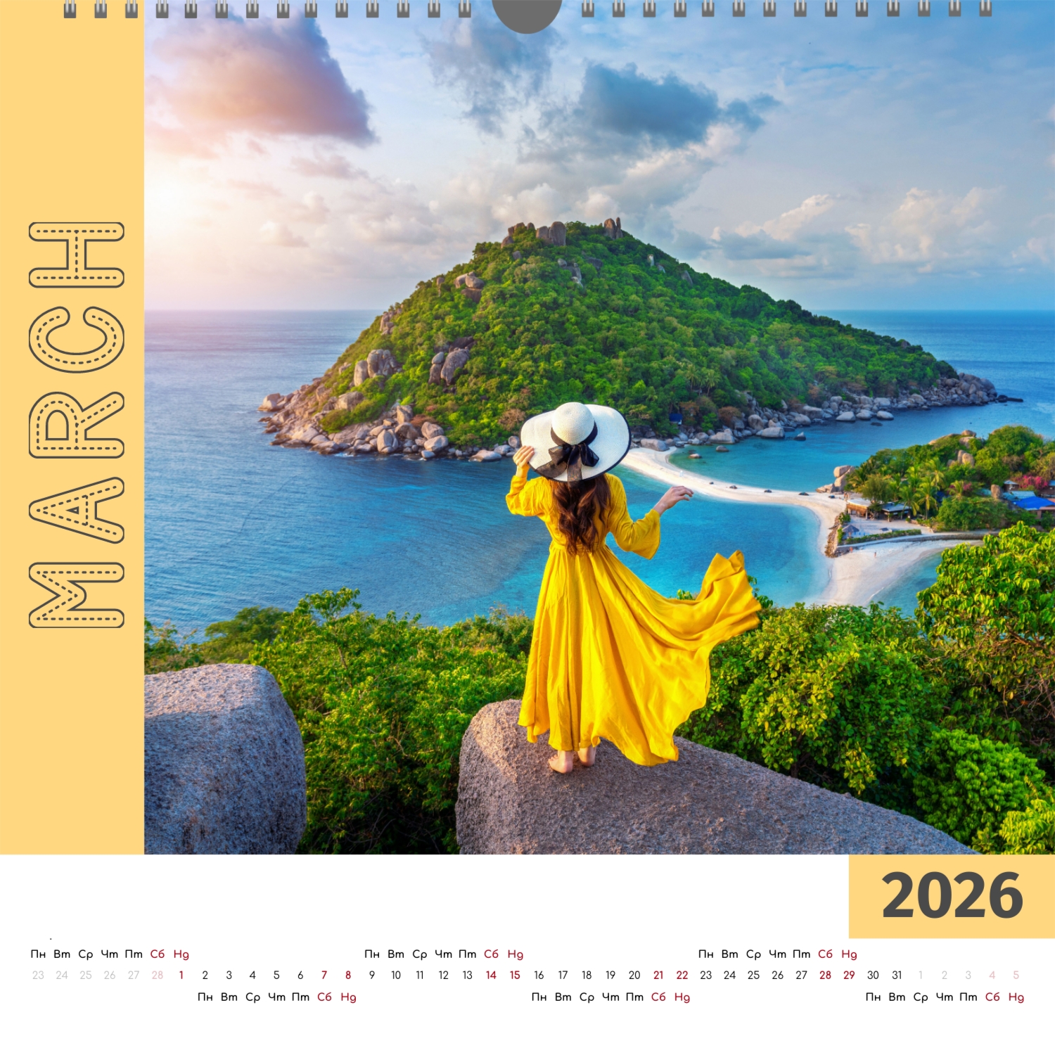 Готовий шаблон настінного календаря з фото подорожей-це ідеальний інструмент для створення персоналізованого виробу, який стане справжнім відображенням вашої любові до відкриттів і яскравих моментів. Даний шаблон, розроблений в нашому онлайн-конструкторі, пропонує універсальну базу для оформлення настінного квадратного календаря з унікальними фотографіями, пов'язаними з подорожами. Такий календар стане прекрасним рішенням для професіоналів, чия робота пов'язана з туризмом, подорожами або організацією заходів. Він відмінно підійде для турагентів, гідів, фотографів і блогерів, що розповідають про подорожі. Крім того, шаблон стане в нагоді компаніям, що займаються просуванням туристичних напрямків, а також для особистого використання — наприклад, в якості подарунка для друзів і близьких. Ви можете легко додавати свої фотографії, змінювати кольори та шрифти, додавати нотатки та пам'ятні дати. Конструктор дозволяє адаптувати шаблон під будь-які завдання і створити дійсно унікальний продукт. Вам не потрібно володіти спеціальними навичками дизайну — інтерфейс простий і інтуїтивно зрозумілий. Кожен елемент календаря можна налаштувати так, щоб він повністю відповідав вашим уподобанням. Готовий шаблон календаря з фото подорожей-це спосіб втілити вашу креативність в практичному і стильному виробі, яке буде радувати вас або ваших клієнтів весь рік.