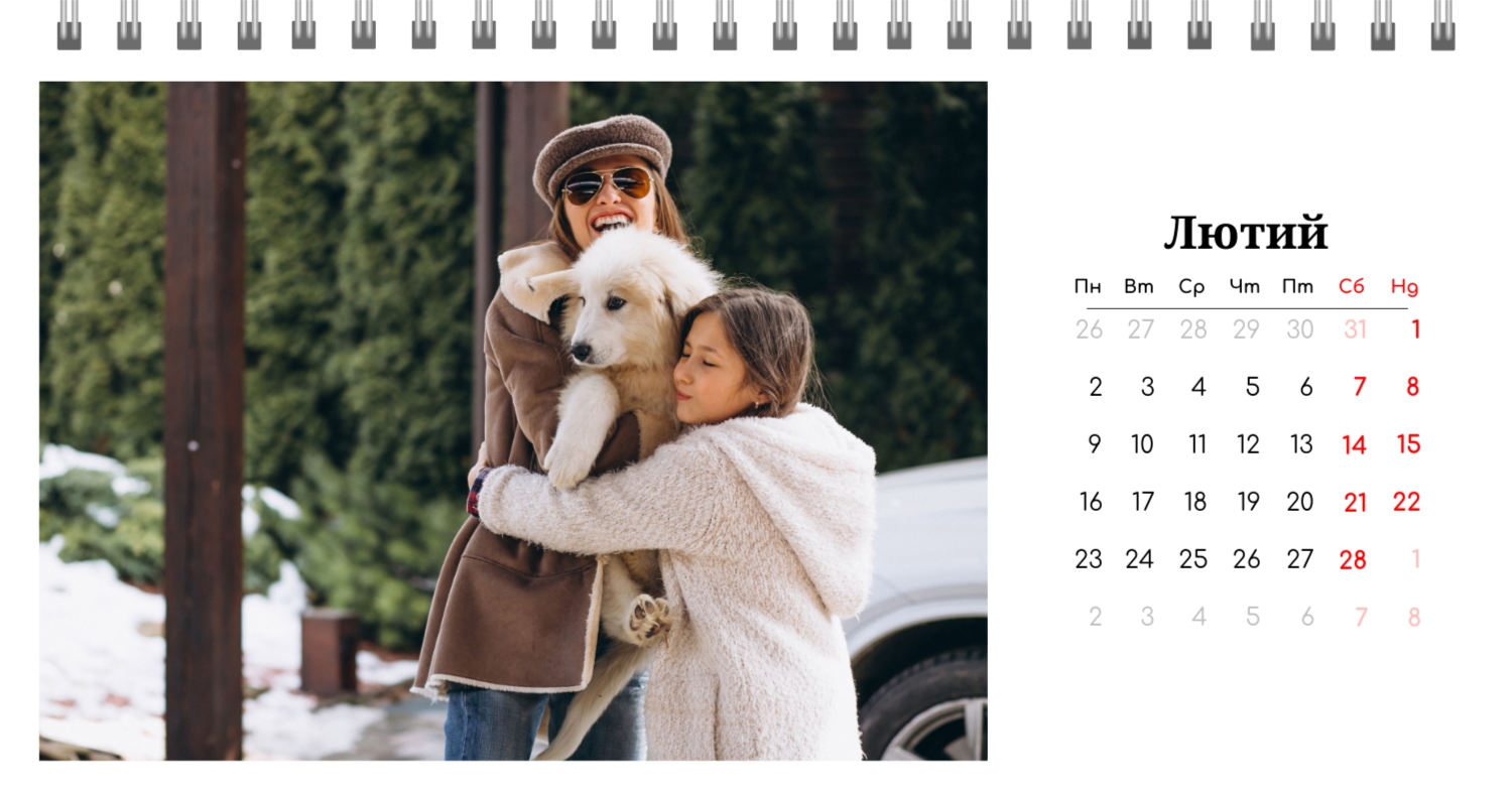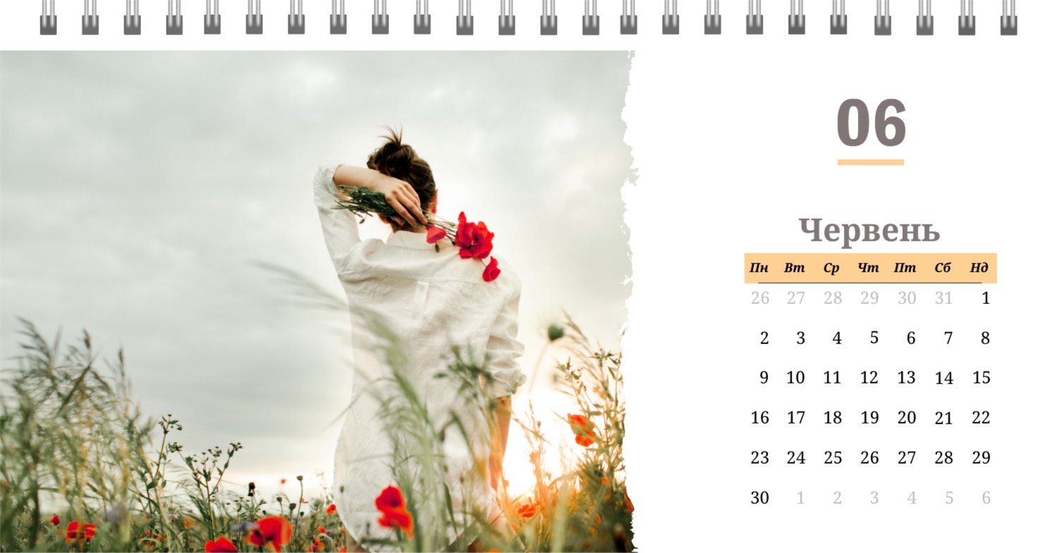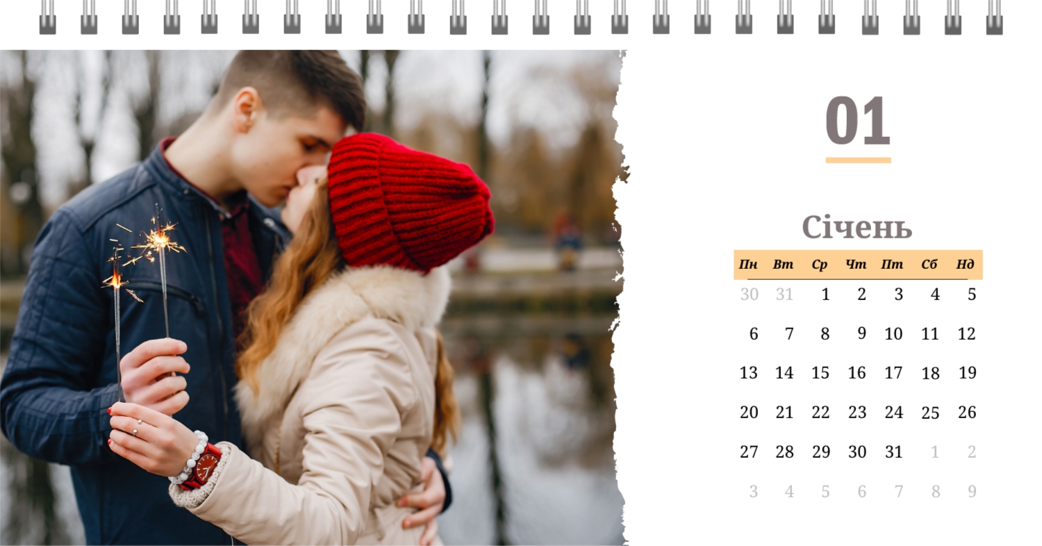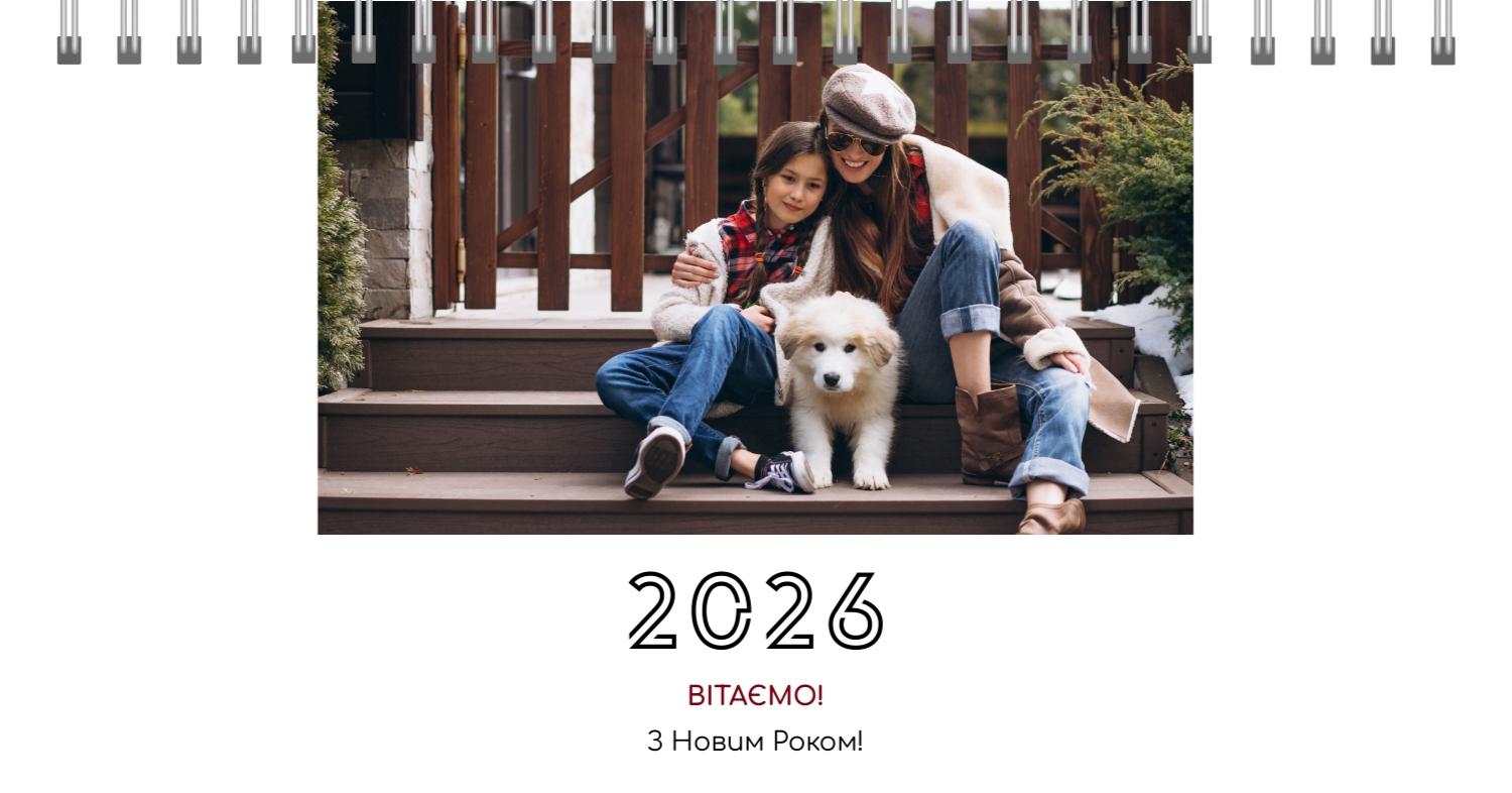 Готовий шаблон настільного перекидного горизонтального календаря з поздоровленням виконаний в мінімалістичному і сучасному стилі, де кожен місяць зустрічає користувача коротким привітанням. В онлайн-конструкторі цей шаблон можна легко адаптувати під особисті або корпоративні завдання. Є можливість змінити фон, вибрати інші поєднання шрифтів, замінити привітальні фрази або залишити їх у вихідному вигляді, скорегувати колірну гамму, Додати фотографії, ілюстрації або фірмову графіку. При необхідності можна вставити логотип компанії, контактні дані або мотиваційні цитати, щоб календар став частиною корпоративного стилю або персональним творчим об'єктом для натхнення.