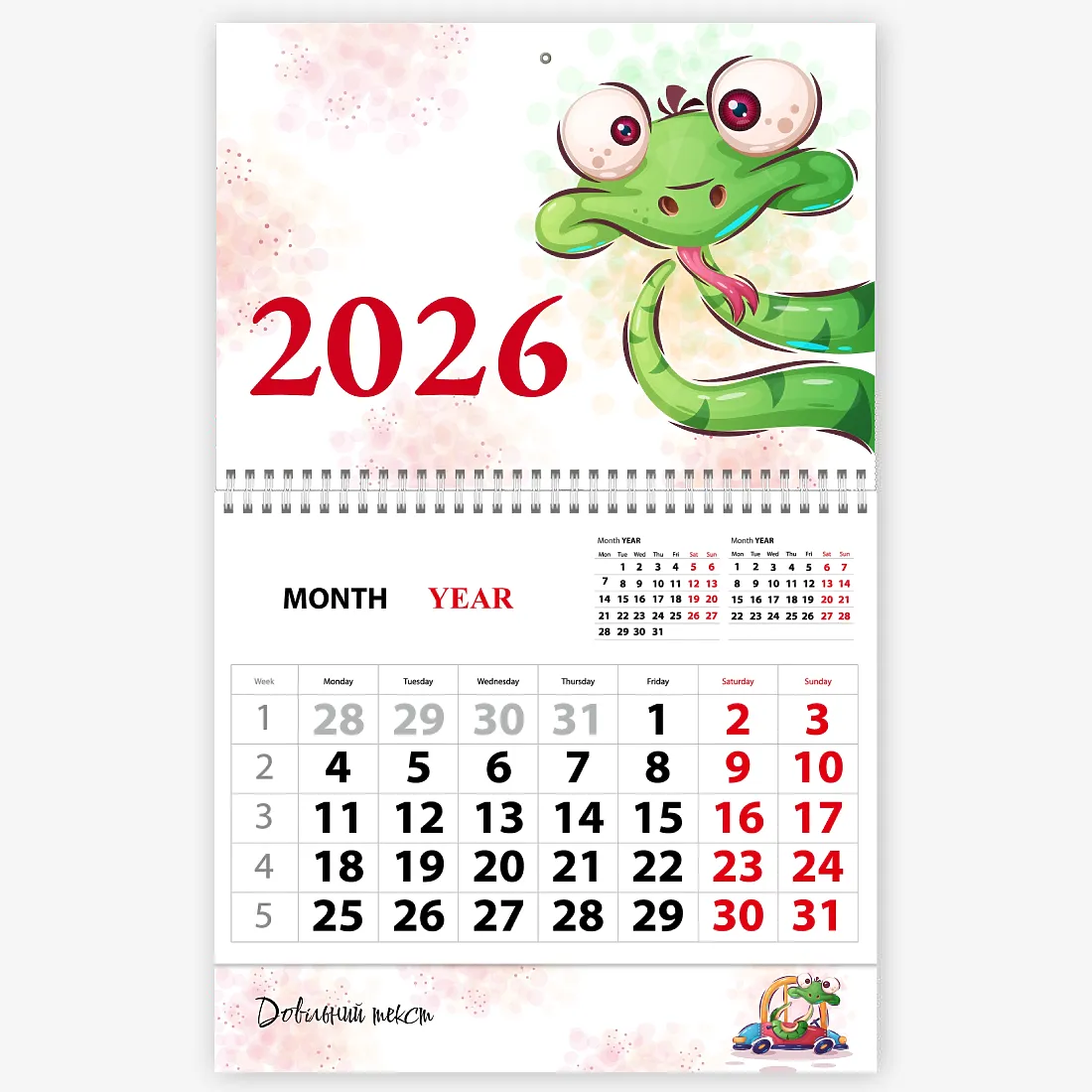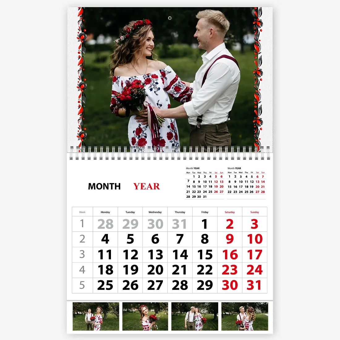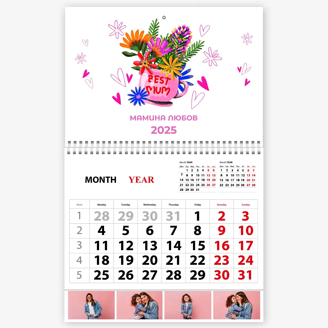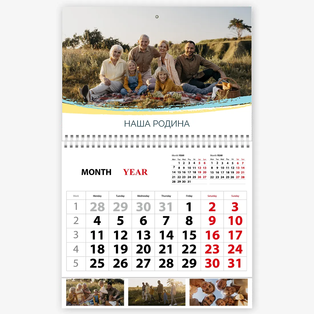 Готовий шаблон настінного квартального календаря "Наша сім'я" створений для тих, хто цінує теплі спогади, атмосферу будинку і хоче оформити кожен місяць року з душею. В його основі-м'які, гармонійні кольори і акуратні декоративні елементи, які підкреслюють фото, не відволікаючи від головного. В онлайн-конструкторі цей шаблон легко трансформується під індивідуальні завдання. Ви можете замінити фотографії на будь-які улюблені знімки, вибрати інший стиль шрифту, поміняти кольори підписів і акцентів, додати імена, важливі дати, пам'ятні події та сімейні свята. Кожен елемент в шаблоні можна пересувати, масштабувати або видаляти, а при бажанні — додати нові декоративні деталі, наприклад, маленькі іконки, рамки або тематичні зображення. Календар "Наша сім'я" добре підходить не тільки для домашнього використання. Ним часто користуються фотографи, щоб створювати готові продукти для клієнтів, дитячі студії для подарунків батькам, сімейні центри творчості, а також майстри хендмейду, які оформляють затишні набори та сувеніри. Завдяки зручності онлайн-конструктора, працювати з шаблоном абсолютно нескладно — навіть якщо ви вперше створюєте персоналізований дизайн, процес буде інтуїтивним і приємним.
