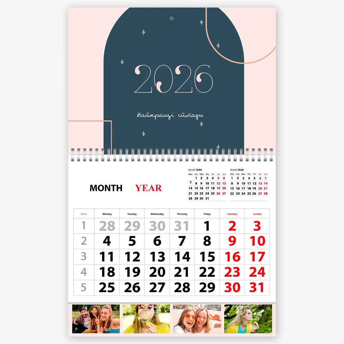 Готовий шаблон настінного квартального календаря "Наша сім'я" створений для тих, хто цінує теплі спогади, атмосферу будинку і хоче оформити кожен місяць року з душею. В його основі-м'які, гармонійні кольори і акуратні декоративні елементи, які підкреслюють фото, не відволікаючи від головного. В онлайн-конструкторі цей шаблон легко трансформується під індивідуальні завдання. Ви можете замінити фотографії на будь-які улюблені знімки, вибрати інший стиль шрифту, поміняти кольори підписів і акцентів, додати імена, важливі дати, пам'ятні події та сімейні свята. Кожен елемент в шаблоні можна пересувати, масштабувати або видаляти, а при бажанні — додати нові декоративні деталі, наприклад, маленькі іконки, рамки або тематичні зображення. Календар "Наша сім'я" добре підходить не тільки для домашнього використання. Ним часто користуються фотографи, щоб створювати готові продукти для клієнтів, дитячі студії для подарунків батькам, сімейні центри творчості, а також майстри хендмейду, які оформляють затишні набори та сувеніри. Завдяки зручності онлайн-конструктора, працювати з шаблоном абсолютно нескладно — навіть якщо ви вперше створюєте персоналізований дизайн, процес буде інтуїтивним і приємним.