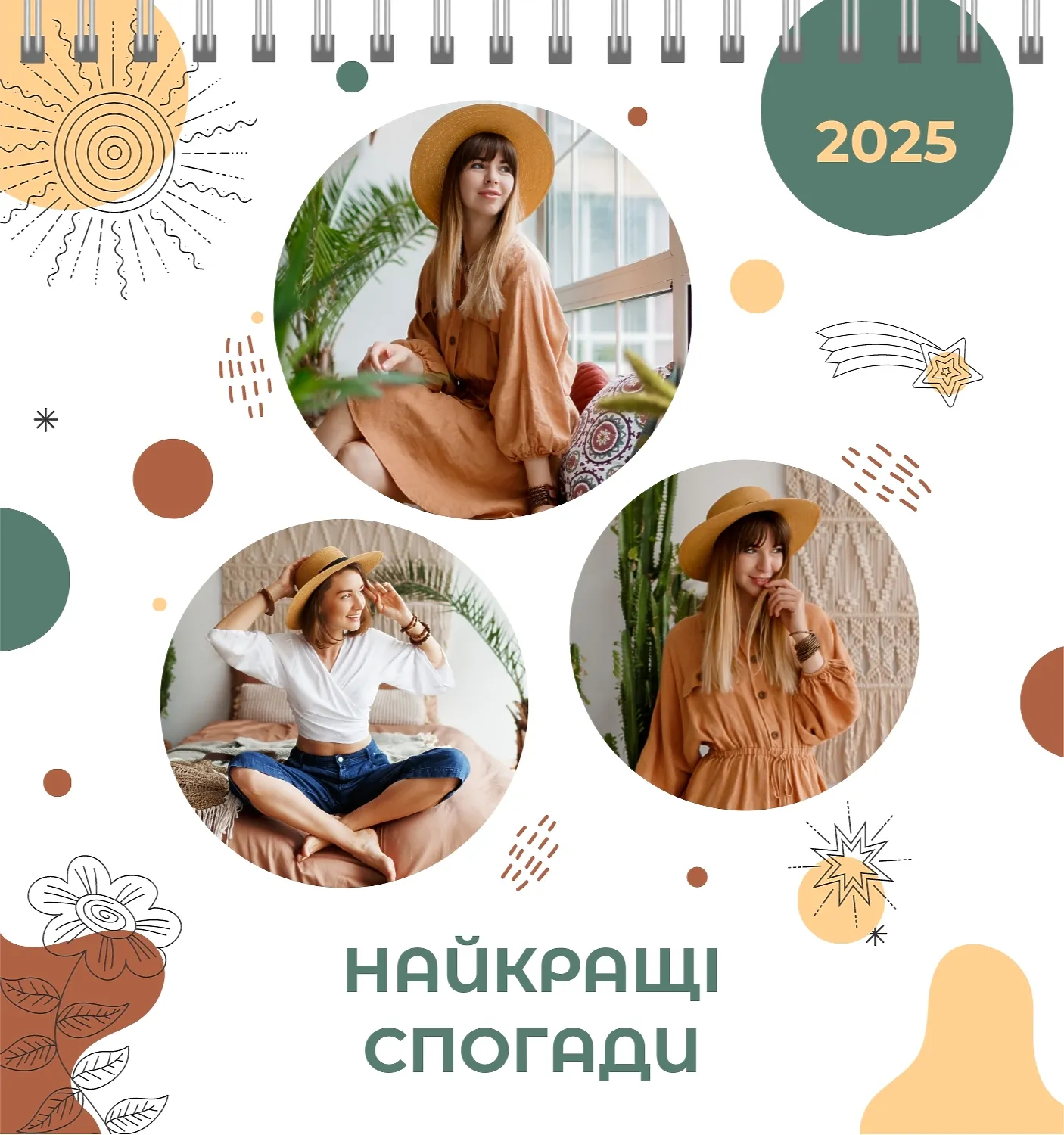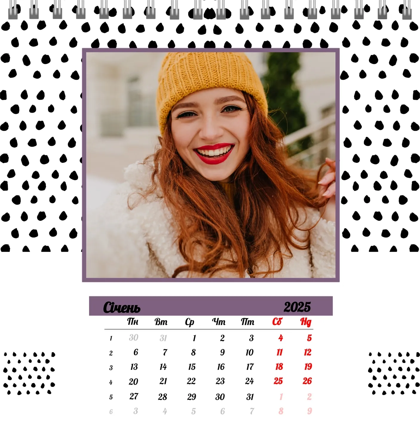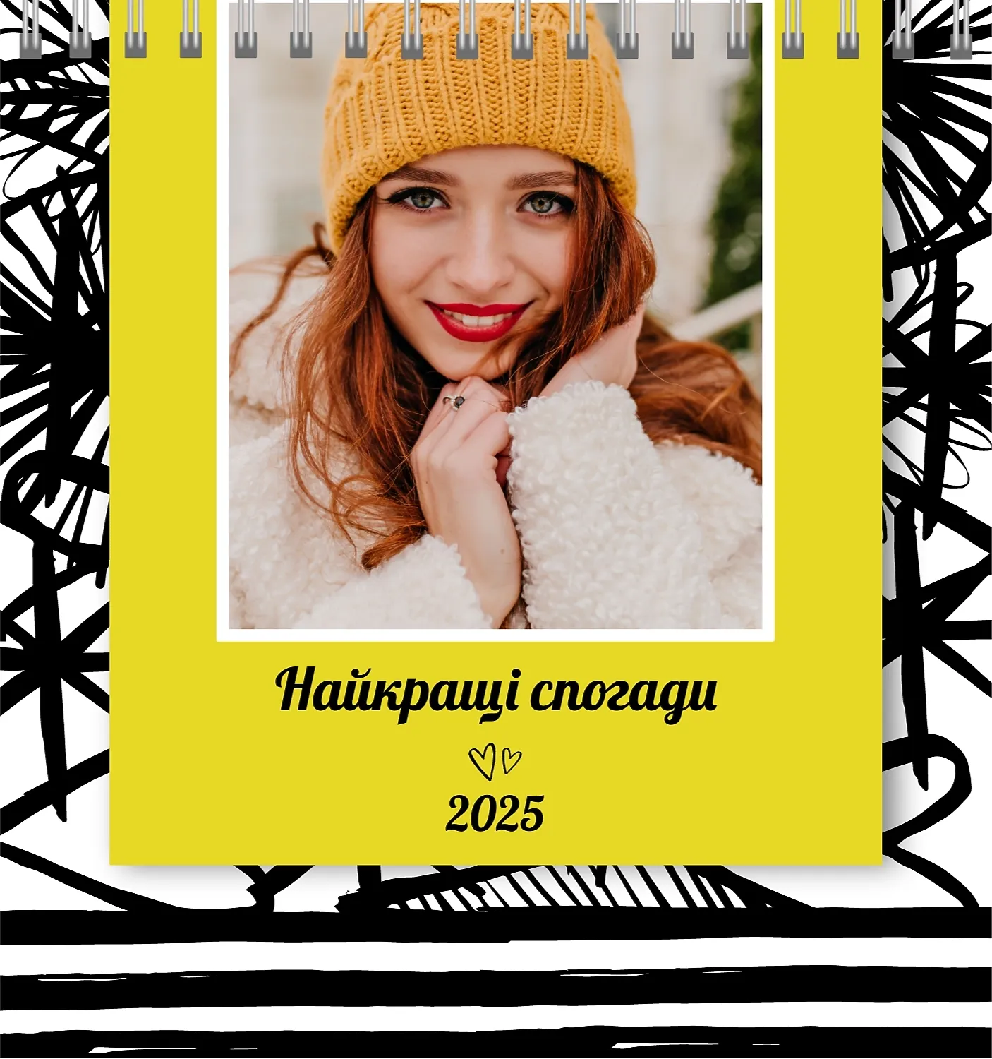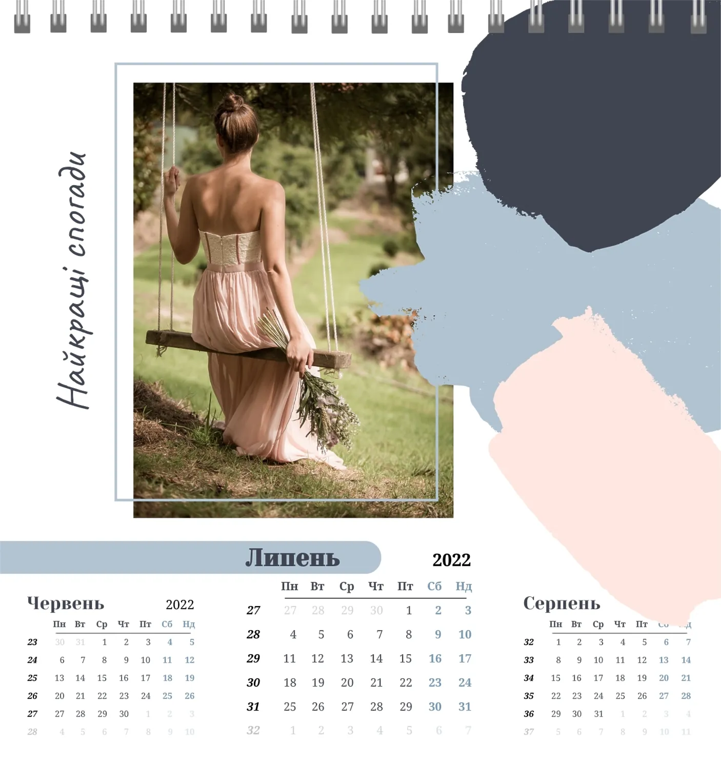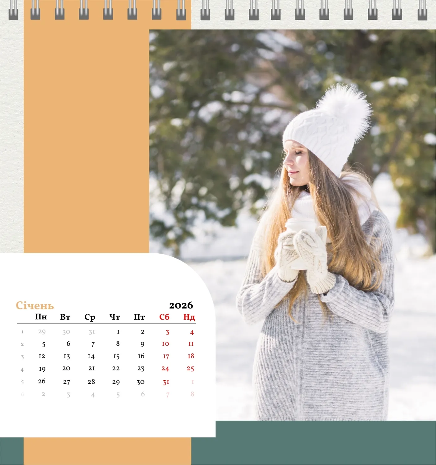 Готовий шаблон настільного календаря на 13 сторінок з особистими фотографіями — це прекрасне рішення для тих, хто хоче створити унікальний і стильний аксесуар для дому, офісу або подарунка. Такий настільний календар ідеально підходить для людей, які цінують індивідуальність і прагнуть оточити себе речами, наповненими змістом і теплими спогадами. Головна перевага шаблону-його доступність в зручному онлайн-конструкторі. Ви можете легко завантажити свої фотографії, змінити розташування елементів, додати текстові коментарі, виділити важливі дати або події. Конструктор дозволяє адаптувати шаблон під ваш стиль: вибрати колірну гамму, шрифт, і навіть налаштувати окремі деталі дизайну. Таким чином, готовий шаблон календаря стає основою для створення повністю персоналізованого продукту. Вам не потрібно володіти спеціальними навичками або завантажувати додаткові програми — вся робота виконується онлайн.