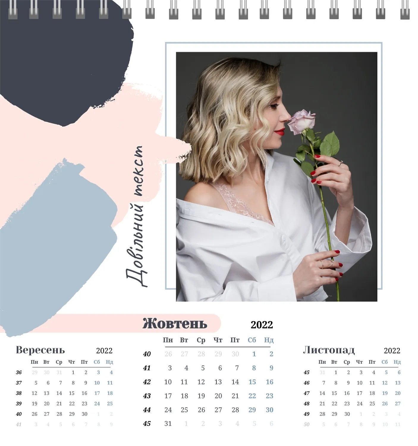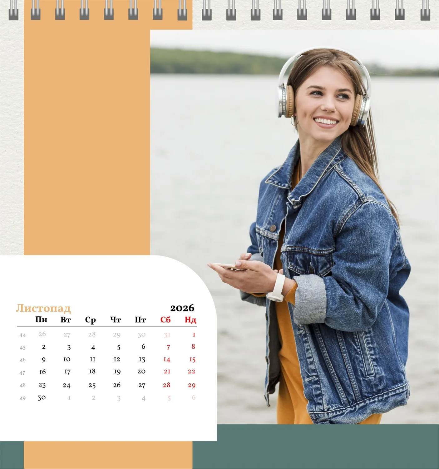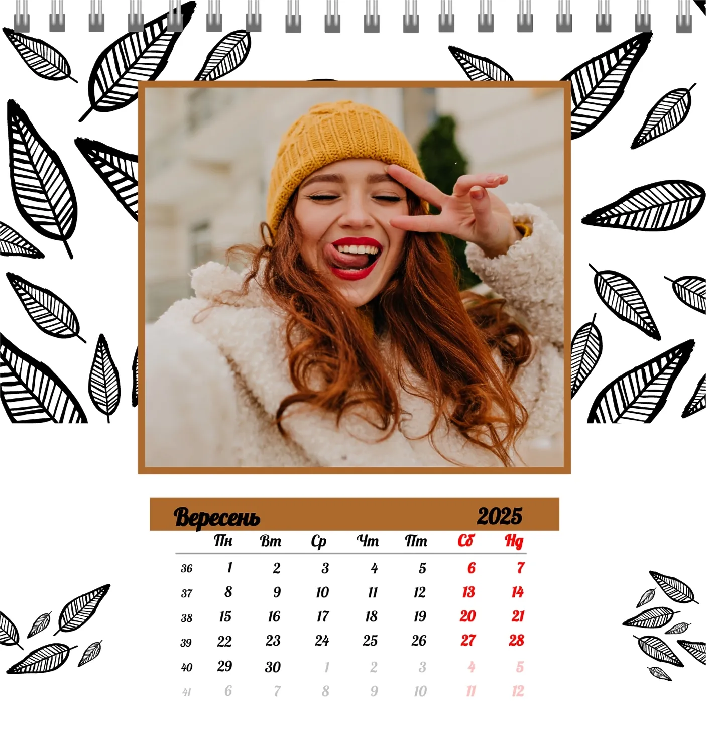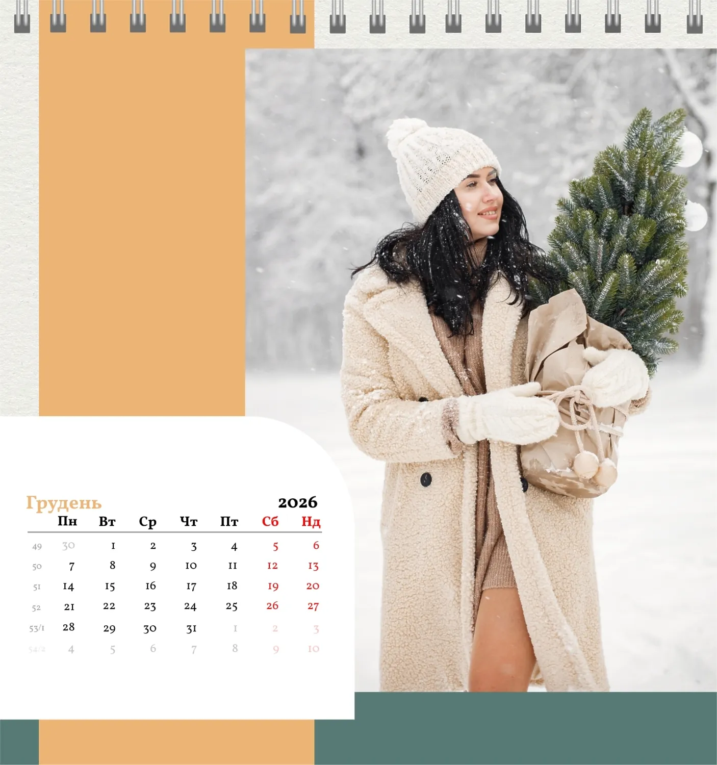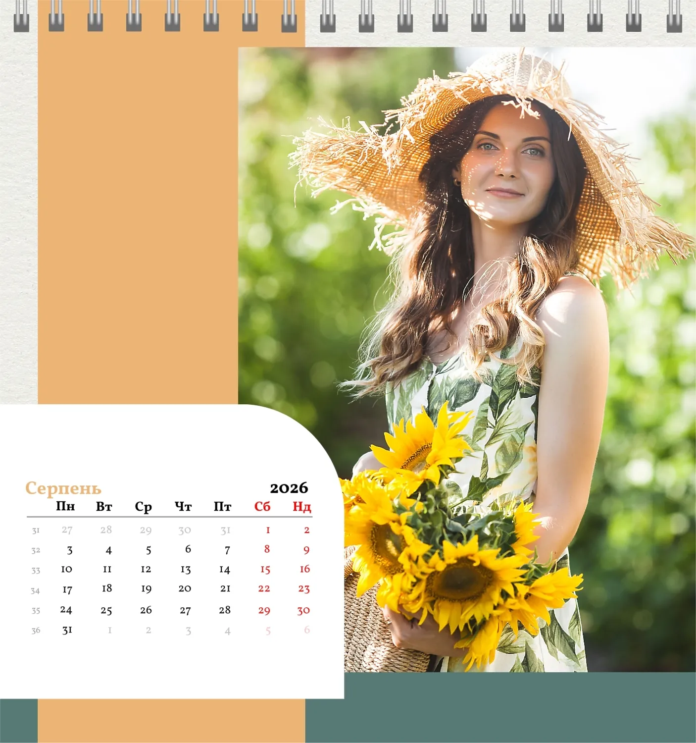 Готовий шаблон настільного календаря на 13 сторінок з особистими фотографіями — це прекрасне рішення для тих, хто хоче створити унікальний і стильний аксесуар для дому, офісу або подарунка. Такий настільний календар ідеально підходить для людей, які цінують індивідуальність і прагнуть оточити себе речами, наповненими змістом і теплими спогадами. Головна перевага шаблону-його доступність в зручному онлайн-конструкторі. Ви можете легко завантажити свої фотографії, змінити розташування елементів, додати текстові коментарі, виділити важливі дати або події. Конструктор дозволяє адаптувати шаблон під ваш стиль: вибрати колірну гамму, шрифт, і навіть налаштувати окремі деталі дизайну. Таким чином, готовий шаблон календаря стає основою для створення повністю персоналізованого продукту. Вам не потрібно володіти спеціальними навичками або завантажувати додаткові програми — вся робота виконується онлайн.