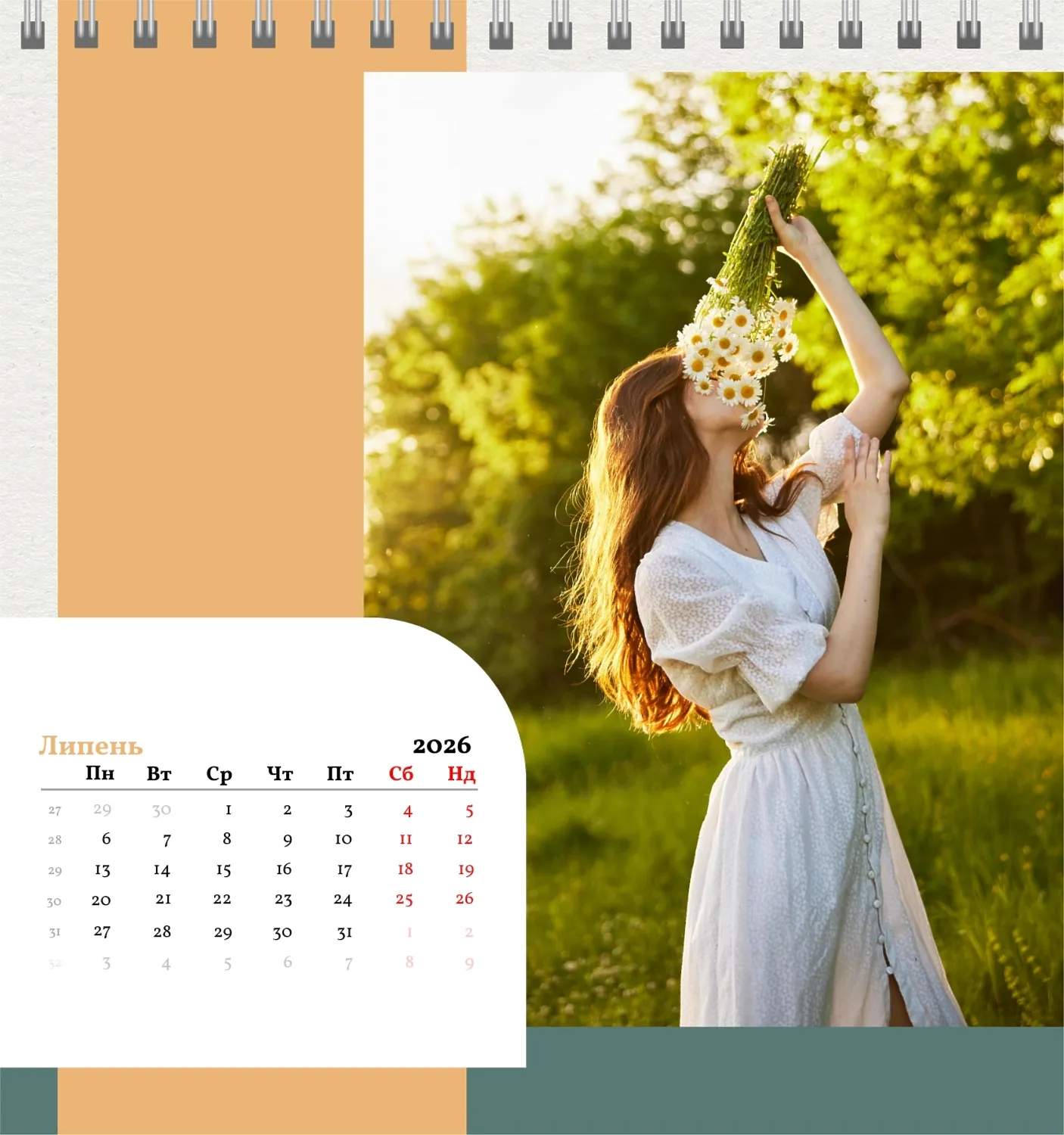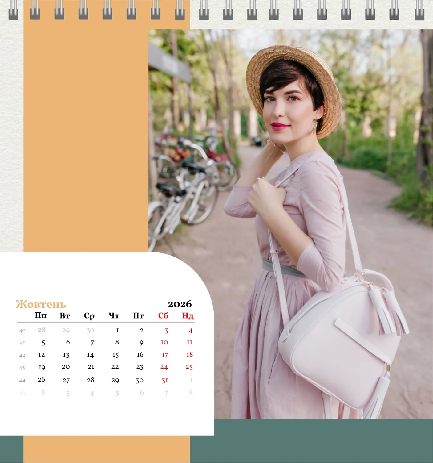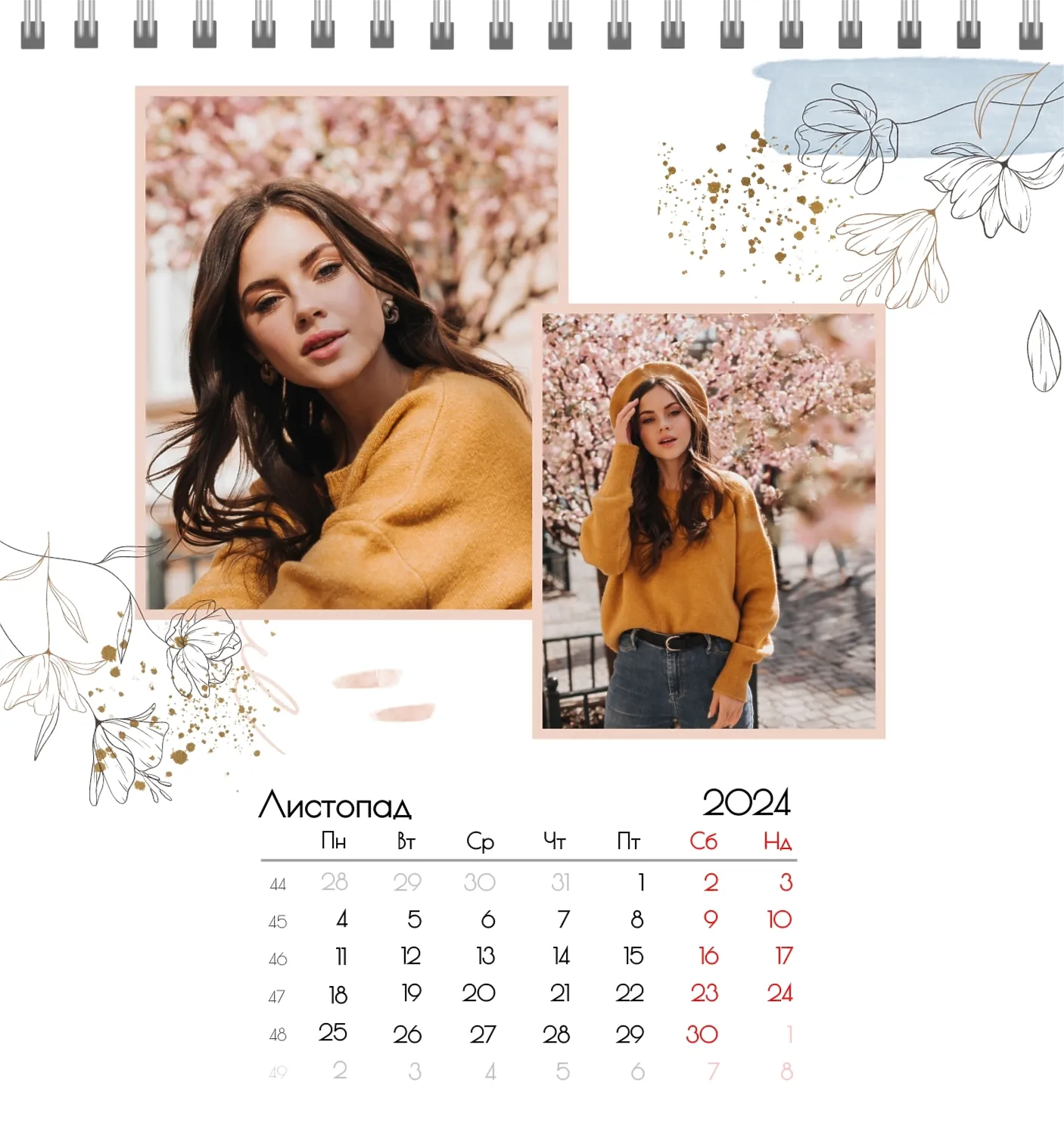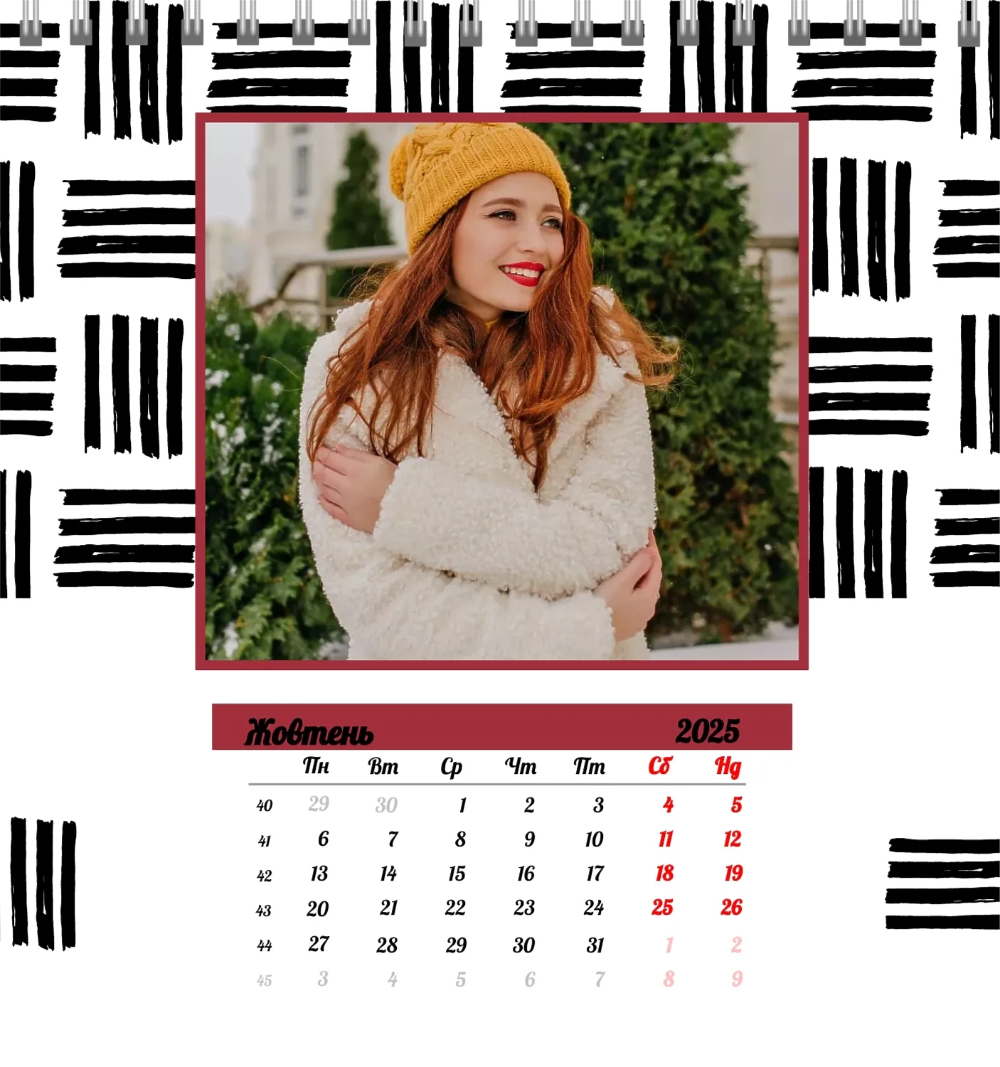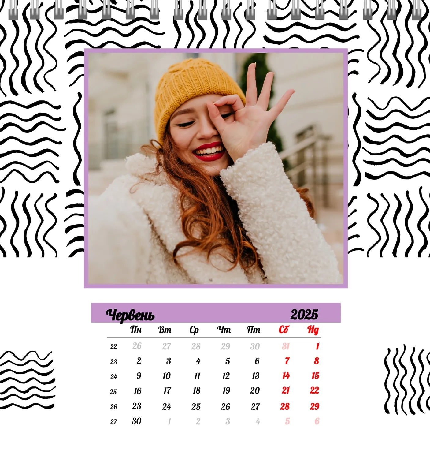 Готовий шаблон настільного календаря на 13 сторінок з особистими фотографіями — це прекрасне рішення для тих, хто хоче створити унікальний і стильний аксесуар для дому, офісу або подарунка. Такий настільний календар ідеально підходить для людей, які цінують індивідуальність і прагнуть оточити себе речами, наповненими змістом і теплими спогадами. Головна перевага шаблону-його доступність в зручному онлайн-конструкторі. Ви можете легко завантажити свої фотографії, змінити розташування елементів, додати текстові коментарі, виділити важливі дати або події. Конструктор дозволяє адаптувати шаблон під ваш стиль: вибрати колірну гамму, шрифт, і навіть налаштувати окремі деталі дизайну. Таким чином, готовий шаблон календаря стає основою для створення повністю персоналізованого продукту. Вам не потрібно володіти спеціальними навичками або завантажувати додаткові програми — вся робота виконується онлайн.