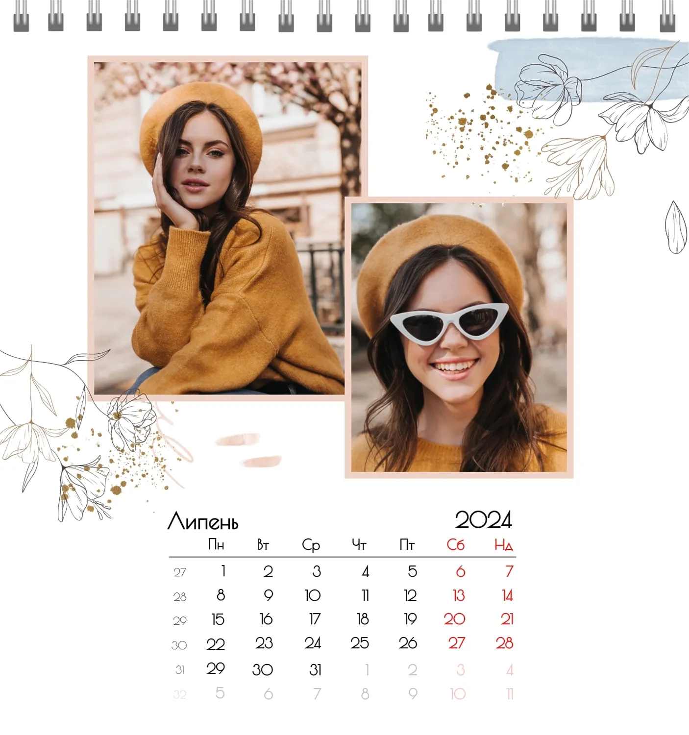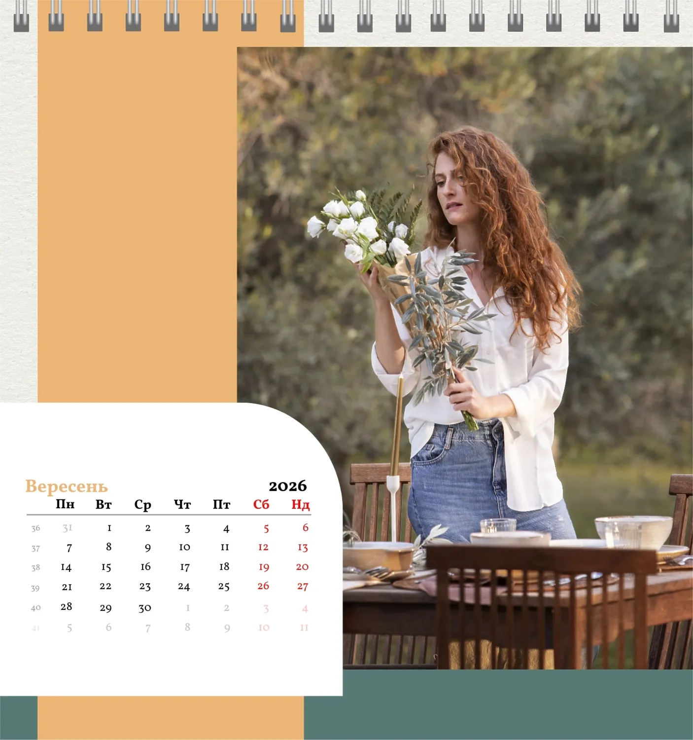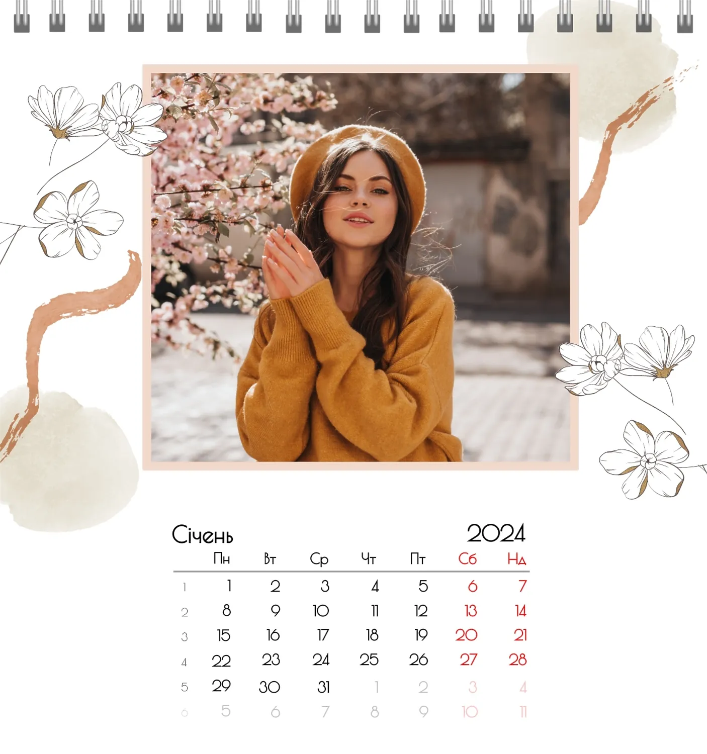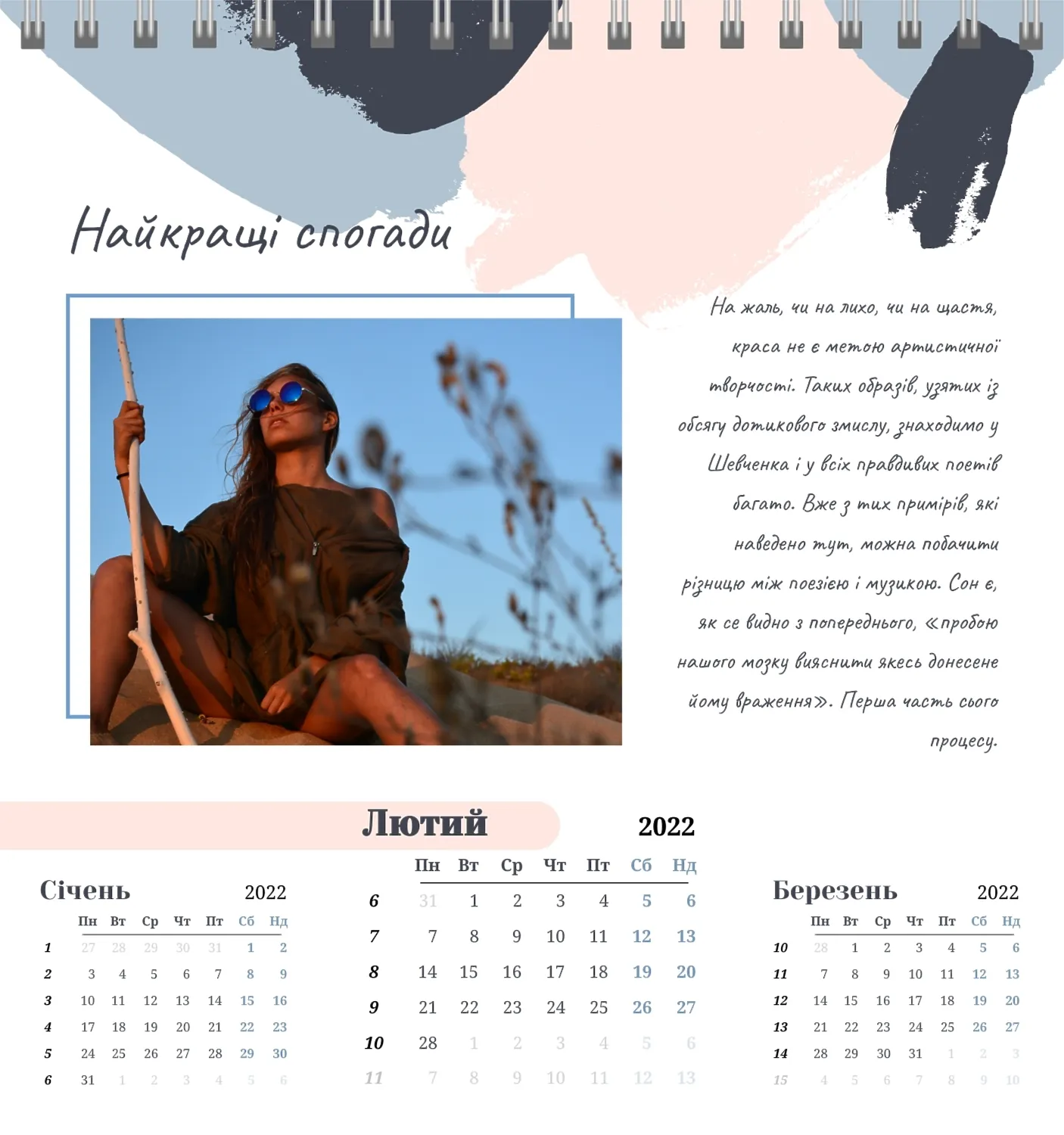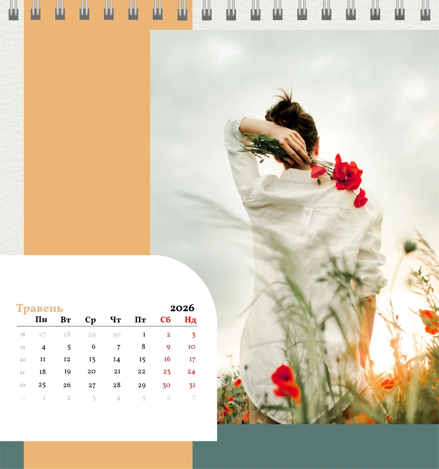 Готовий шаблон настільного календаря на 13 сторінок з особистими фотографіями — це прекрасне рішення для тих, хто хоче створити унікальний і стильний аксесуар для дому, офісу або подарунка. Такий настільний календар ідеально підходить для людей, які цінують індивідуальність і прагнуть оточити себе речами, наповненими змістом і теплими спогадами. Головна перевага шаблону-його доступність в зручному онлайн-конструкторі. Ви можете легко завантажити свої фотографії, змінити розташування елементів, додати текстові коментарі, виділити важливі дати або події. Конструктор дозволяє адаптувати шаблон під ваш стиль: вибрати колірну гамму, шрифт, і навіть налаштувати окремі деталі дизайну. Таким чином, готовий шаблон календаря стає основою для створення повністю персоналізованого продукту. Вам не потрібно володіти спеціальними навичками або завантажувати додаткові програми — вся робота виконується онлайн.