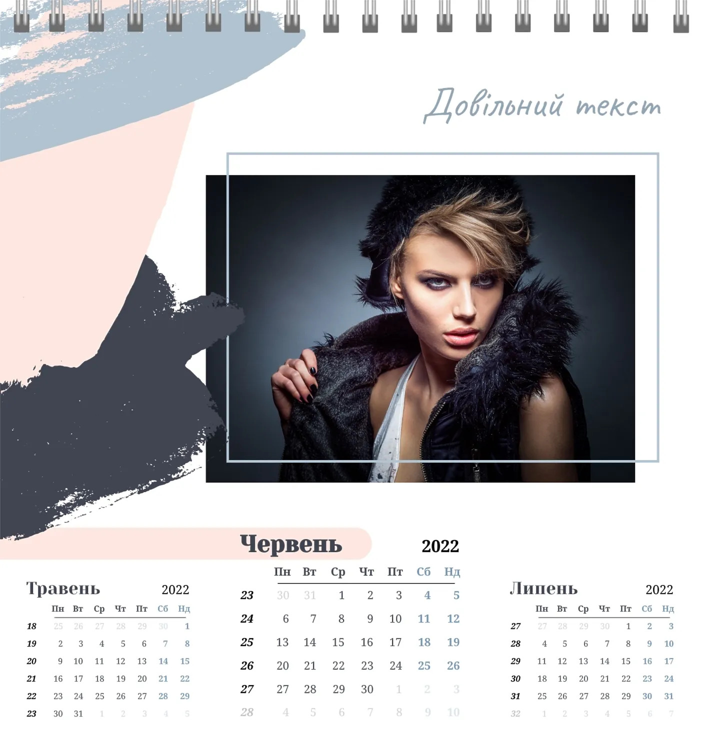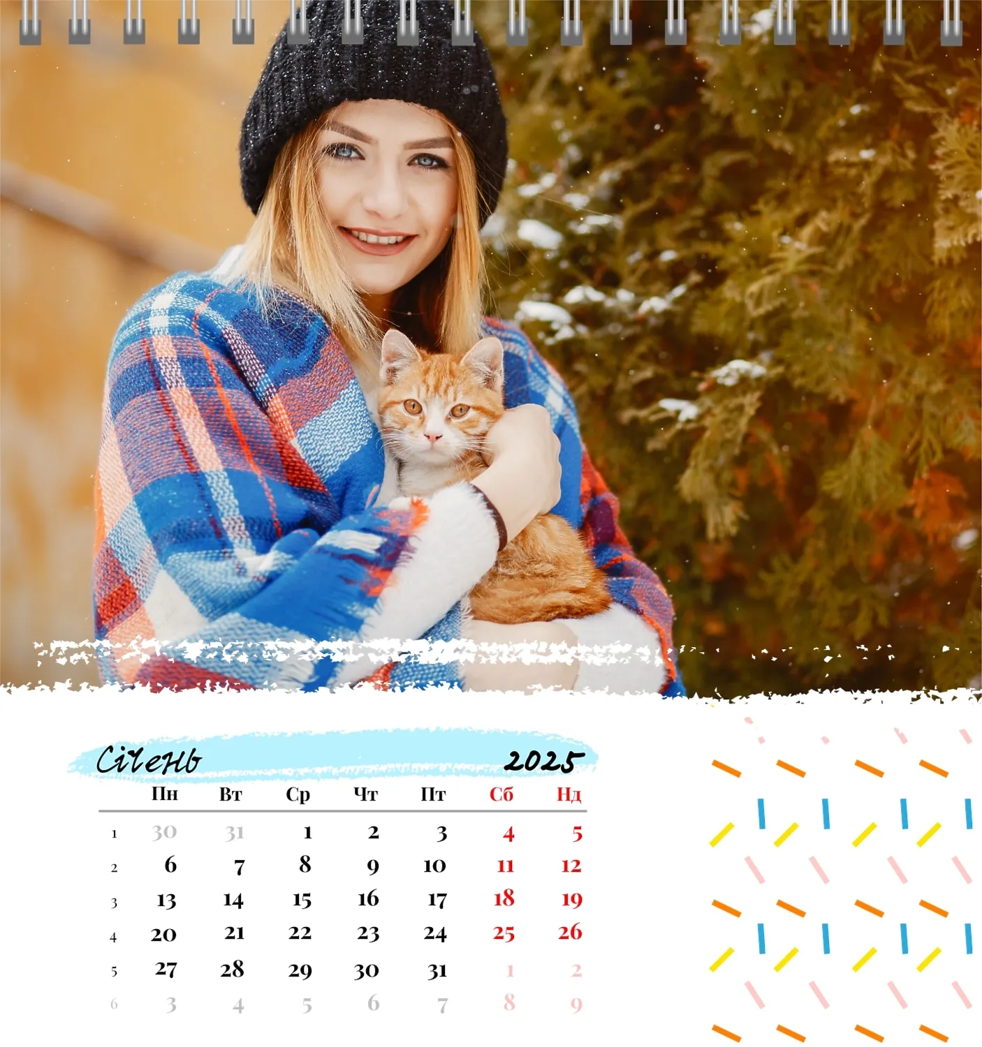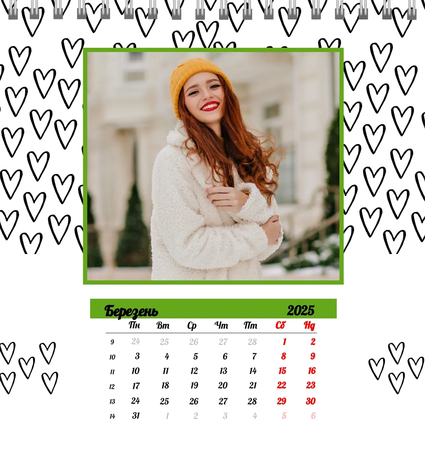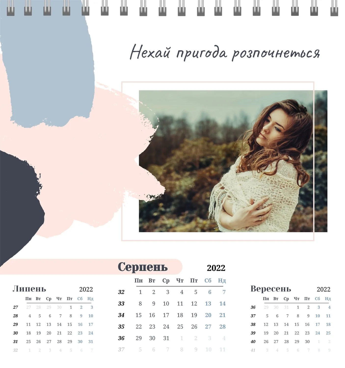 Готовий шаблон настільного календаря на 13 сторінок з особистими фотографіями — це прекрасне рішення для тих, хто хоче створити унікальний і стильний аксесуар для дому, офісу або подарунка. Такий настільний календар ідеально підходить для людей, які цінують індивідуальність і прагнуть оточити себе речами, наповненими змістом і теплими спогадами. Головна перевага шаблону-його доступність в зручному онлайн-конструкторі. Ви можете легко завантажити свої фотографії, змінити розташування елементів, додати текстові коментарі, виділити важливі дати або події. Конструктор дозволяє адаптувати шаблон під ваш стиль: вибрати колірну гамму, шрифт, і навіть налаштувати окремі деталі дизайну. Таким чином, готовий шаблон календаря стає основою для створення повністю персоналізованого продукту. Вам не потрібно володіти спеціальними навичками або завантажувати додаткові програми — вся робота виконується онлайн.
