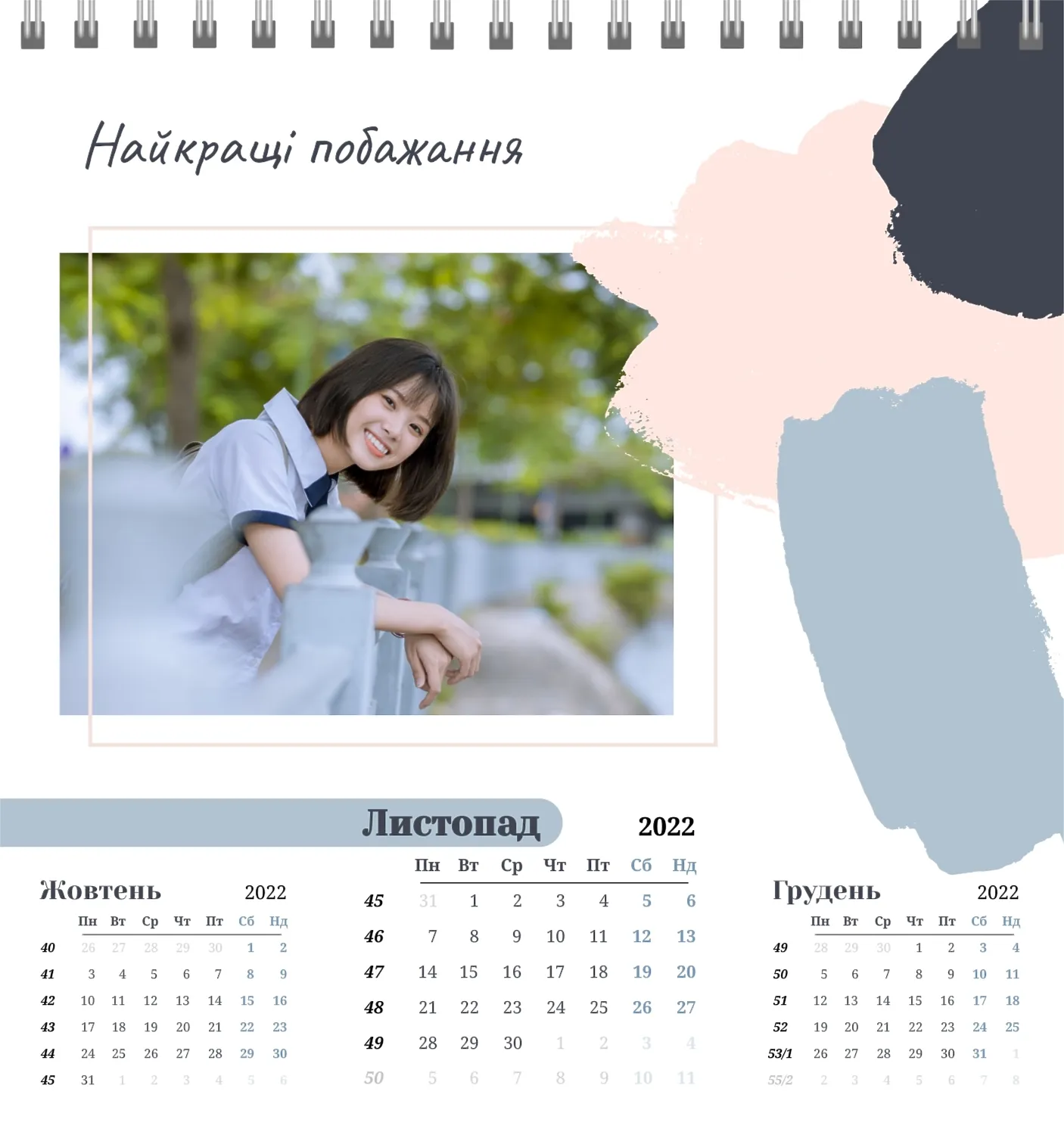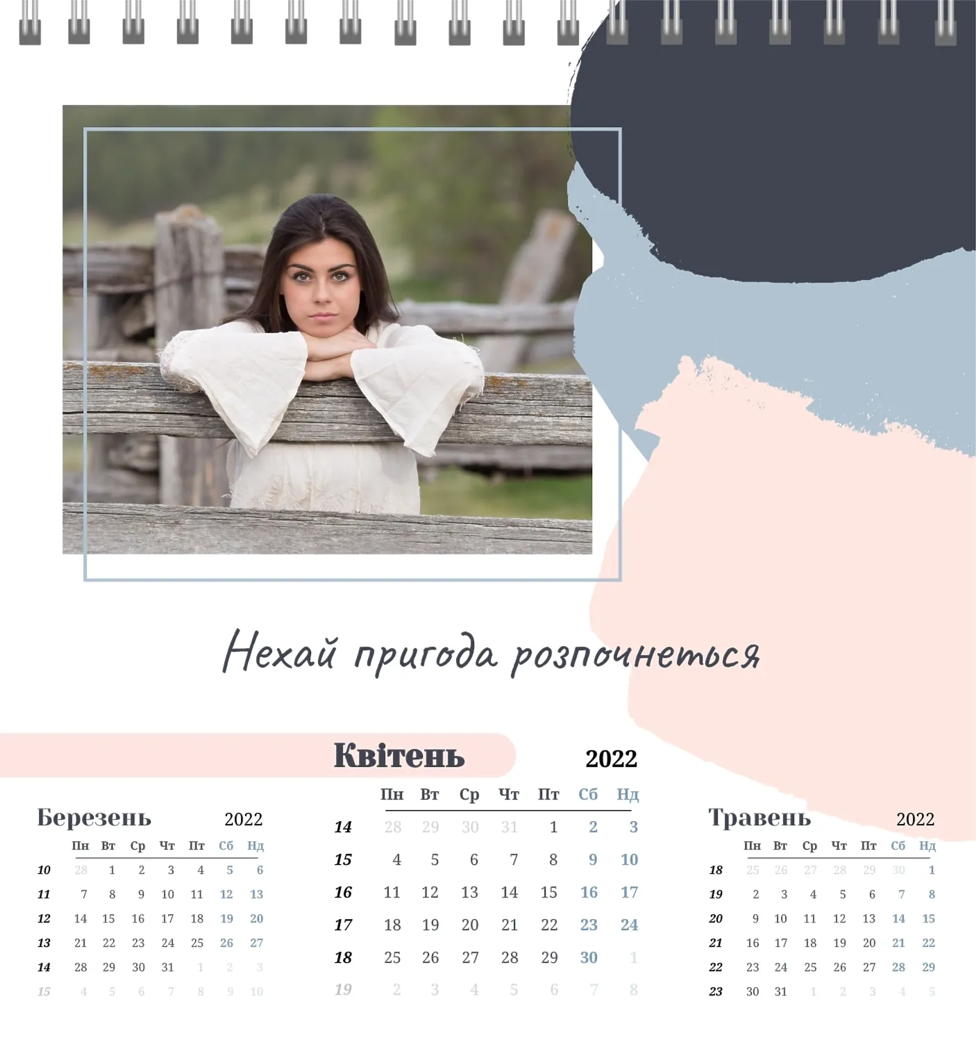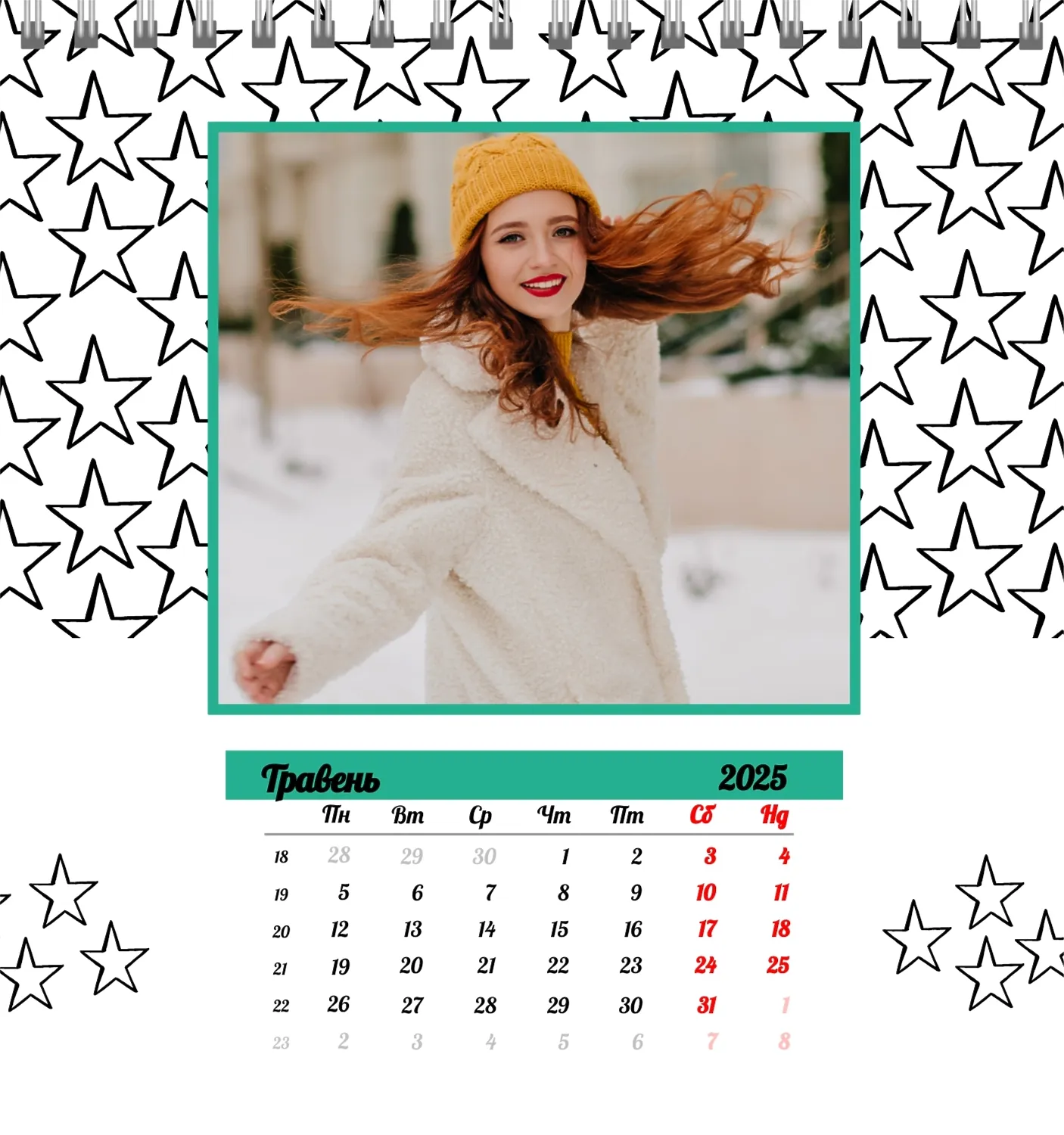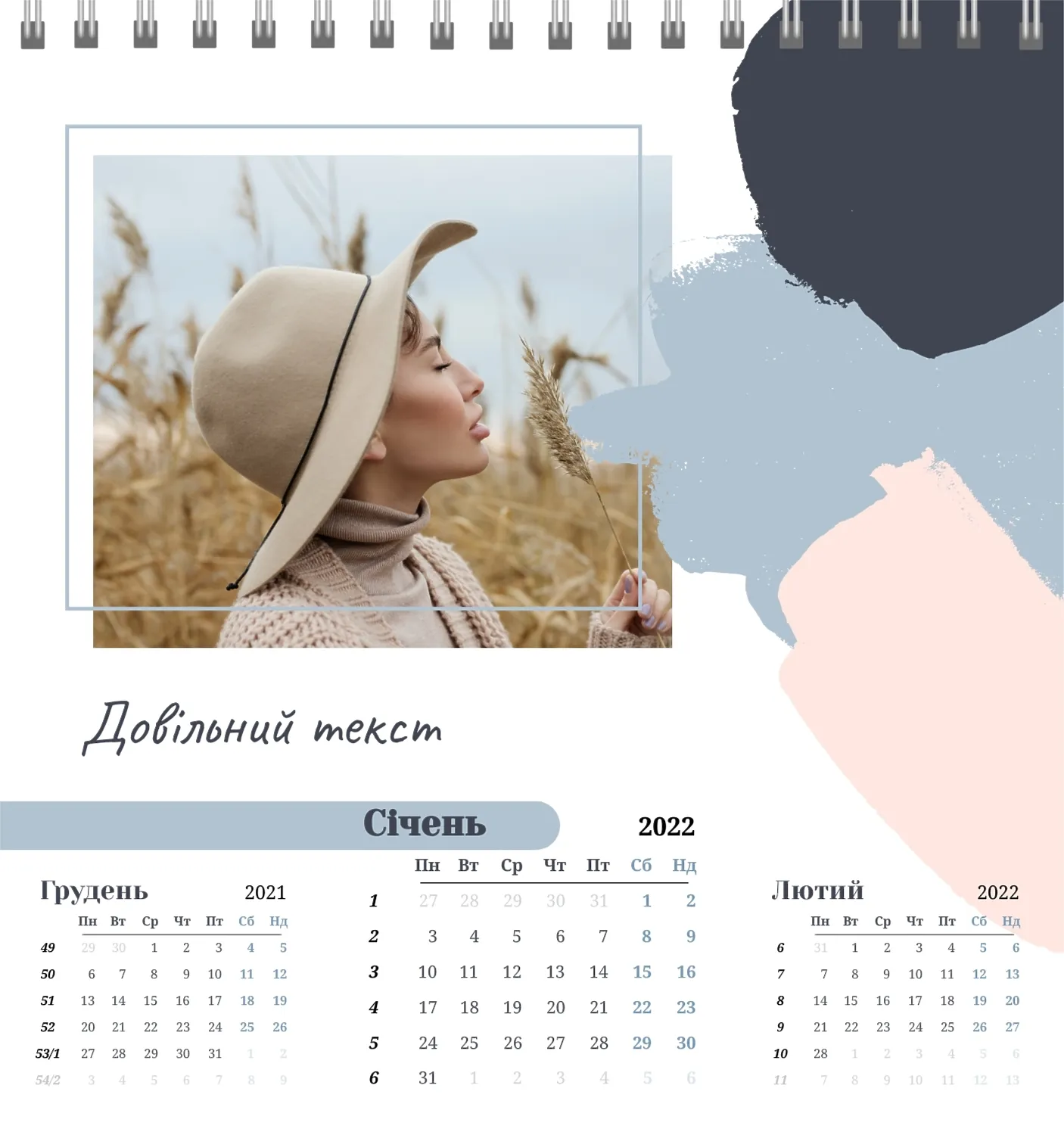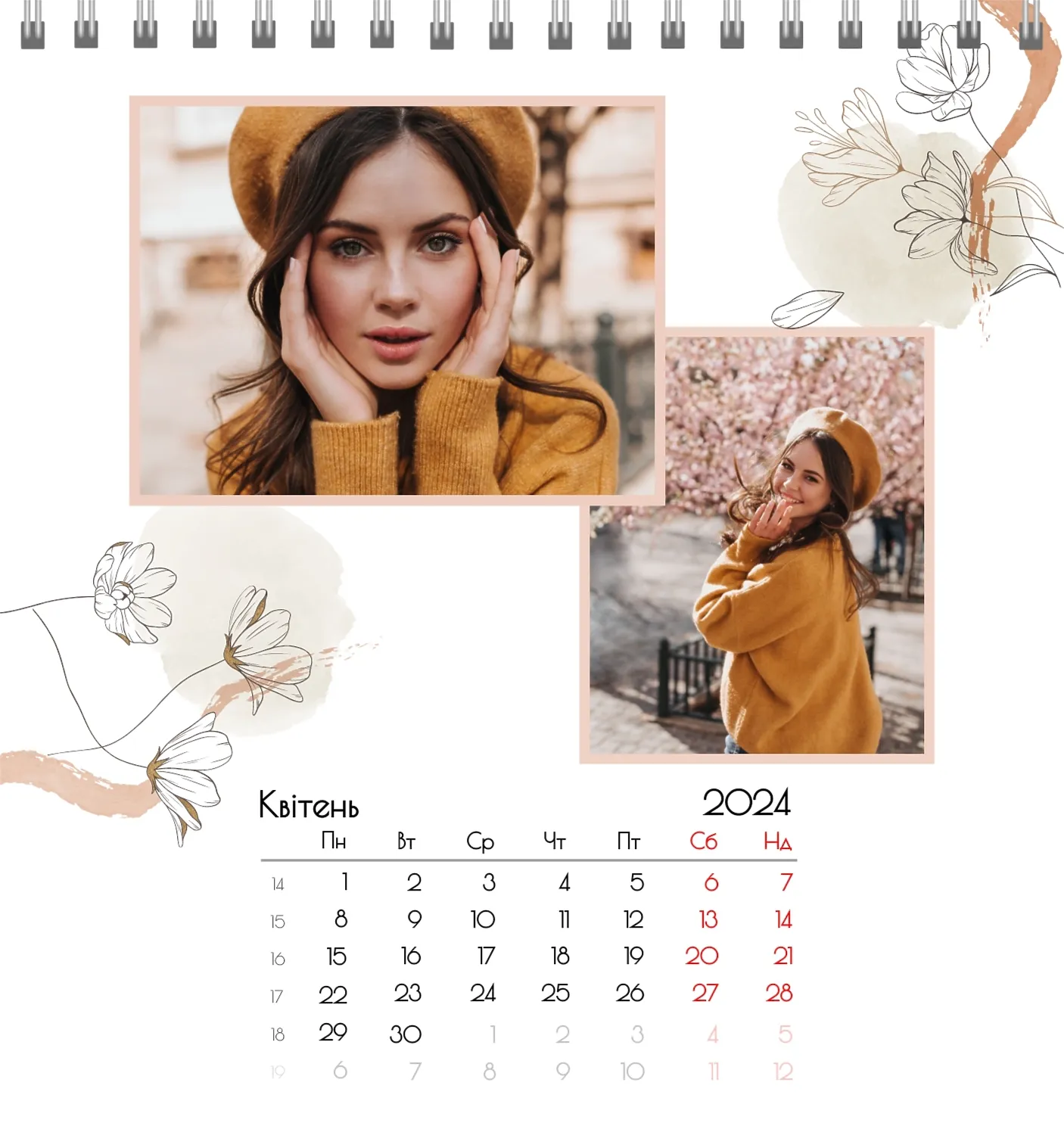 Готовий шаблон настільного календаря на 13 сторінок з особистими фотографіями — це прекрасне рішення для тих, хто хоче створити унікальний і стильний аксесуар для дому, офісу або подарунка. Такий настільний календар ідеально підходить для людей, які цінують індивідуальність і прагнуть оточити себе речами, наповненими змістом і теплими спогадами. Головна перевага шаблону-його доступність в зручному онлайн-конструкторі. Ви можете легко завантажити свої фотографії, змінити розташування елементів, додати текстові коментарі, виділити важливі дати або події. Конструктор дозволяє адаптувати шаблон під ваш стиль: вибрати колірну гамму, шрифт, і навіть налаштувати окремі деталі дизайну. Таким чином, готовий шаблон календаря стає основою для створення повністю персоналізованого продукту. Вам не потрібно володіти спеціальними навичками або завантажувати додаткові програми — вся робота виконується онлайн.