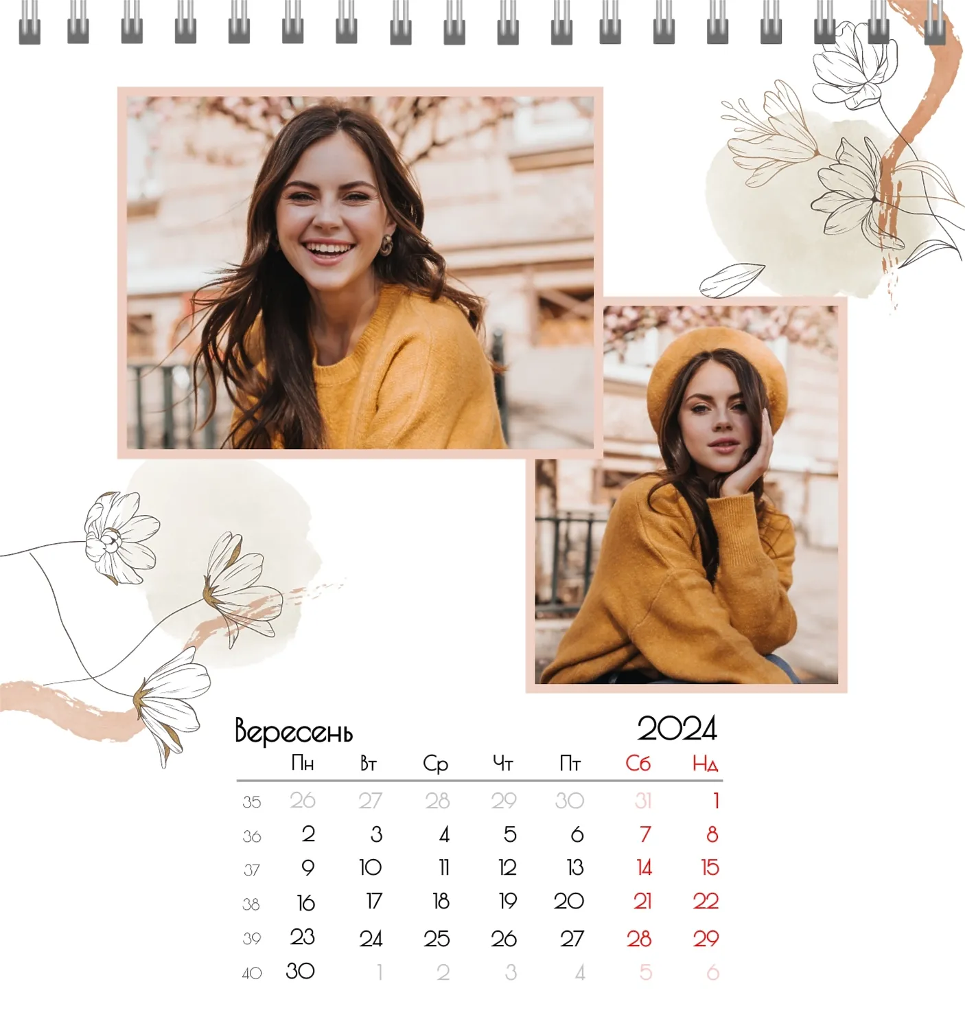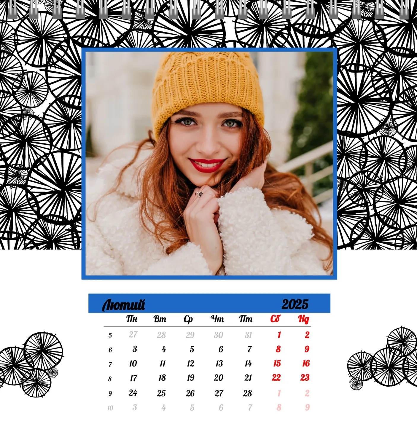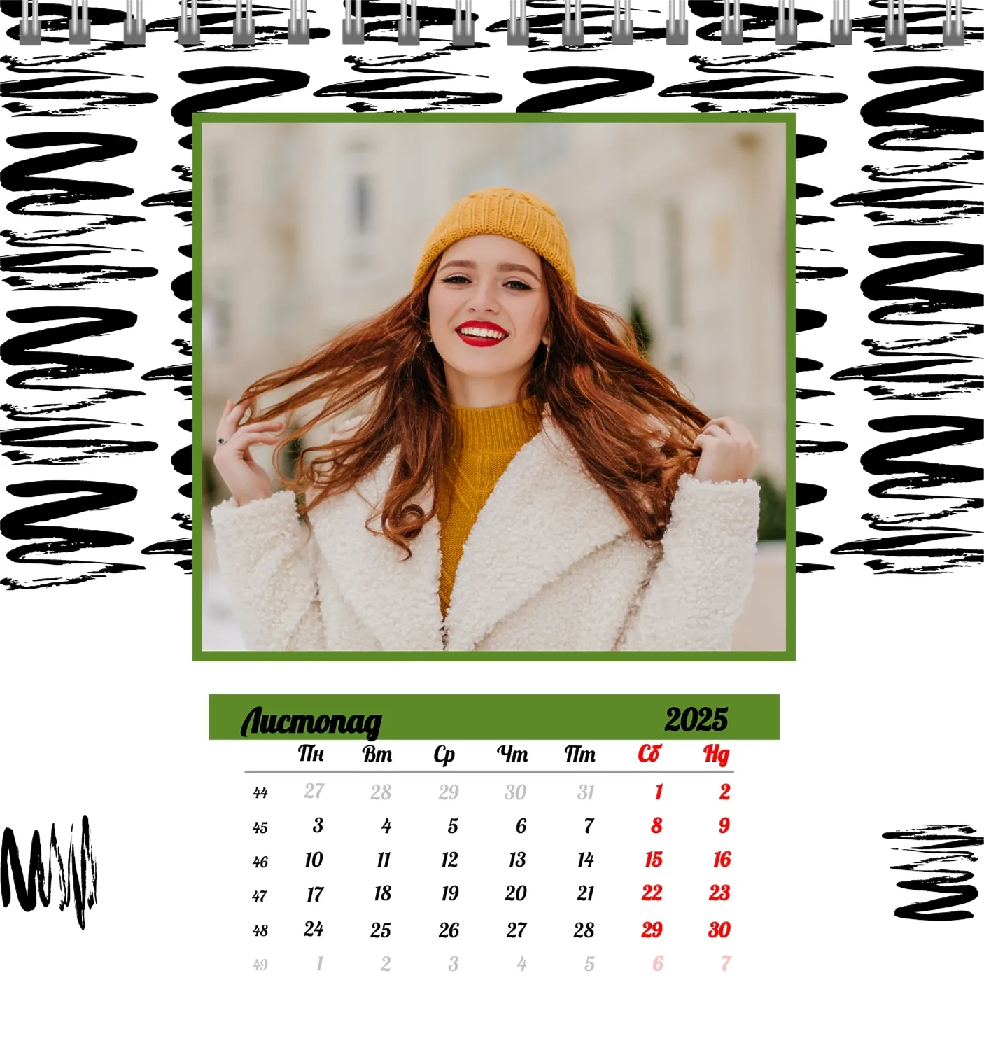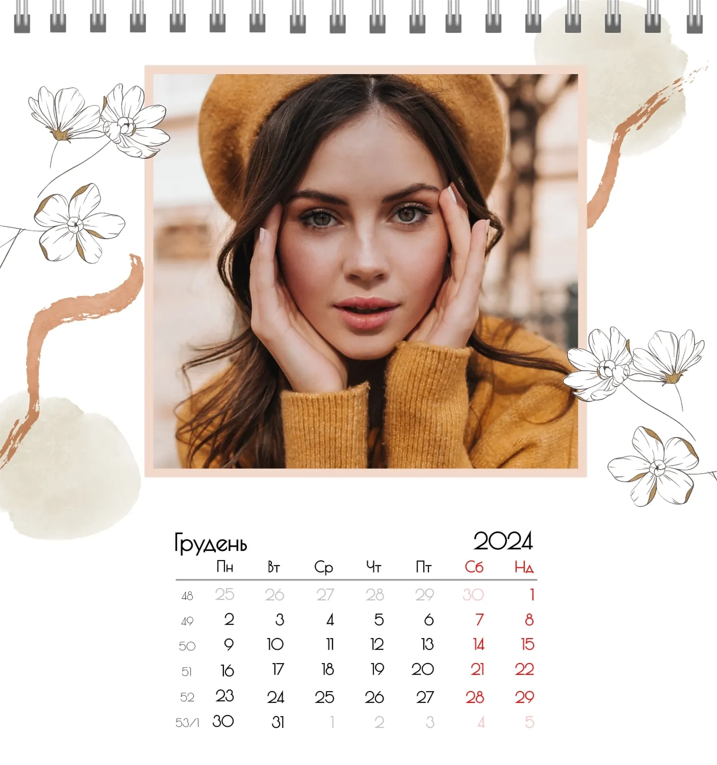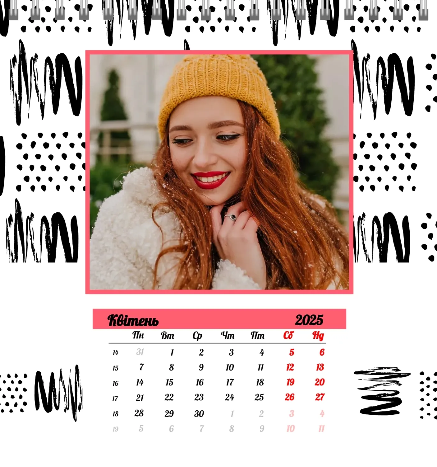 Готовий шаблон настільного календаря на 13 сторінок з особистими фотографіями — це прекрасне рішення для тих, хто хоче створити унікальний і стильний аксесуар для дому, офісу або подарунка. Такий настільний календар ідеально підходить для людей, які цінують індивідуальність і прагнуть оточити себе речами, наповненими змістом і теплими спогадами. Головна перевага шаблону-його доступність в зручному онлайн-конструкторі. Ви можете легко завантажити свої фотографії, змінити розташування елементів, додати текстові коментарі, виділити важливі дати або події. Конструктор дозволяє адаптувати шаблон під ваш стиль: вибрати колірну гамму, шрифт, і навіть налаштувати окремі деталі дизайну. Таким чином, готовий шаблон календаря стає основою для створення повністю персоналізованого продукту. Вам не потрібно володіти спеціальними навичками або завантажувати додаткові програми — вся робота виконується онлайн.