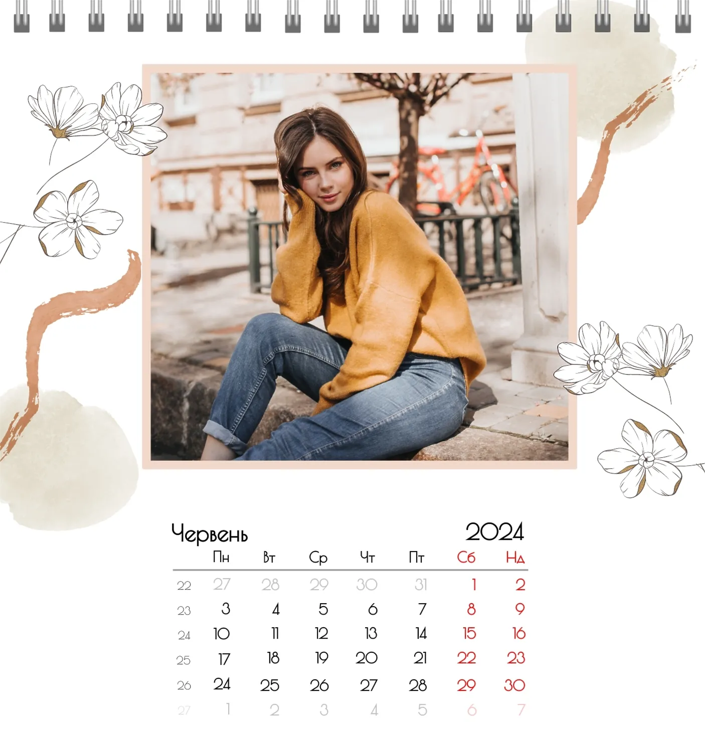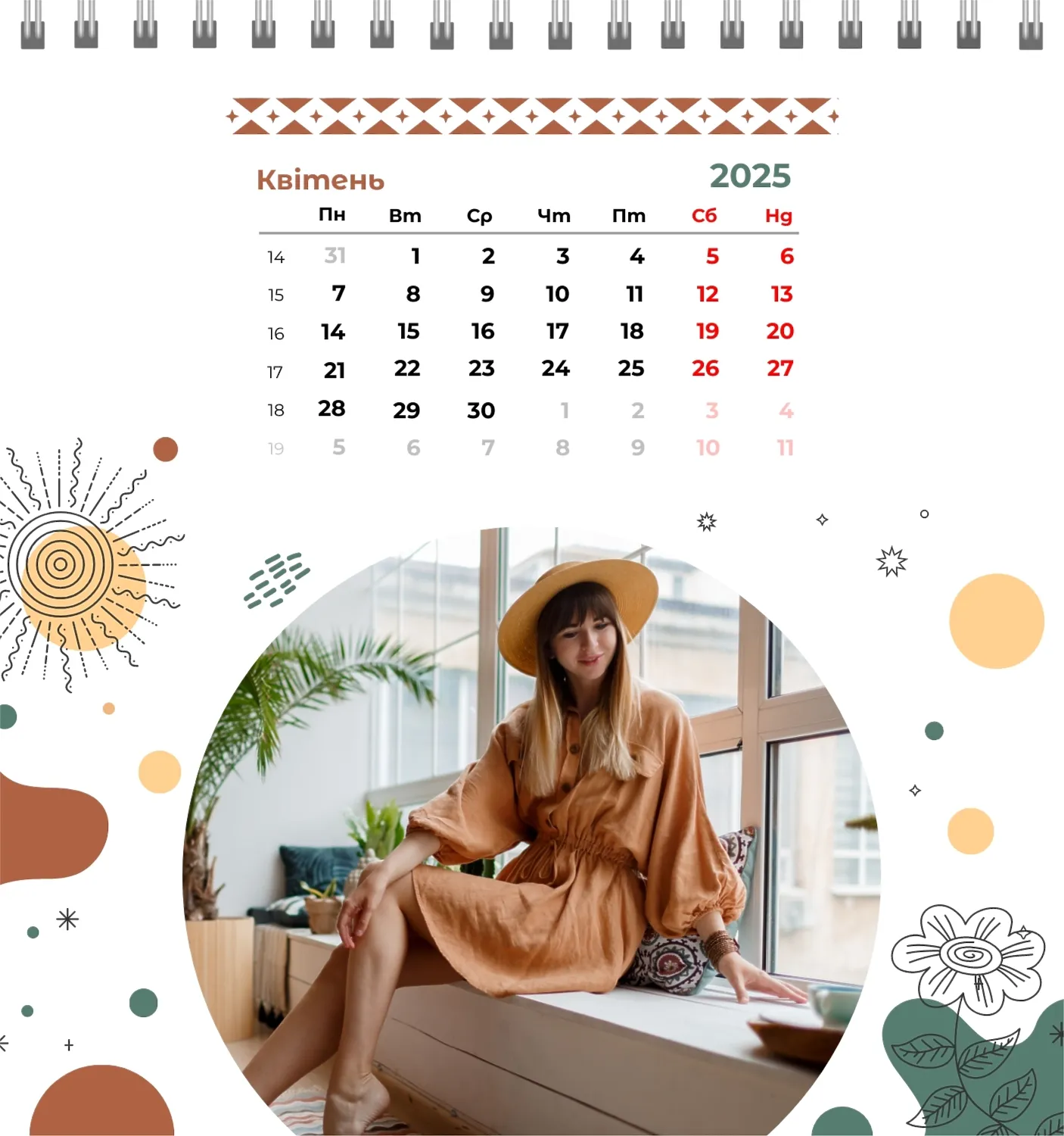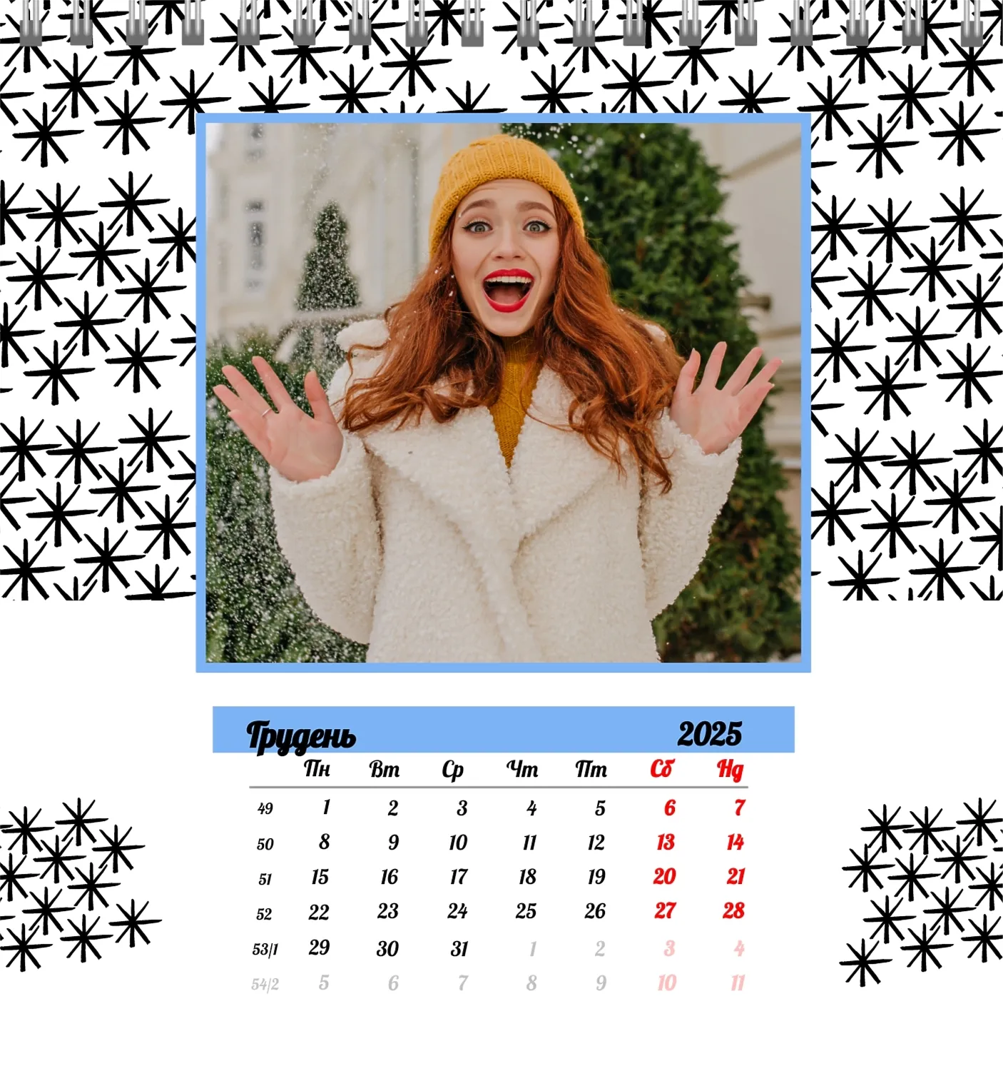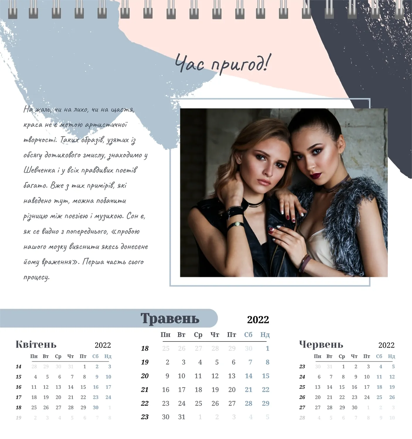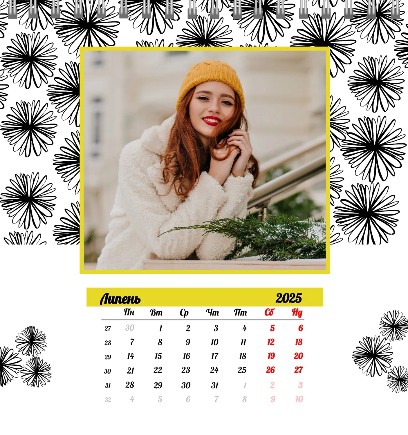 Готовий шаблон настільного календаря на 13 сторінок з особистими фотографіями — це прекрасне рішення для тих, хто хоче створити унікальний і стильний аксесуар для дому, офісу або подарунка. Такий настільний календар ідеально підходить для людей, які цінують індивідуальність і прагнуть оточити себе речами, наповненими змістом і теплими спогадами. Головна перевага шаблону-його доступність в зручному онлайн-конструкторі. Ви можете легко завантажити свої фотографії, змінити розташування елементів, додати текстові коментарі, виділити важливі дати або події. Конструктор дозволяє адаптувати шаблон під ваш стиль: вибрати колірну гамму, шрифт, і навіть налаштувати окремі деталі дизайну. Таким чином, готовий шаблон календаря стає основою для створення повністю персоналізованого продукту. Вам не потрібно володіти спеціальними навичками або завантажувати додаткові програми — вся робота виконується онлайн.
