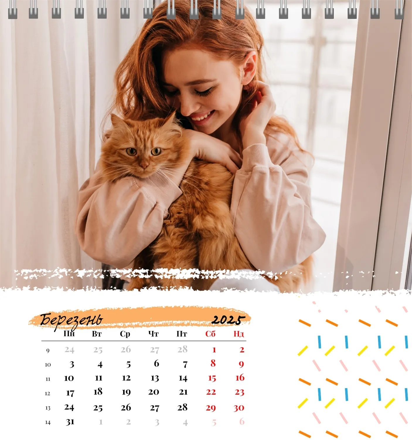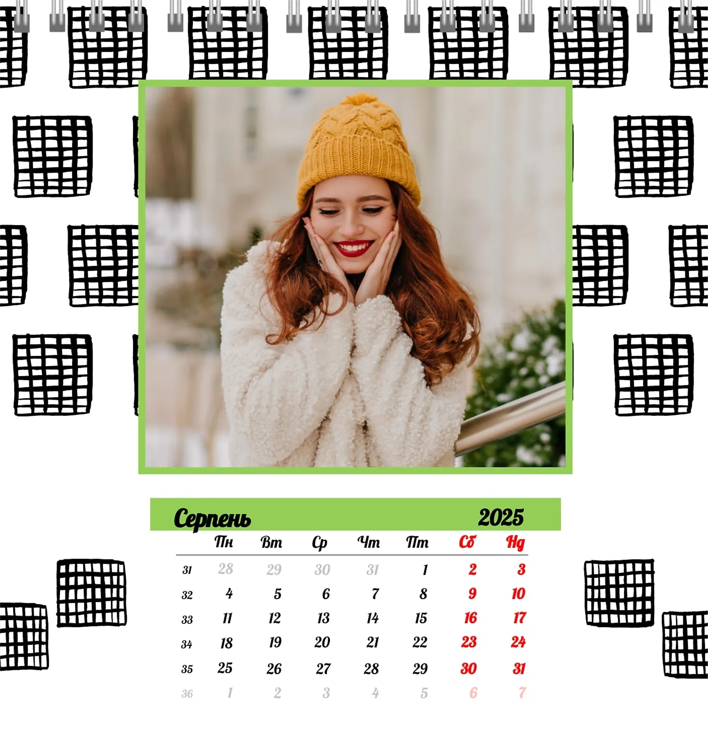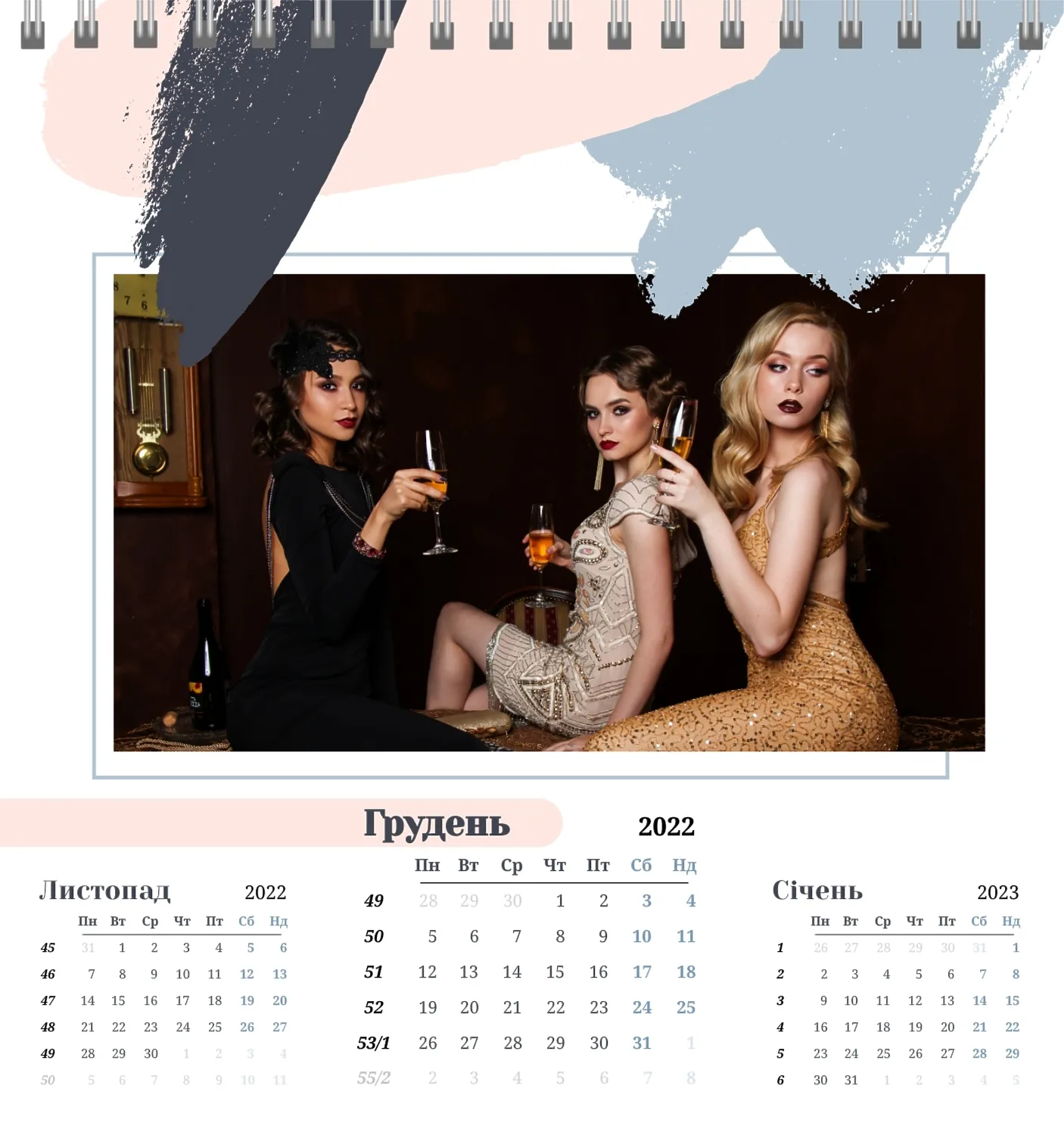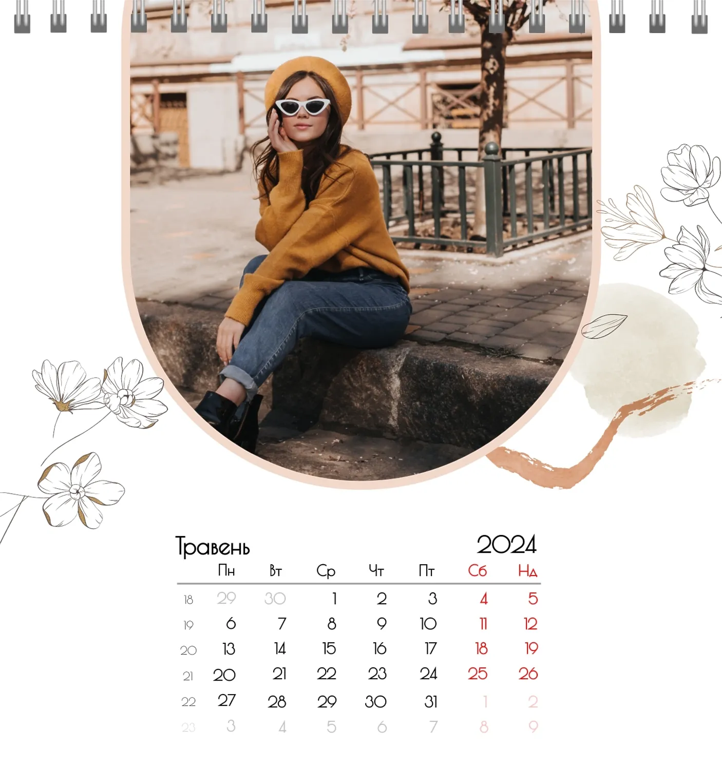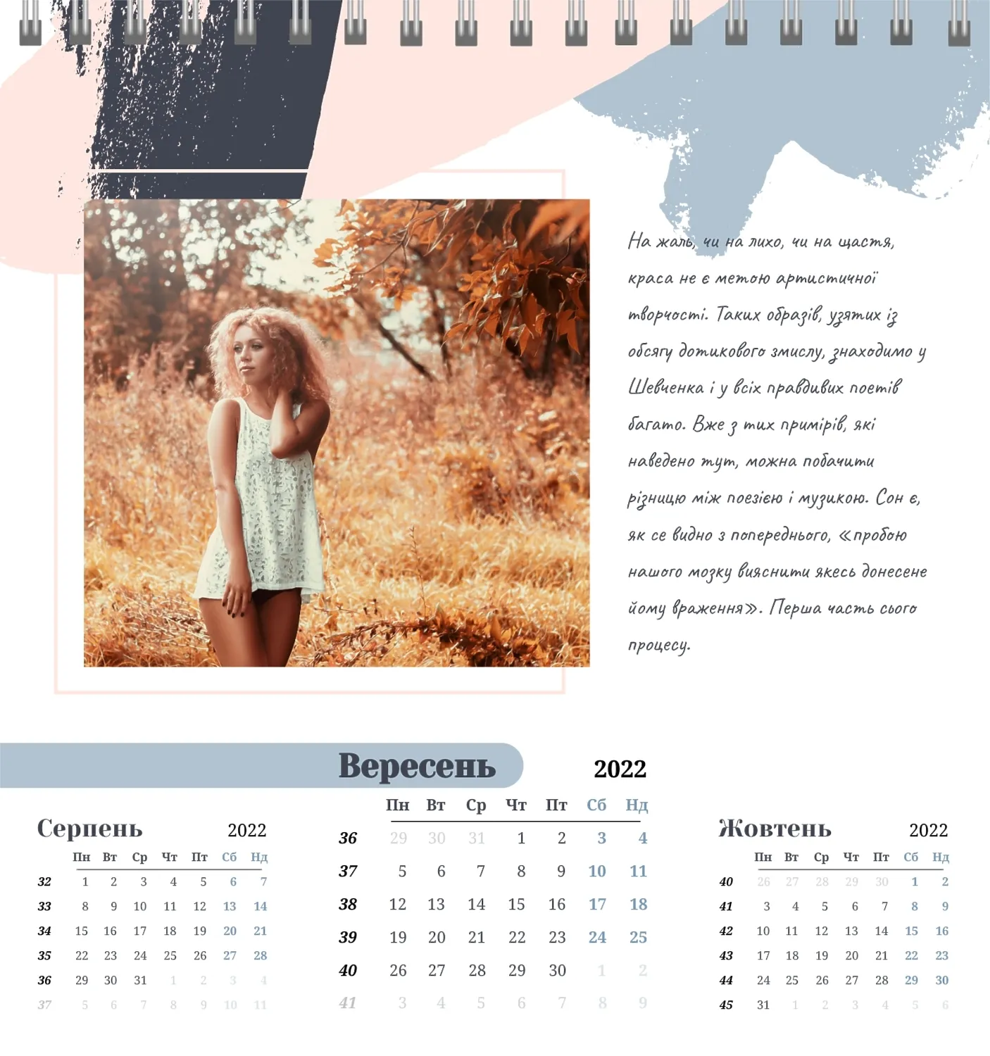 Готовий шаблон настільного календаря на 13 сторінок з особистими фотографіями — це прекрасне рішення для тих, хто хоче створити унікальний і стильний аксесуар для дому, офісу або подарунка. Такий настільний календар ідеально підходить для людей, які цінують індивідуальність і прагнуть оточити себе речами, наповненими змістом і теплими спогадами. Головна перевага шаблону-його доступність в зручному онлайн-конструкторі. Ви можете легко завантажити свої фотографії, змінити розташування елементів, додати текстові коментарі, виділити важливі дати або події. Конструктор дозволяє адаптувати шаблон під ваш стиль: вибрати колірну гамму, шрифт, і навіть налаштувати окремі деталі дизайну. Таким чином, готовий шаблон календаря стає основою для створення повністю персоналізованого продукту. Вам не потрібно володіти спеціальними навичками або завантажувати додаткові програми — вся робота виконується онлайн.