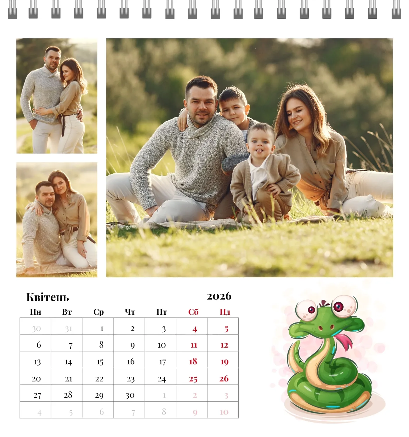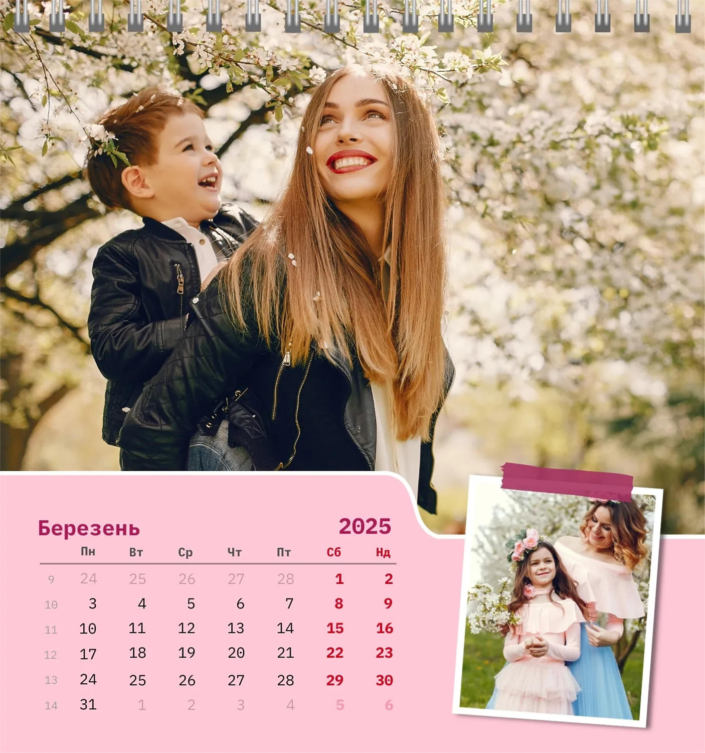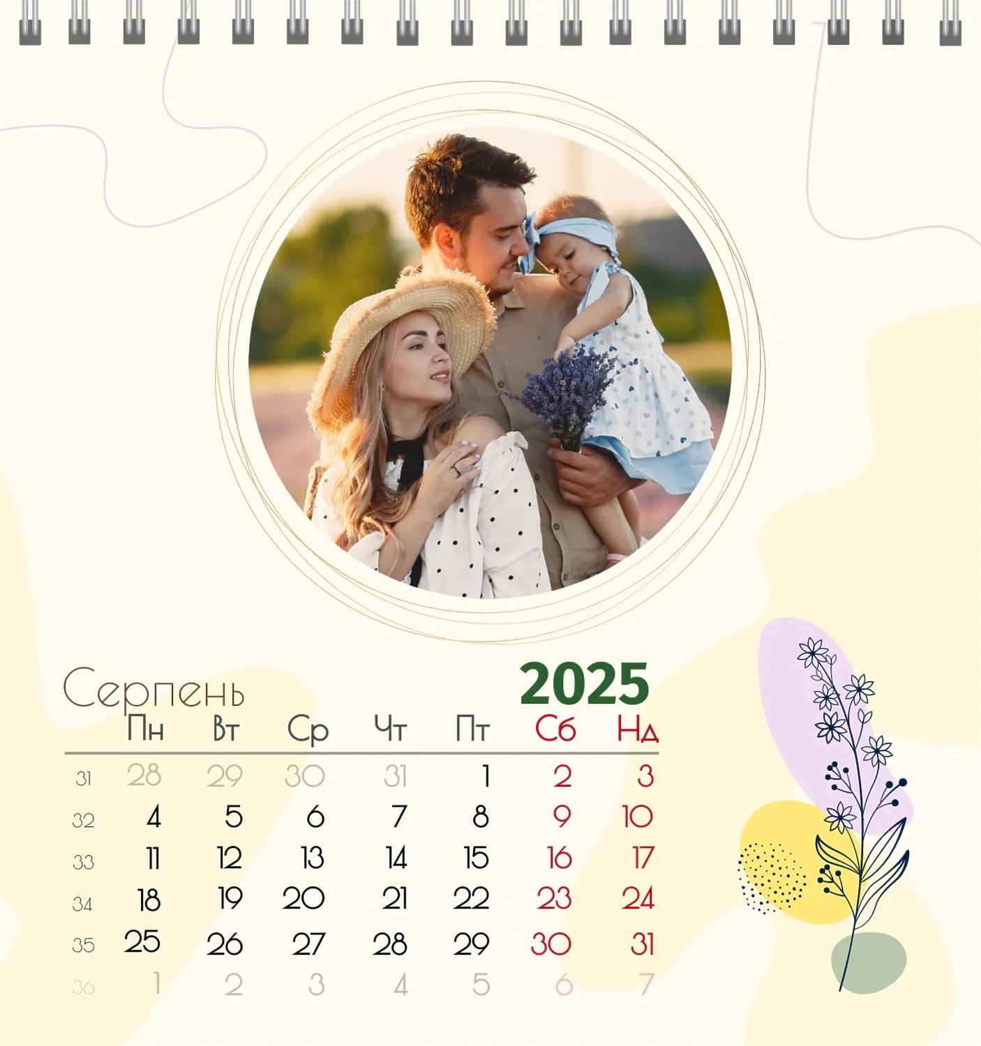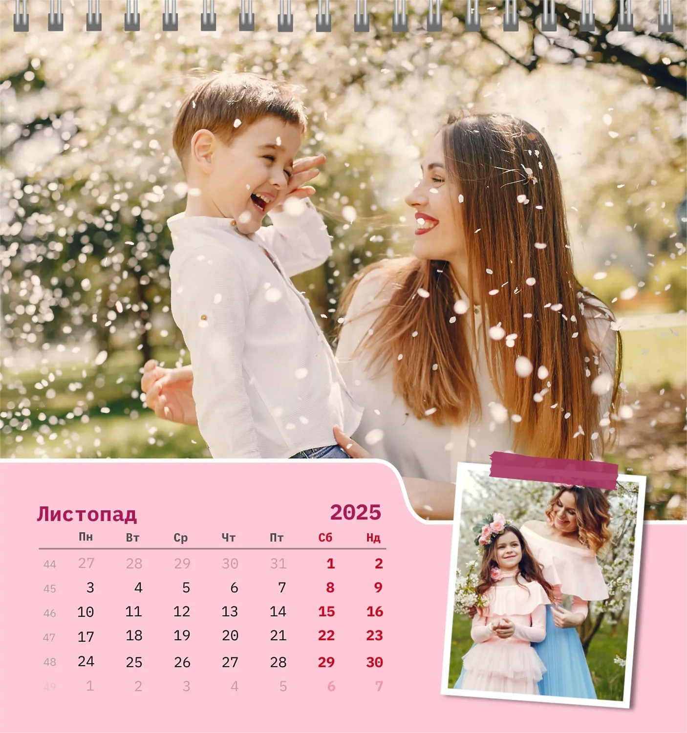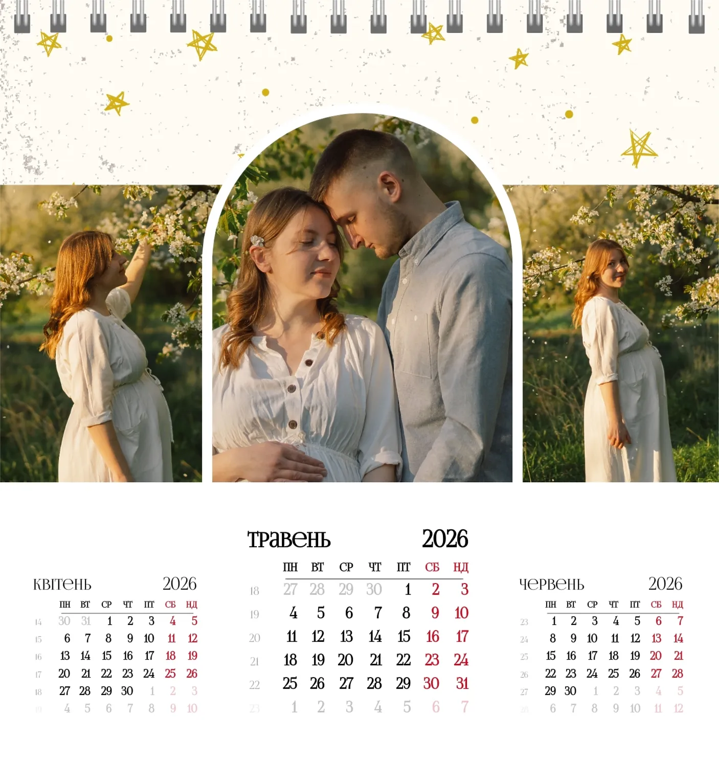 Календар "Наша сім'я" з весільними фото — це готовий шаблон, який прекрасно підходить для створення унікального і пам'ятного сімейного настільного календаря на 13 сторінок. Його теплий і романтичний стиль робить його ідеальним для пар, які бажають зберегти спогади про весілля, або для тих, хто хоче подарувати близьким щось особливе. Ви можете замінити фотографії на свої, підбираючи найбільш зворушливі моменти весілля, змінити підписи, додавши імена, дати або короткі фрази, які будуть нагадувати про яскраві моменти вашої історії. В онлайн-конструкторі також легко адаптувати кольори, шрифти і розташування елементів, щоб календар повністю відображав вашу унікальність і стиль. Створення такого календаря своїми руками не вимагає спеціальних навичок. Інтуїтивно зрозумілий інтерфейс конструктора дозволяє експериментувати з дизайном, поки результат не стане ідеальним. Підсумковий календар стане не просто функціональним виробом, а й емоційною сімейною реліквією, яка буде радувати вас і ваших близьких протягом усього року.