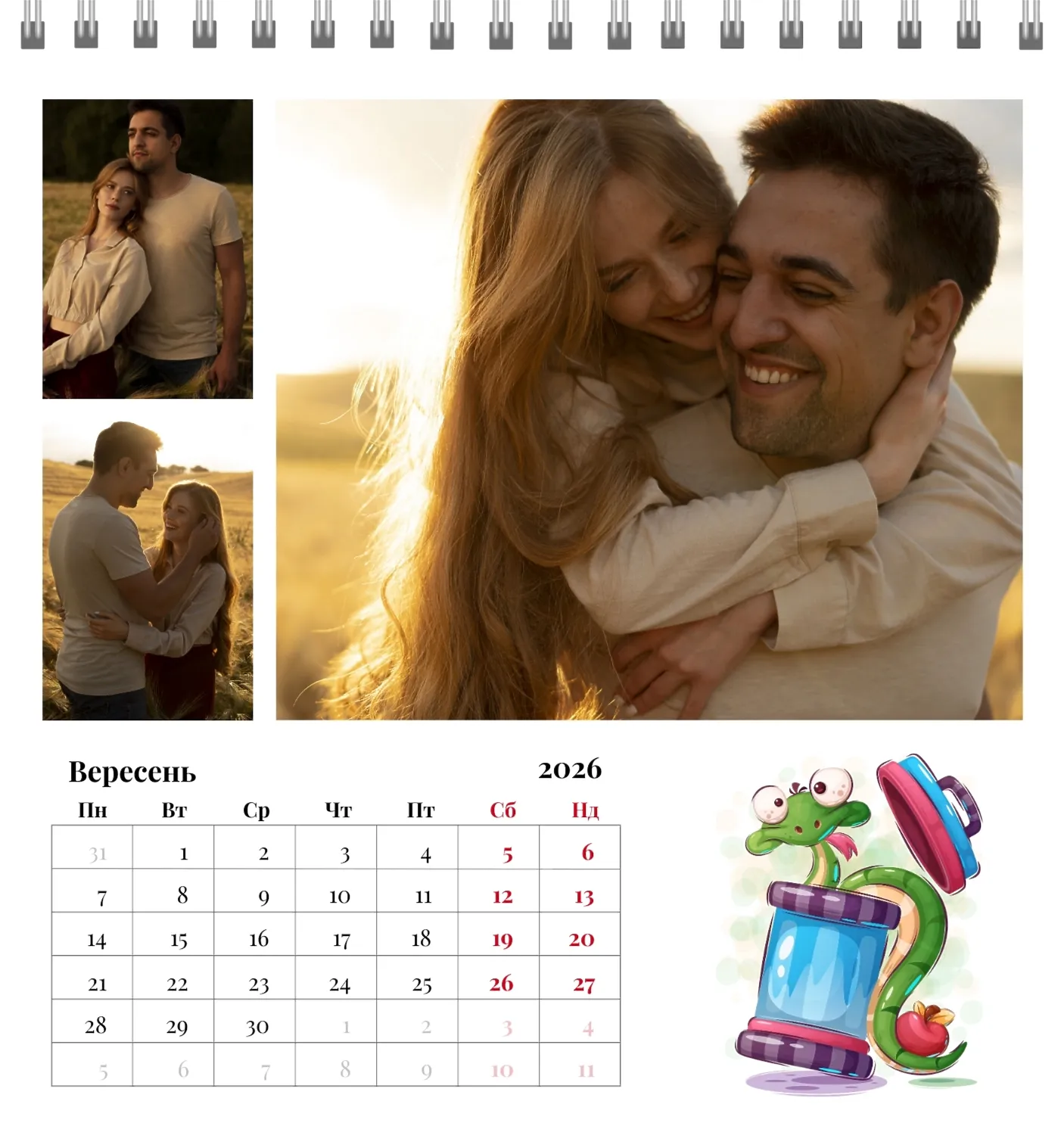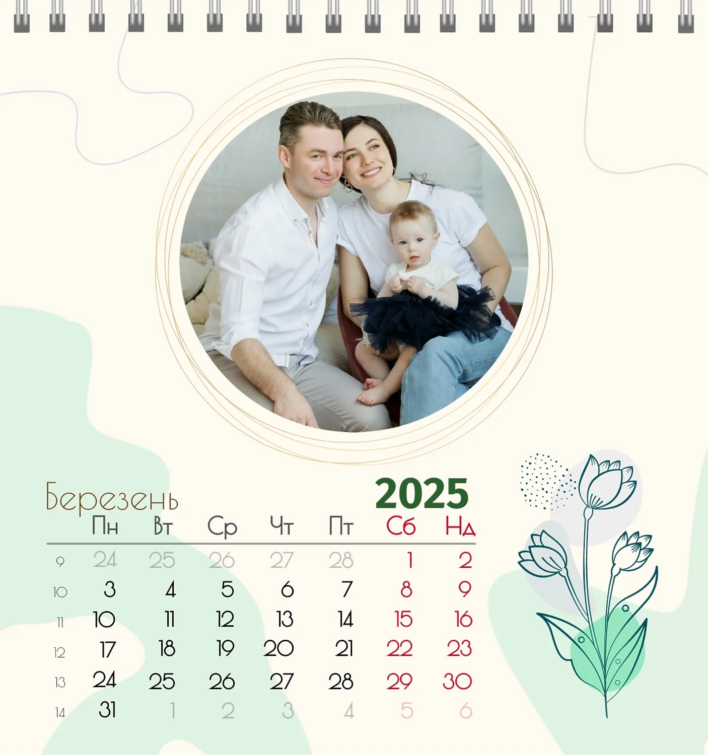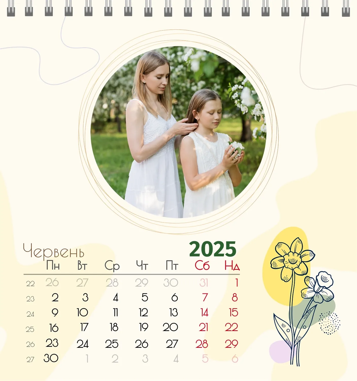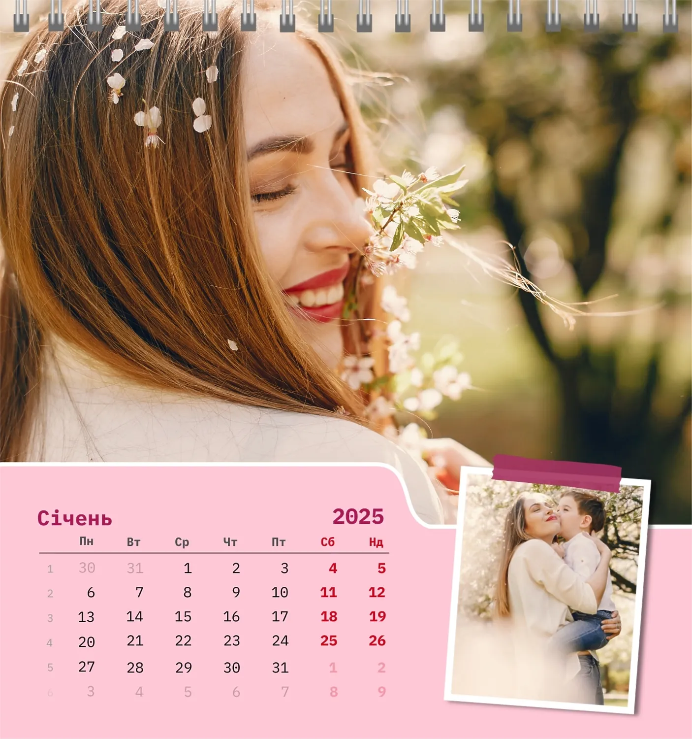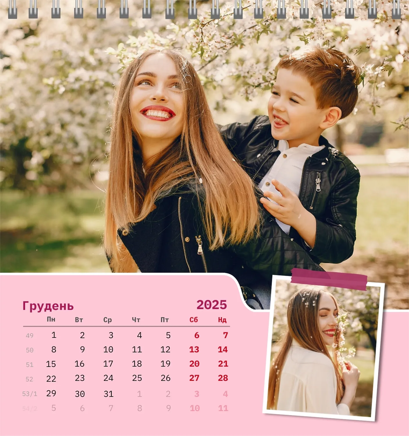 Календар "Наша сім'я" з весільними фото — це готовий шаблон, який прекрасно підходить для створення унікального і пам'ятного сімейного настільного календаря на 13 сторінок. Його теплий і романтичний стиль робить його ідеальним для пар, які бажають зберегти спогади про весілля, або для тих, хто хоче подарувати близьким щось особливе. Ви можете замінити фотографії на свої, підбираючи найбільш зворушливі моменти весілля, змінити підписи, додавши імена, дати або короткі фрази, які будуть нагадувати про яскраві моменти вашої історії. В онлайн-конструкторі також легко адаптувати кольори, шрифти і розташування елементів, щоб календар повністю відображав вашу унікальність і стиль. Створення такого календаря своїми руками не вимагає спеціальних навичок. Інтуїтивно зрозумілий інтерфейс конструктора дозволяє експериментувати з дизайном, поки результат не стане ідеальним. Підсумковий календар стане не просто функціональним виробом, а й емоційною сімейною реліквією, яка буде радувати вас і ваших близьких протягом усього року.