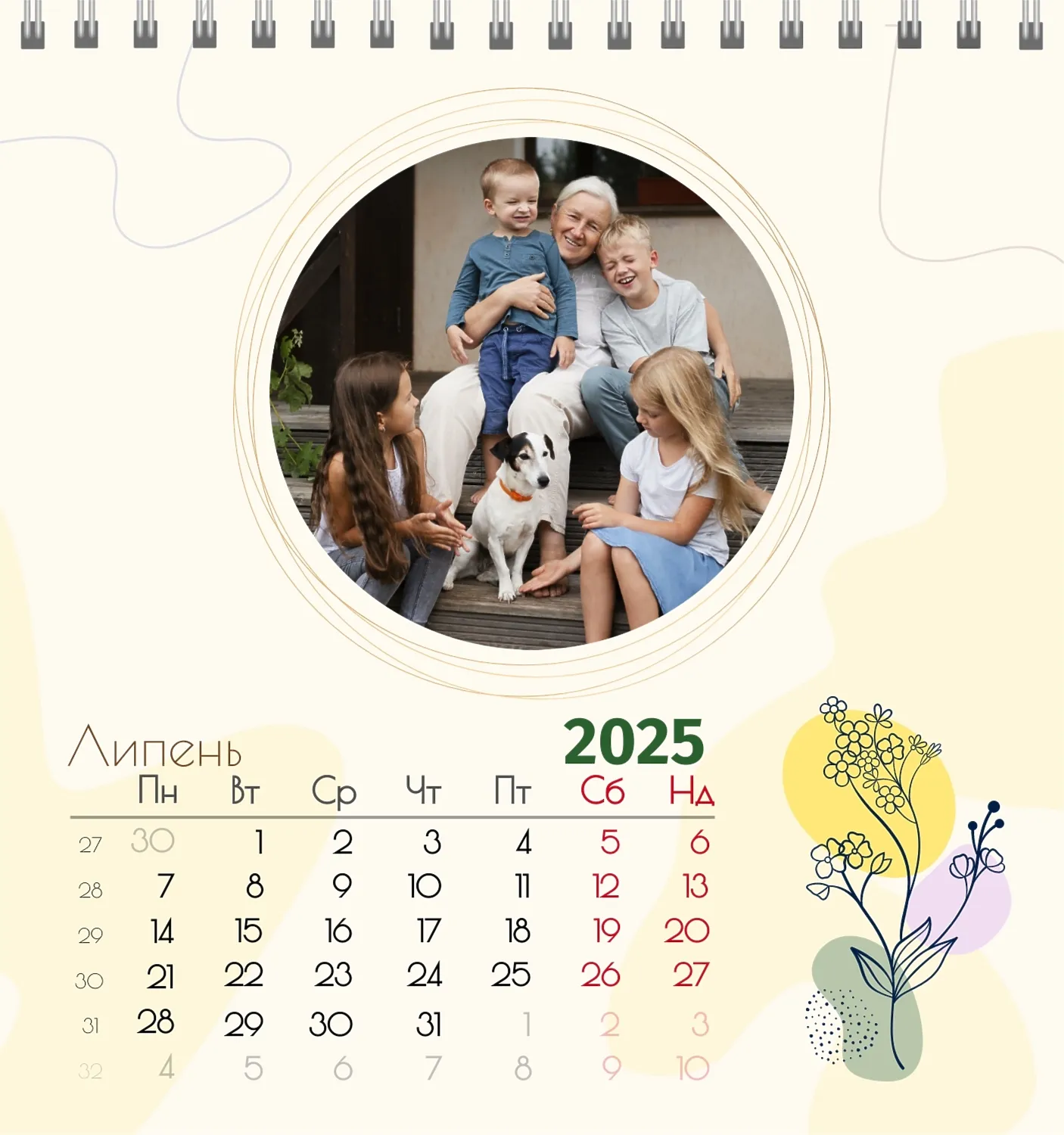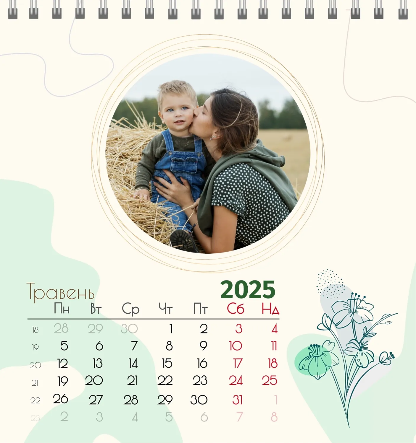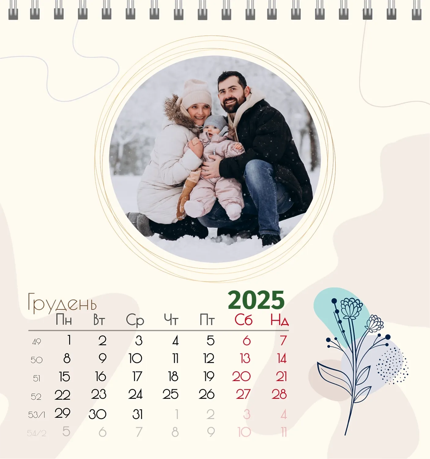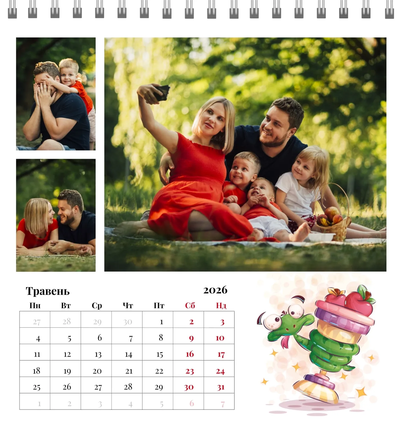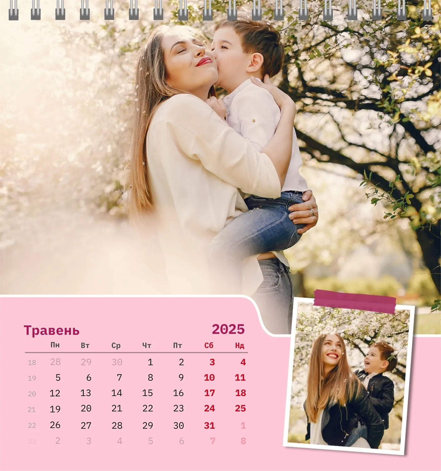 Календар "Наша сім'я" з весільними фото — це готовий шаблон, який прекрасно підходить для створення унікального і пам'ятного сімейного настільного календаря на 13 сторінок. Його теплий і романтичний стиль робить його ідеальним для пар, які бажають зберегти спогади про весілля, або для тих, хто хоче подарувати близьким щось особливе. Ви можете замінити фотографії на свої, підбираючи найбільш зворушливі моменти весілля, змінити підписи, додавши імена, дати або короткі фрази, які будуть нагадувати про яскраві моменти вашої історії. В онлайн-конструкторі також легко адаптувати кольори, шрифти і розташування елементів, щоб календар повністю відображав вашу унікальність і стиль. Створення такого календаря своїми руками не вимагає спеціальних навичок. Інтуїтивно зрозумілий інтерфейс конструктора дозволяє експериментувати з дизайном, поки результат не стане ідеальним. Підсумковий календар стане не просто функціональним виробом, а й емоційною сімейною реліквією, яка буде радувати вас і ваших близьких протягом усього року.
