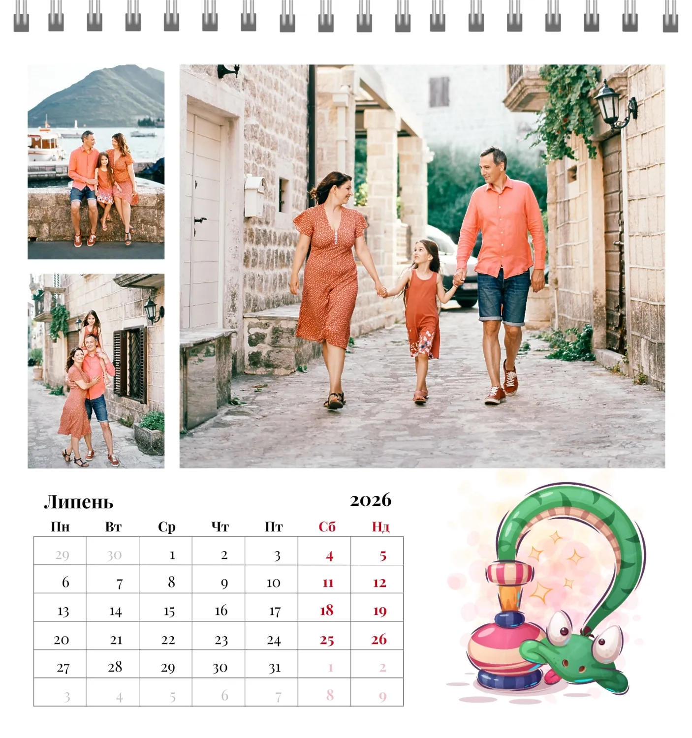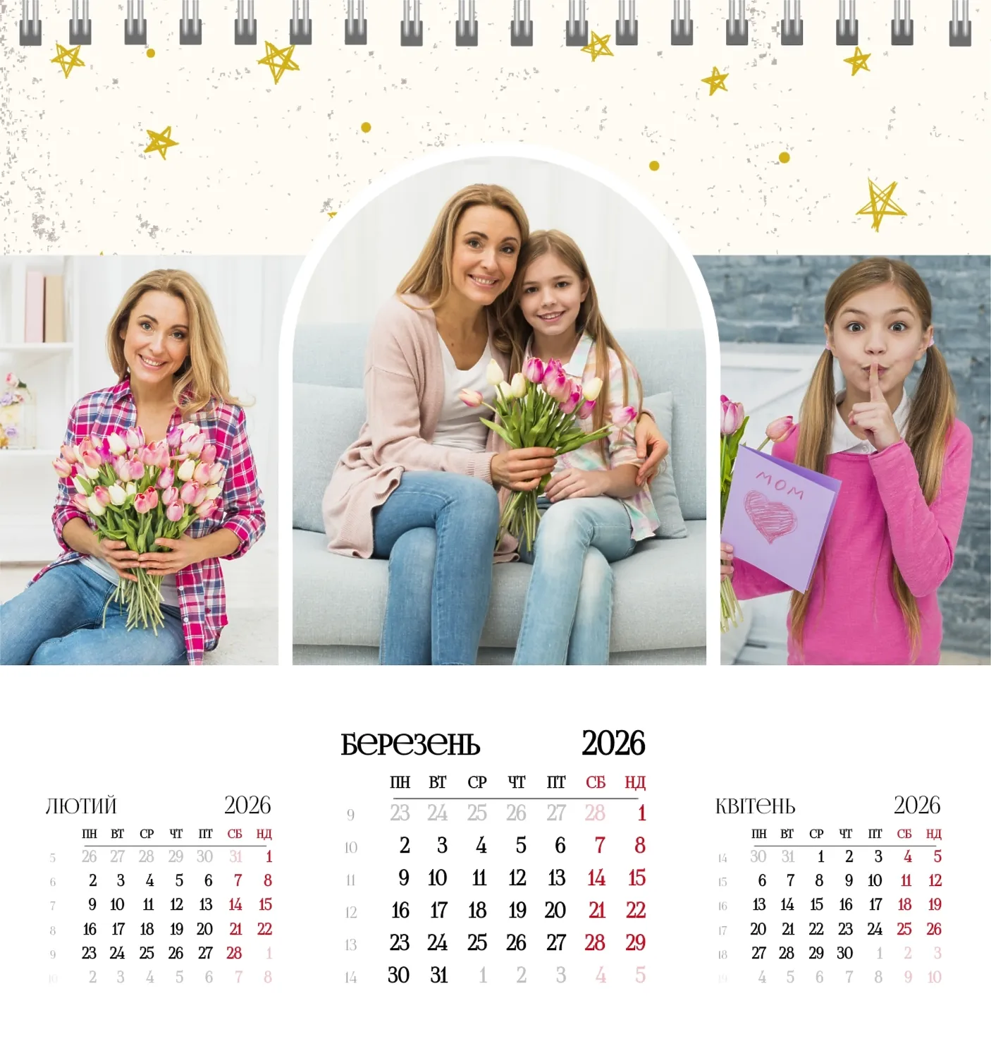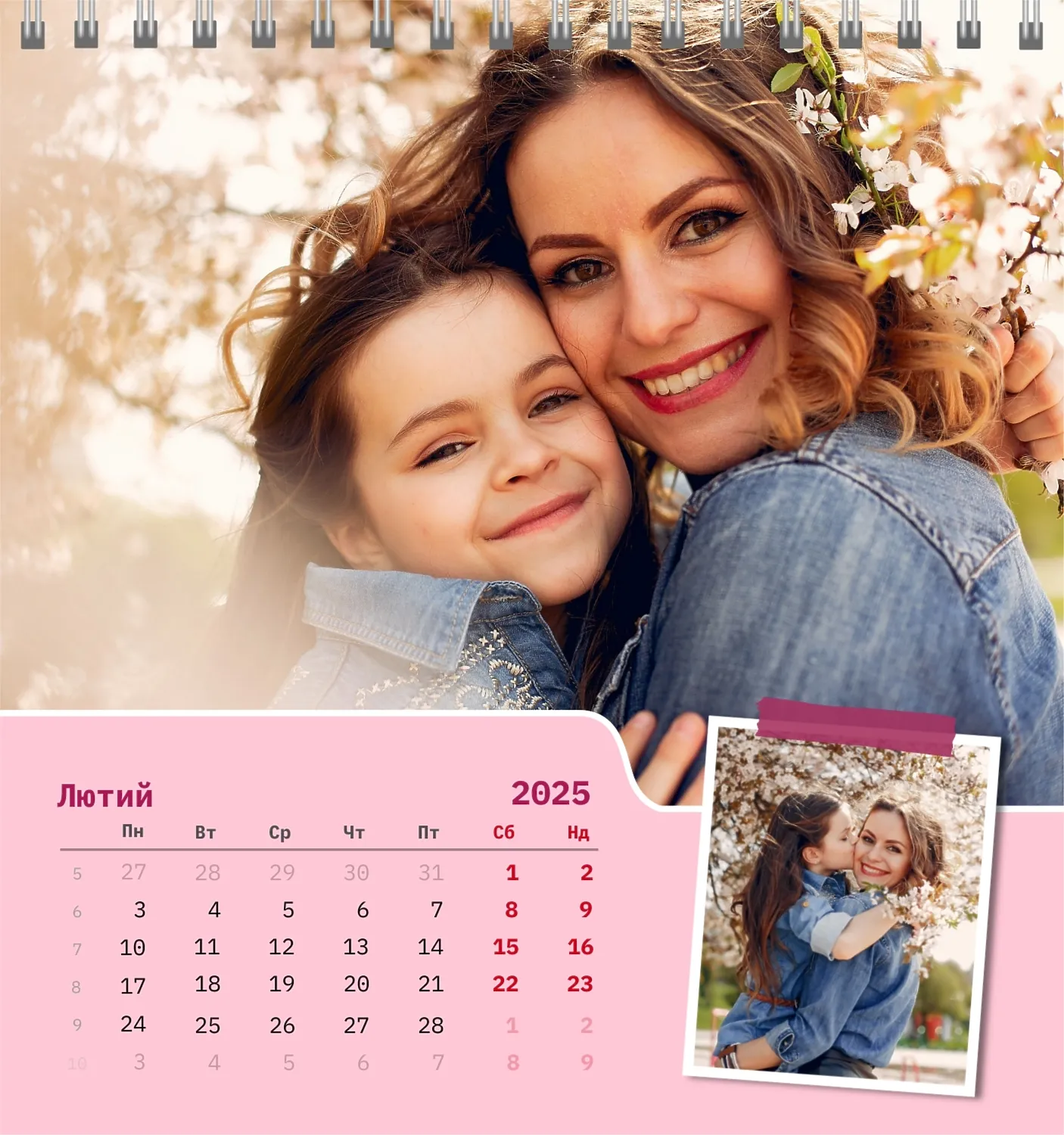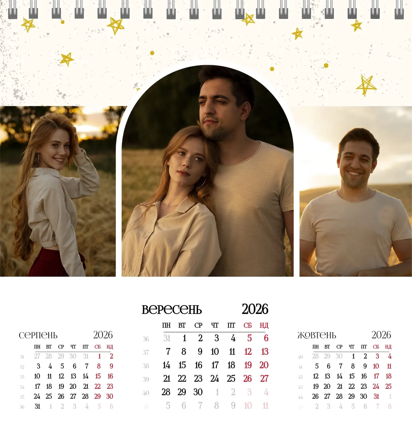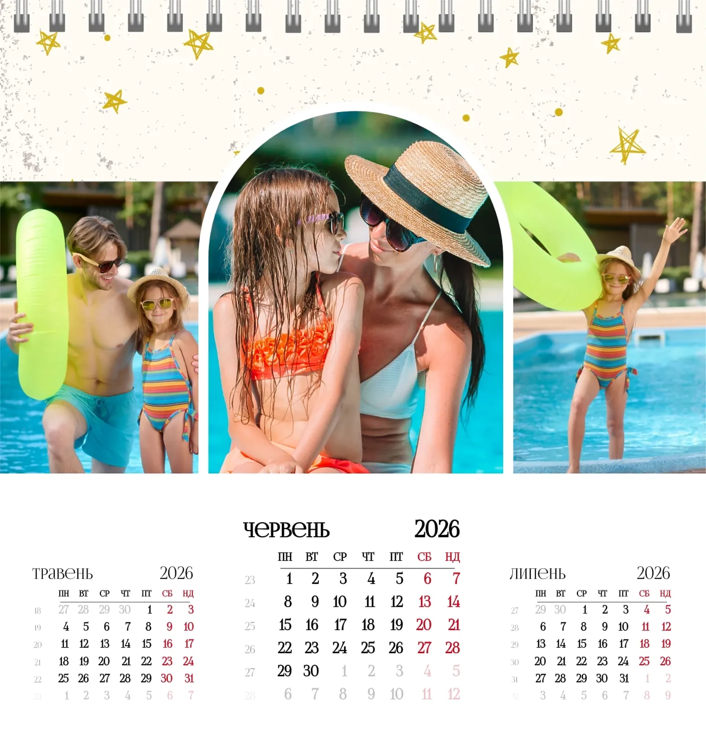 Календар "Наша сім'я" з весільними фото — це готовий шаблон, який прекрасно підходить для створення унікального і пам'ятного сімейного настільного календаря на 13 сторінок. Його теплий і романтичний стиль робить його ідеальним для пар, які бажають зберегти спогади про весілля, або для тих, хто хоче подарувати близьким щось особливе. Ви можете замінити фотографії на свої, підбираючи найбільш зворушливі моменти весілля, змінити підписи, додавши імена, дати або короткі фрази, які будуть нагадувати про яскраві моменти вашої історії. В онлайн-конструкторі також легко адаптувати кольори, шрифти і розташування елементів, щоб календар повністю відображав вашу унікальність і стиль. Створення такого календаря своїми руками не вимагає спеціальних навичок. Інтуїтивно зрозумілий інтерфейс конструктора дозволяє експериментувати з дизайном, поки результат не стане ідеальним. Підсумковий календар стане не просто функціональним виробом, а й емоційною сімейною реліквією, яка буде радувати вас і ваших близьких протягом усього року.