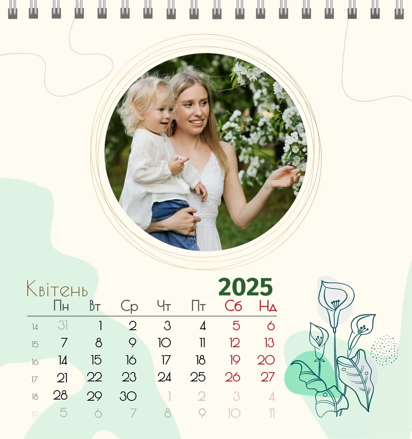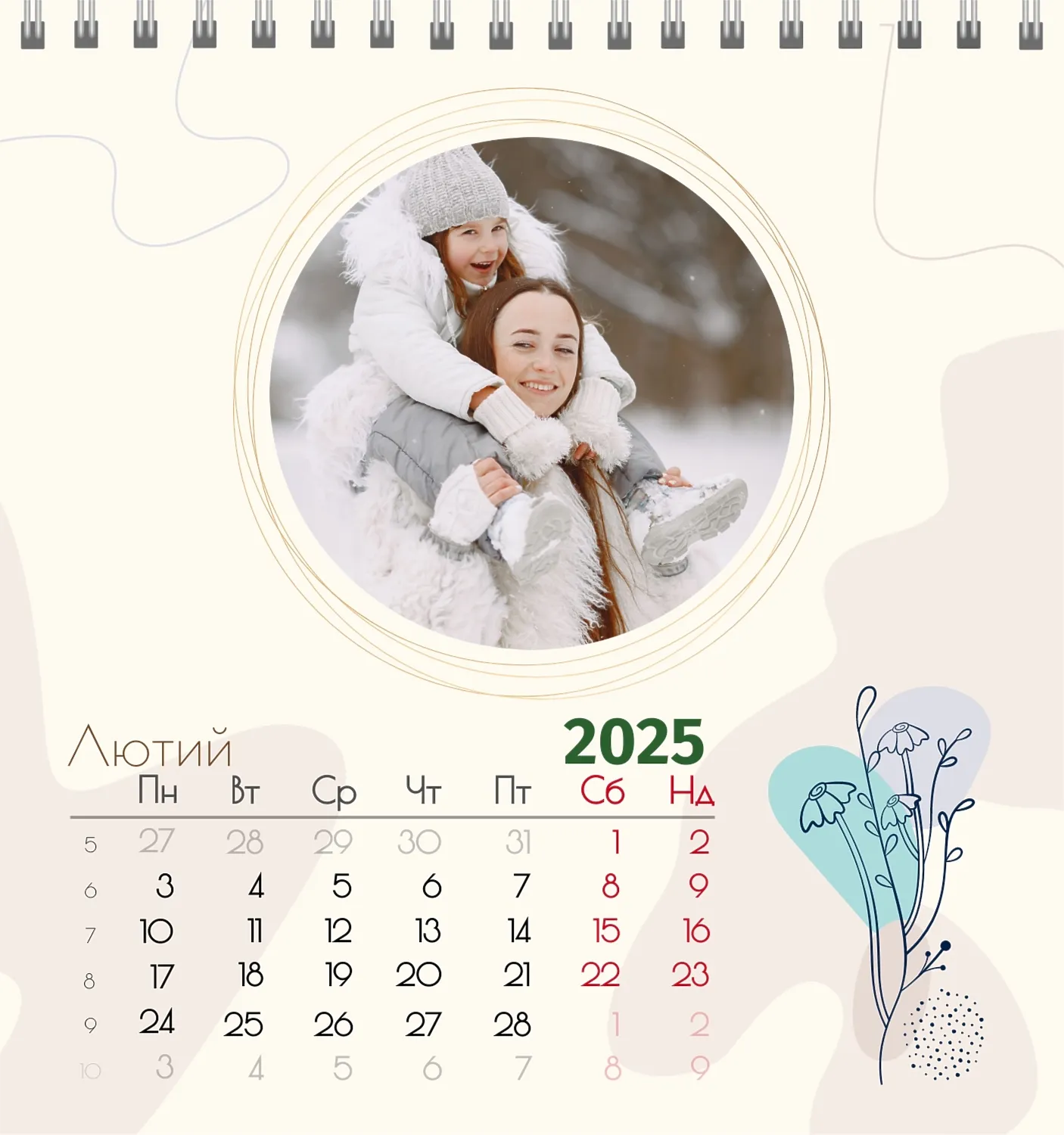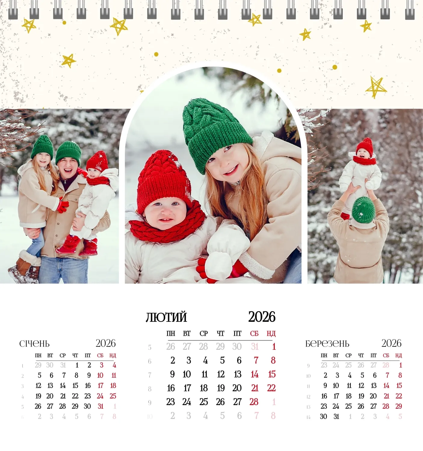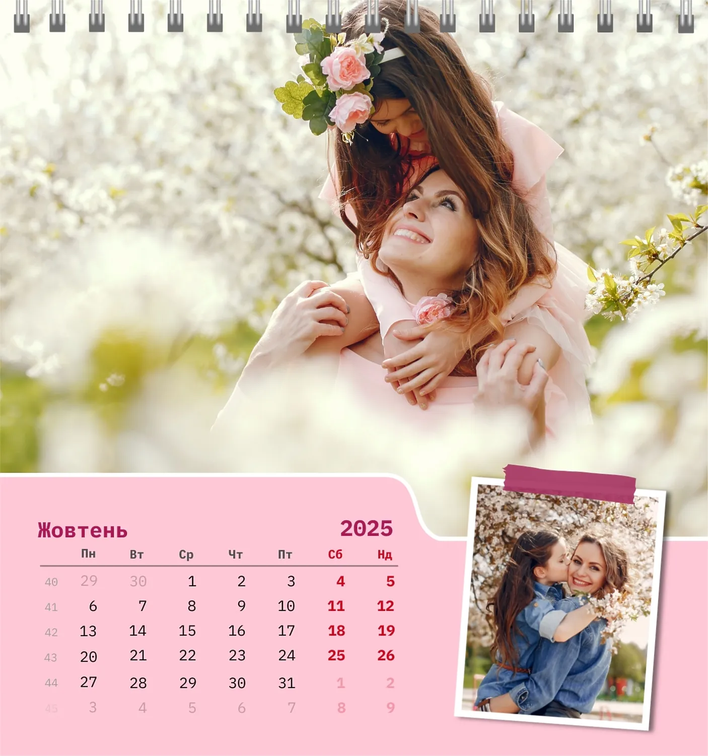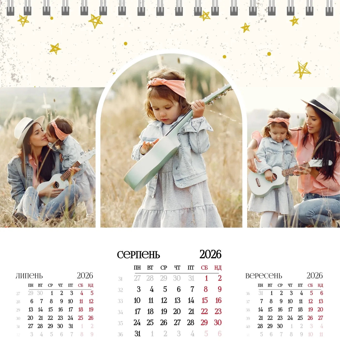 Календар "Наша сім'я" з весільними фото — це готовий шаблон, який прекрасно підходить для створення унікального і пам'ятного сімейного настільного календаря на 13 сторінок. Його теплий і романтичний стиль робить його ідеальним для пар, які бажають зберегти спогади про весілля, або для тих, хто хоче подарувати близьким щось особливе. Ви можете замінити фотографії на свої, підбираючи найбільш зворушливі моменти весілля, змінити підписи, додавши імена, дати або короткі фрази, які будуть нагадувати про яскраві моменти вашої історії. В онлайн-конструкторі також легко адаптувати кольори, шрифти і розташування елементів, щоб календар повністю відображав вашу унікальність і стиль. Створення такого календаря своїми руками не вимагає спеціальних навичок. Інтуїтивно зрозумілий інтерфейс конструктора дозволяє експериментувати з дизайном, поки результат не стане ідеальним. Підсумковий календар стане не просто функціональним виробом, а й емоційною сімейною реліквією, яка буде радувати вас і ваших близьких протягом усього року.