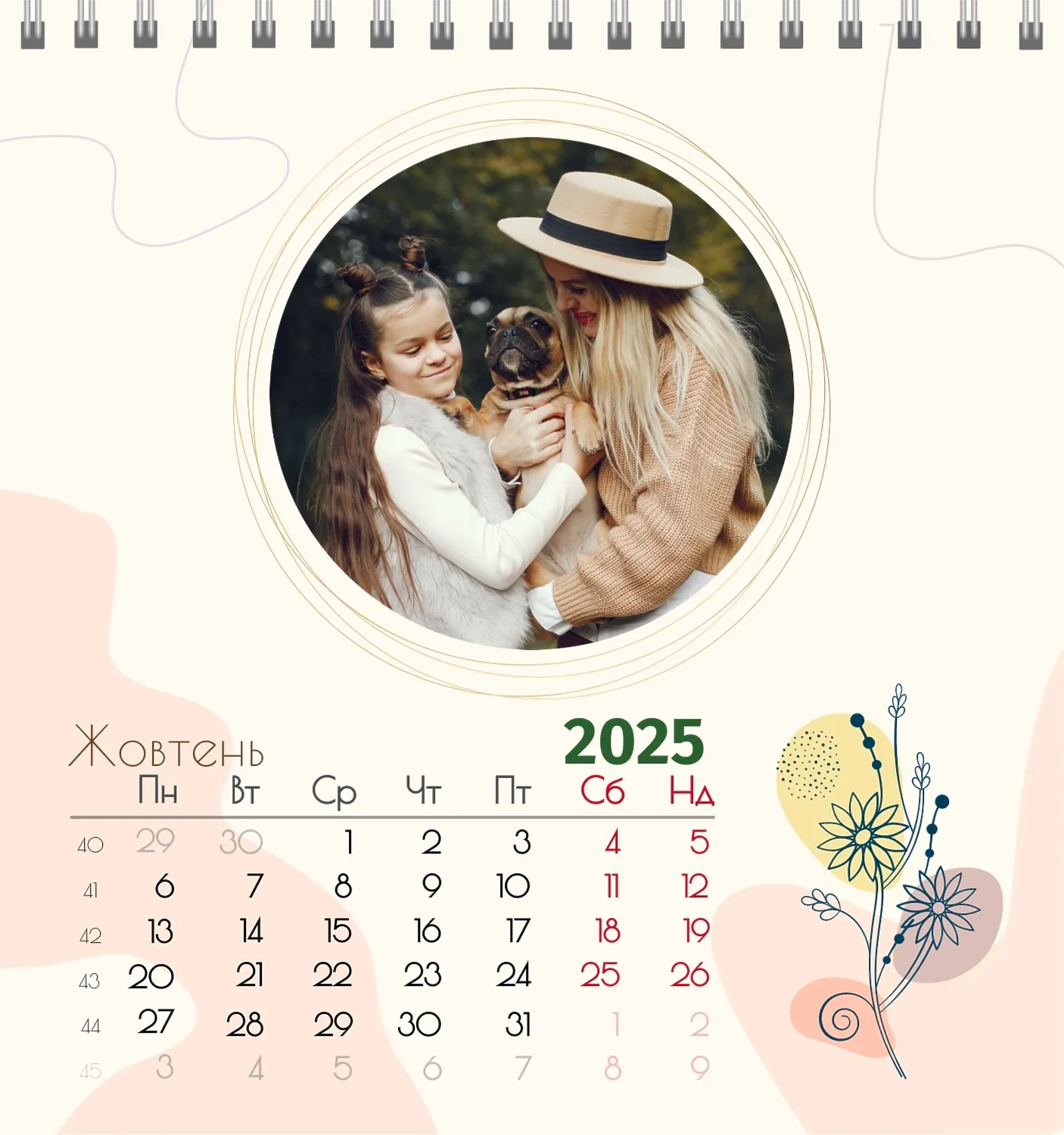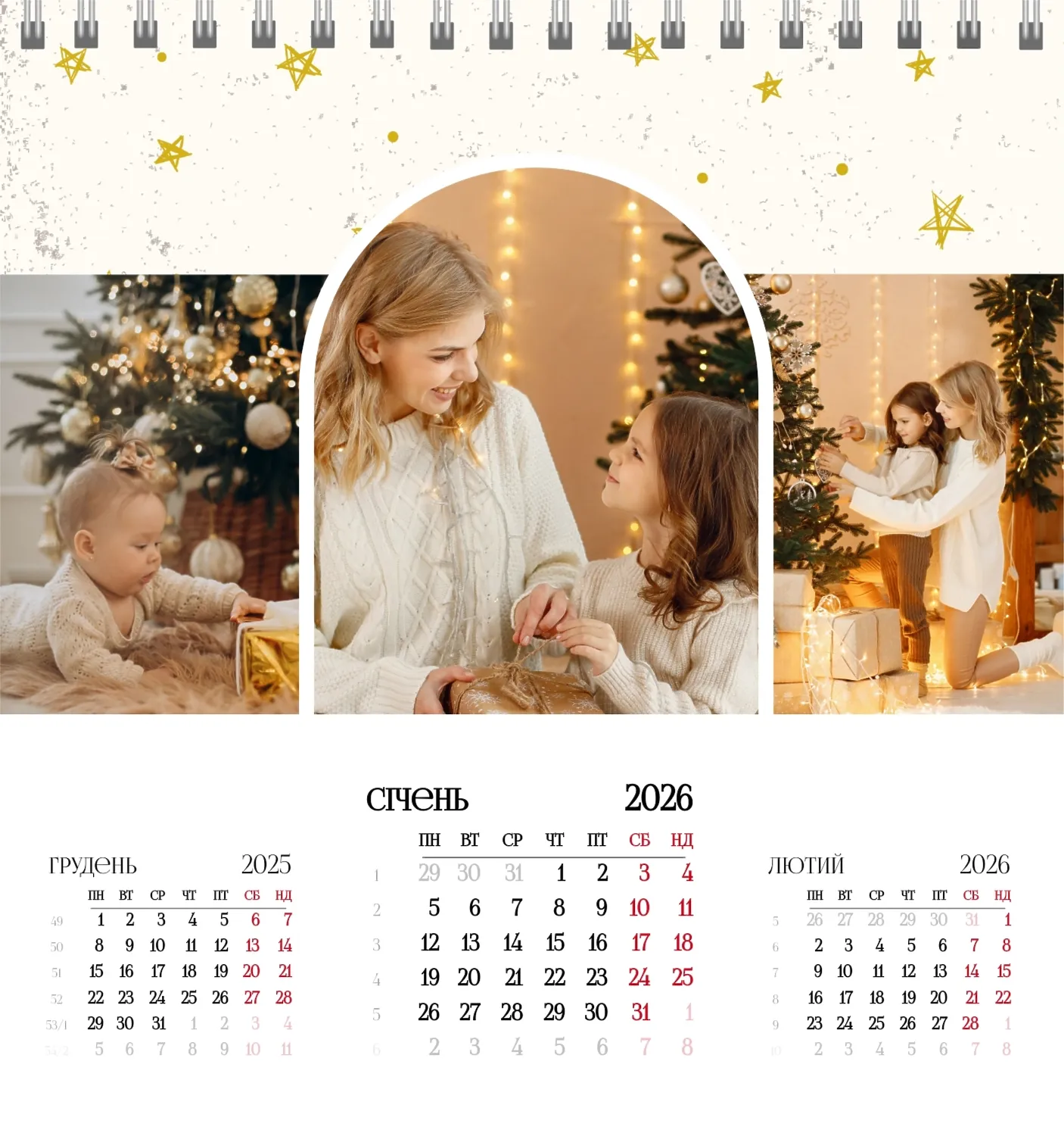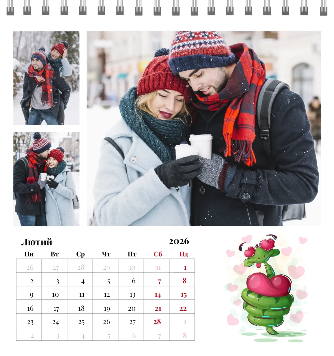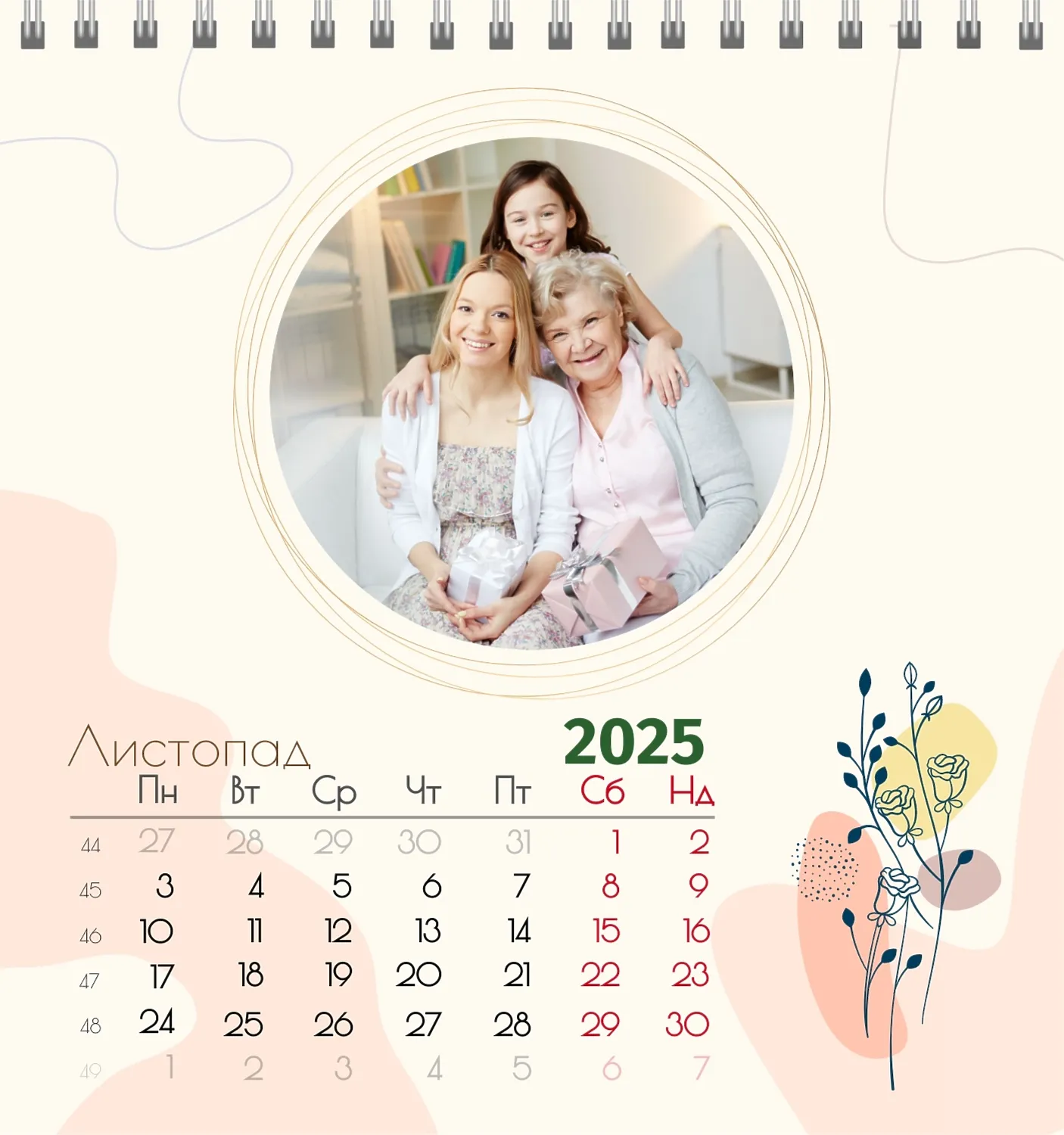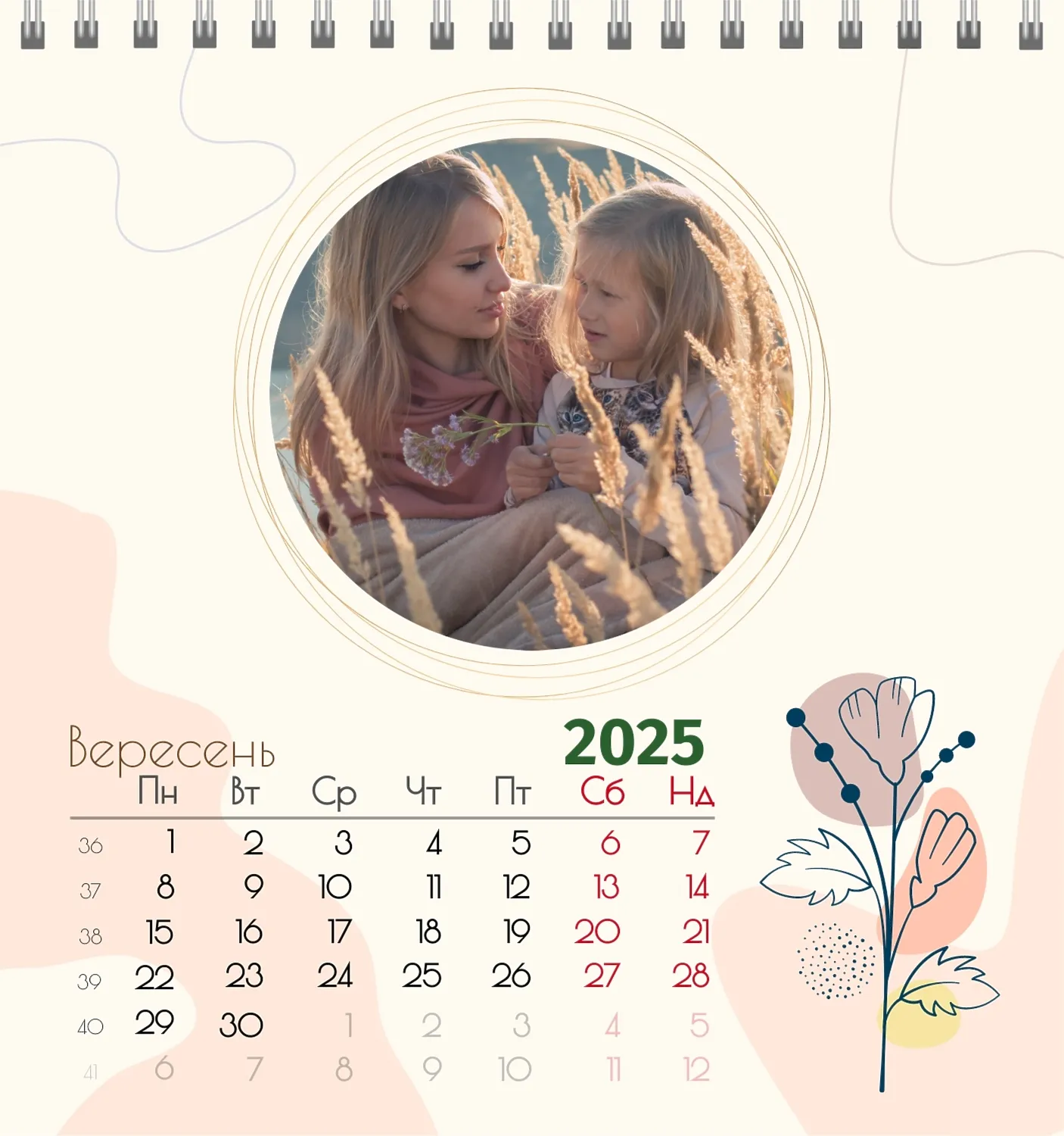 Календар "Наша сім'я" з весільними фото — це готовий шаблон, який прекрасно підходить для створення унікального і пам'ятного сімейного настільного календаря на 13 сторінок. Його теплий і романтичний стиль робить його ідеальним для пар, які бажають зберегти спогади про весілля, або для тих, хто хоче подарувати близьким щось особливе. Ви можете замінити фотографії на свої, підбираючи найбільш зворушливі моменти весілля, змінити підписи, додавши імена, дати або короткі фрази, які будуть нагадувати про яскраві моменти вашої історії. В онлайн-конструкторі також легко адаптувати кольори, шрифти і розташування елементів, щоб календар повністю відображав вашу унікальність і стиль. Створення такого календаря своїми руками не вимагає спеціальних навичок. Інтуїтивно зрозумілий інтерфейс конструктора дозволяє експериментувати з дизайном, поки результат не стане ідеальним. Підсумковий календар стане не просто функціональним виробом, а й емоційною сімейною реліквією, яка буде радувати вас і ваших близьких протягом усього року.