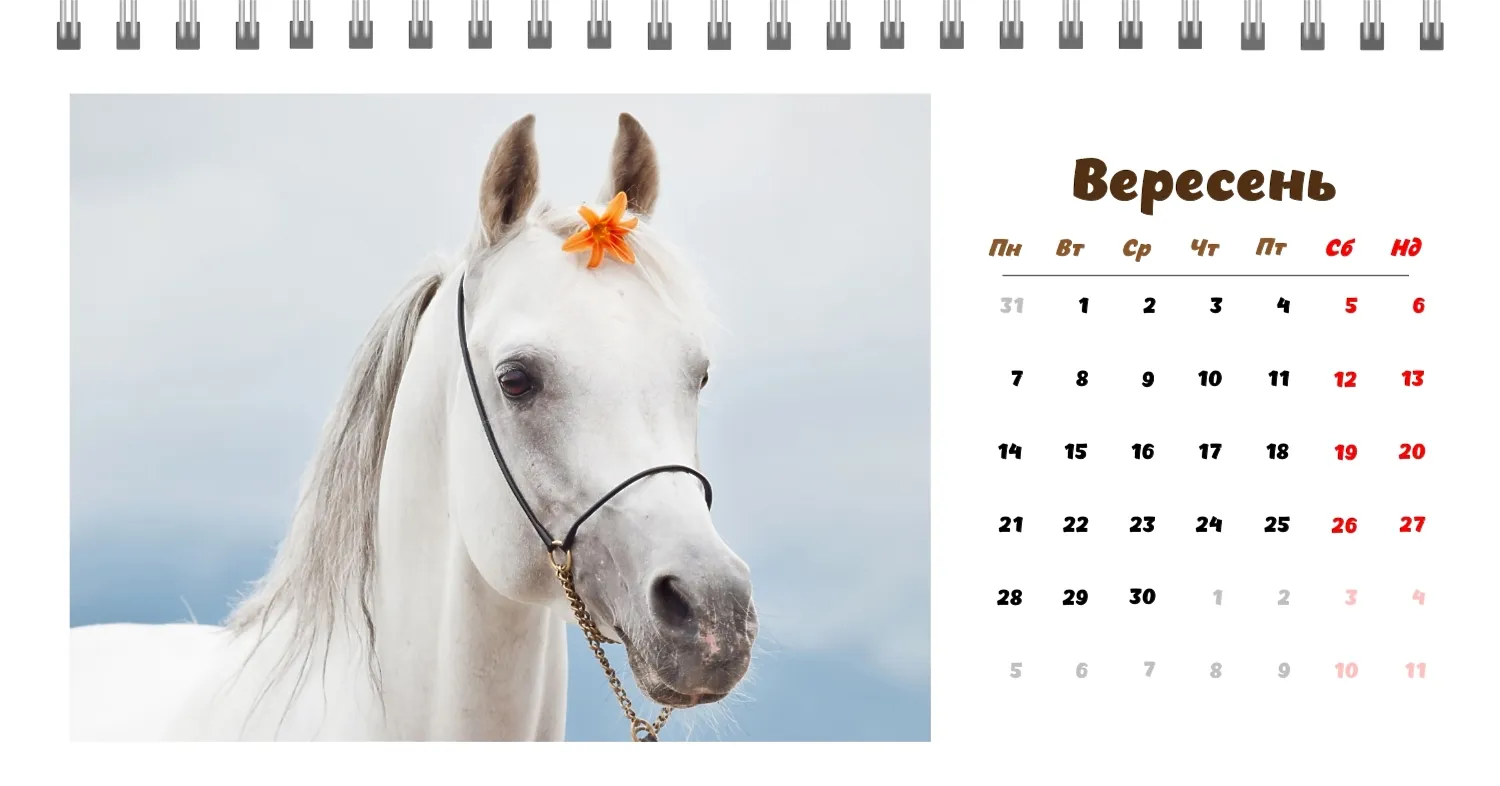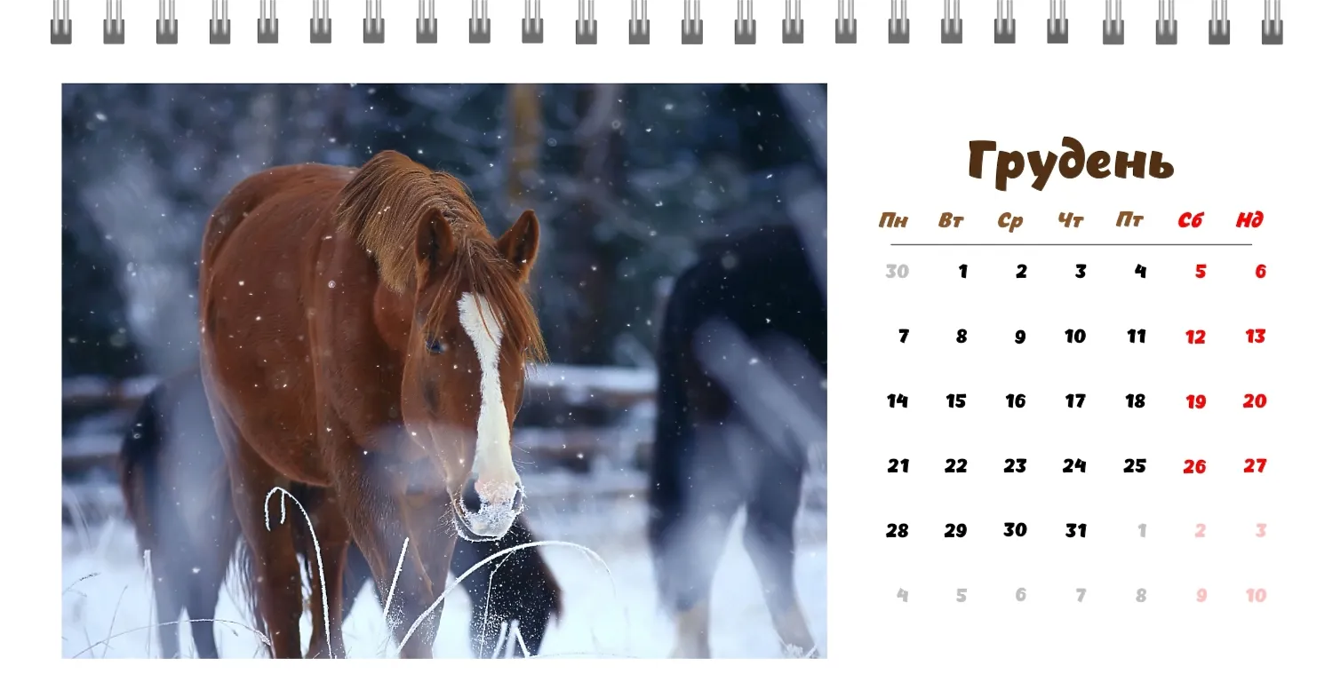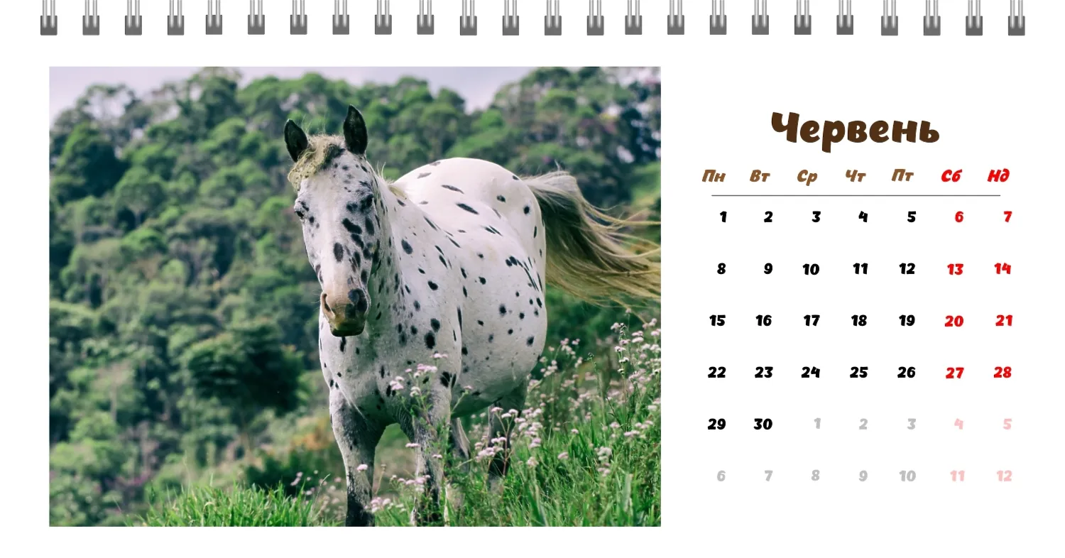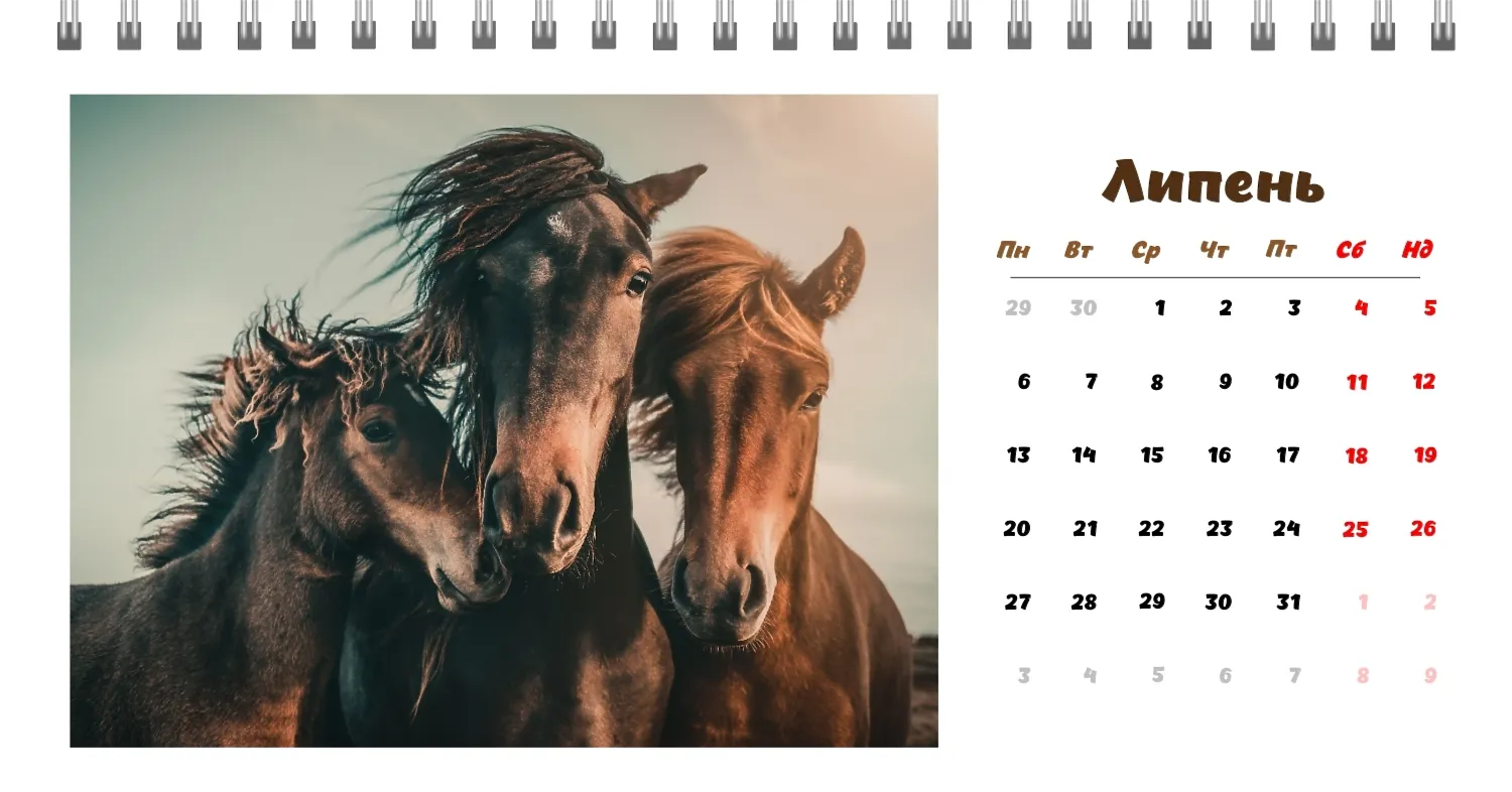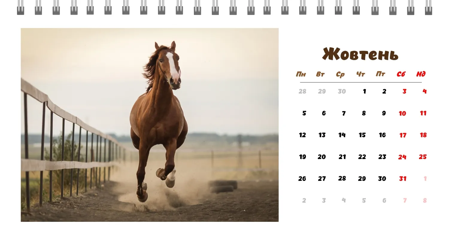 Готовий шаблон настільного горизонтального перекидного календаря з кіньми створений для тих, хто цінує природну гармонію, динаміку і символіку сили. На зображеннях представлені потужні і благородні тварини, які асоціюються зі свободою, прагненням вперед і внутрішньою рівновагою. Такий календар прекрасно підійде для кінних клубів, ферм, ветеринарних центрів, зоомагазинів, а також для тренерів, інструкторів, фотографів і всіх, хто захоплений кінним спортом або просто любить коней. Він буде однаково доречний як в робочому кабінеті, так і в домашньому інтер'єрі, створюючи атмосферу спокою і натхнення. У нашому онлайн-конструкторі цей шаблон можна легко адаптувати під особисті переваги. Ви можете замінити фотографії на свої власні знімки коней, додати логотип клубу або господарства, змінити шрифти, кольори і розстановку елементів. Є можливість підписати місяці, виділити важливі дати, відзначити змагання, тренування, дні народження та інші події. Будь-який елемент календаря – від фону до дрібних деталей-піддається редагуванню, що дозволяє створити дійсно персоналізований варіант. Онлайн-конструктор працює максимально зручно і просто: всі зміни відображаються відразу, можна експериментувати з композиціями, пробувати різні стилі і зберігати кілька варіантів.