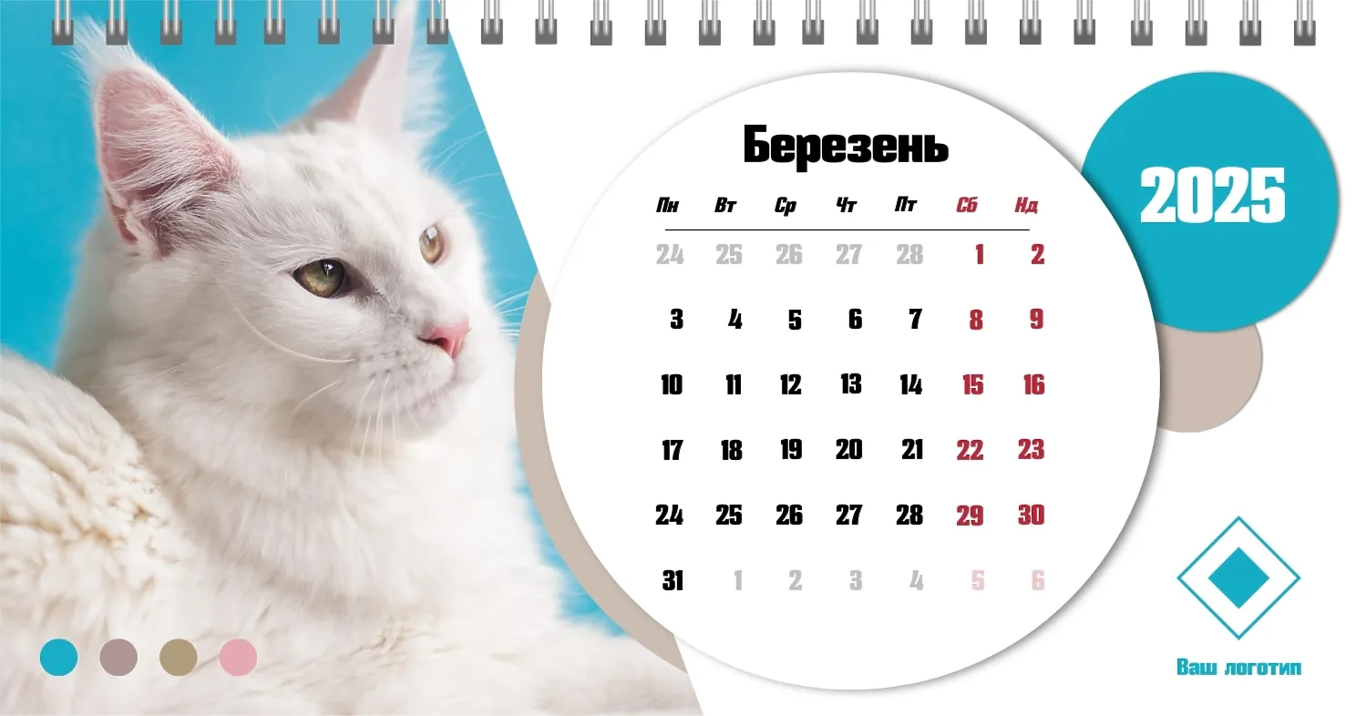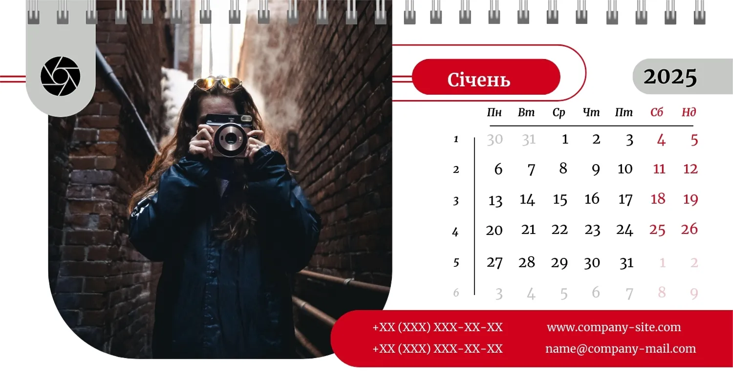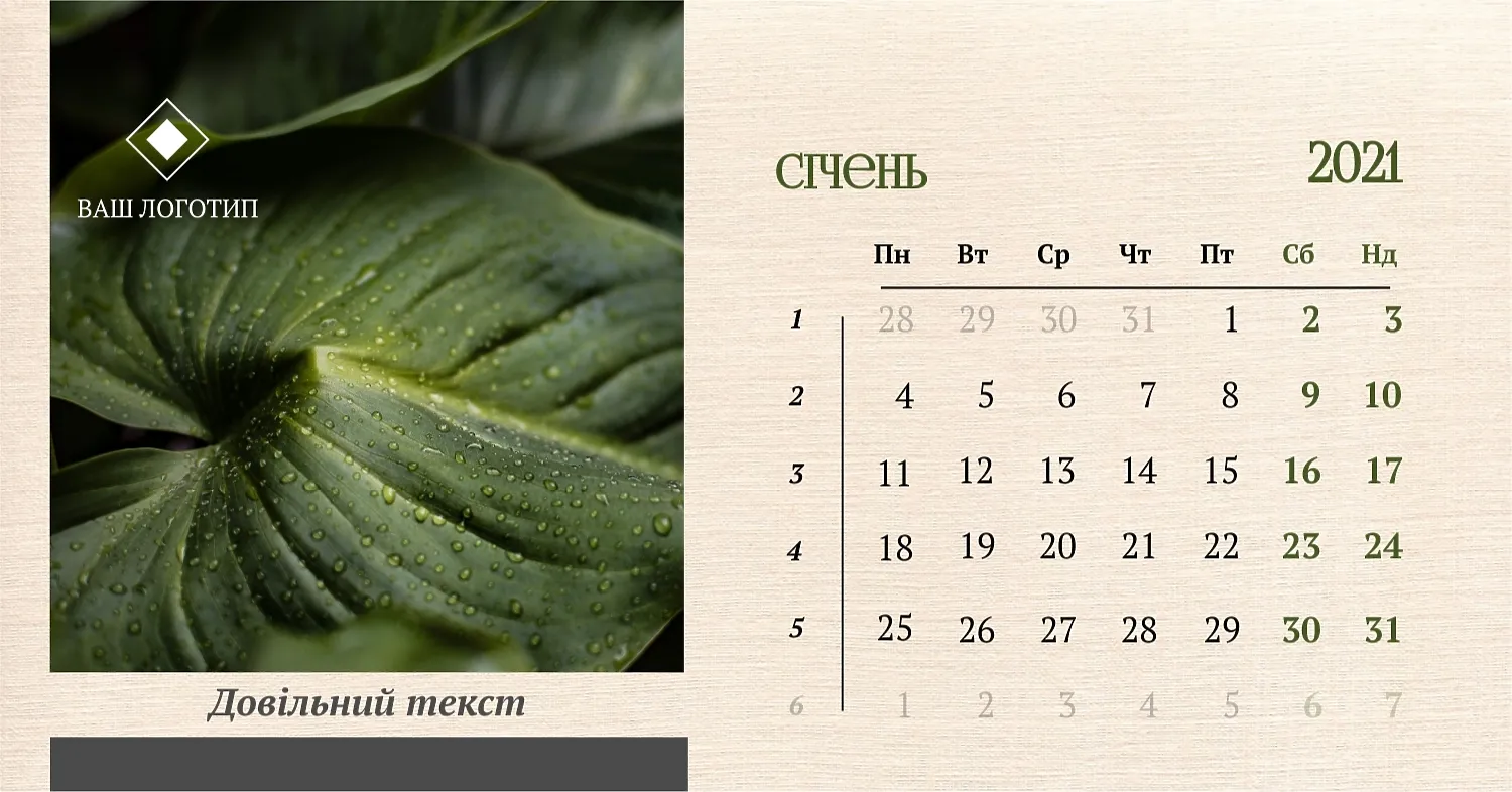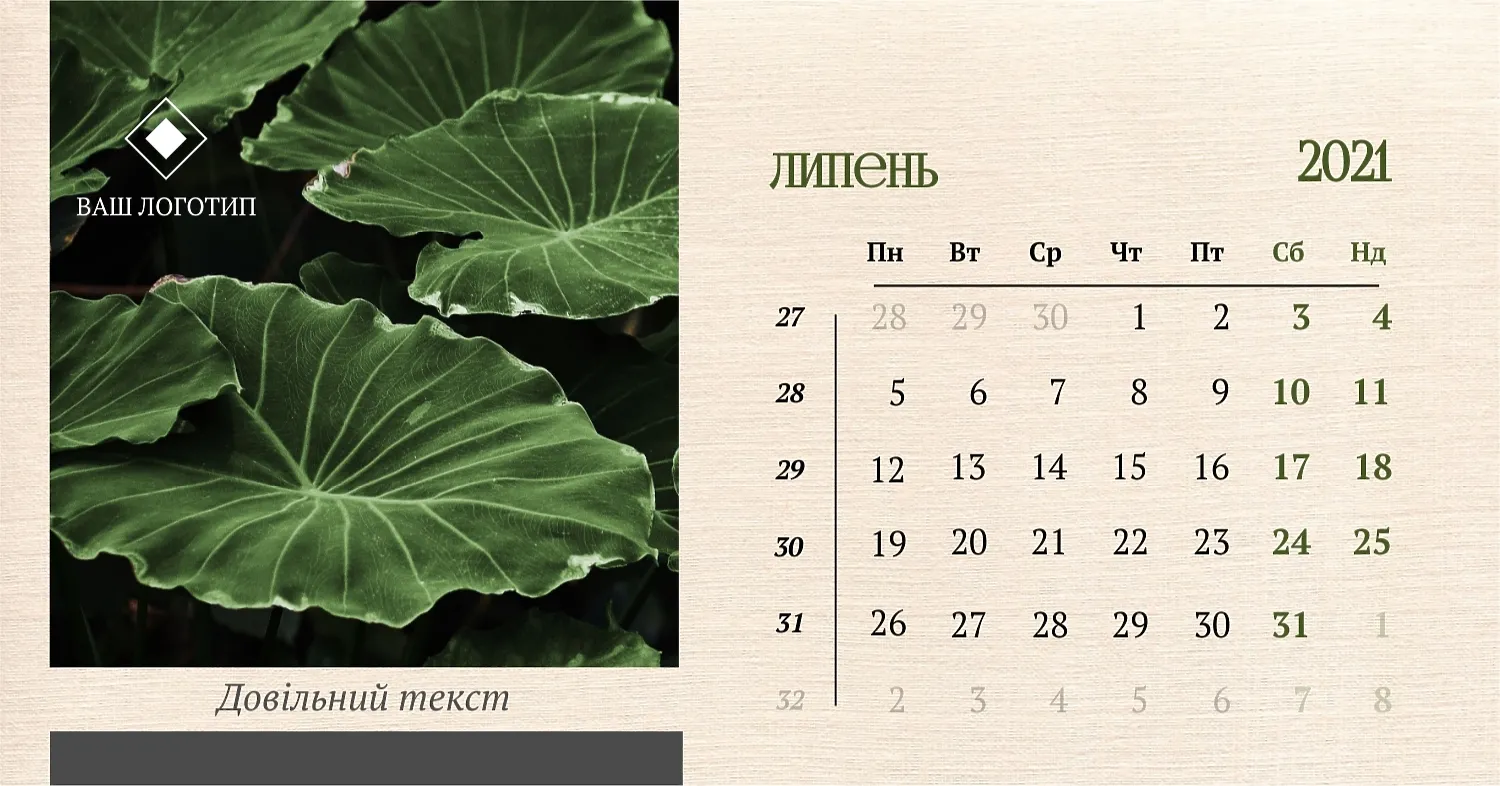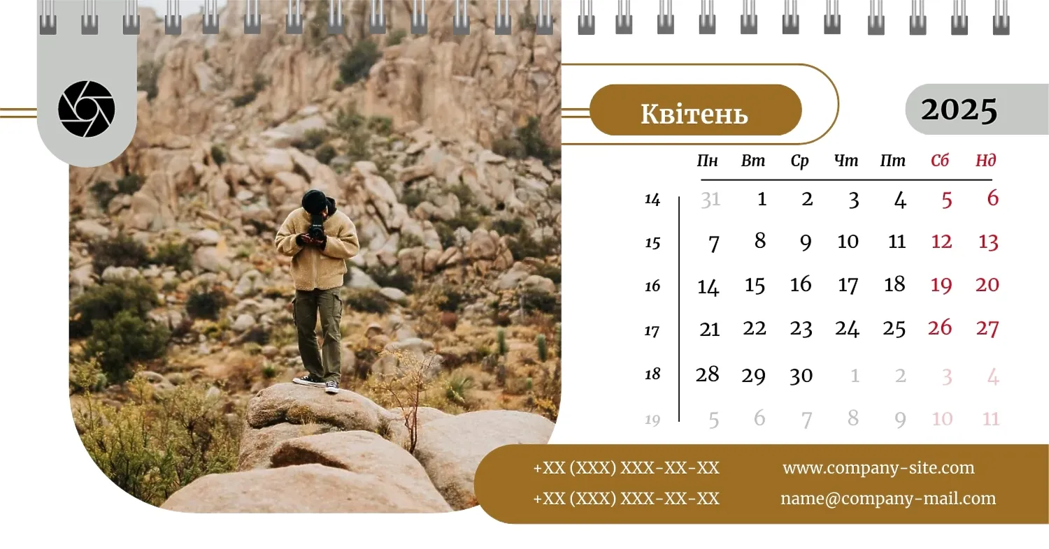 Готовий шаблон настільного горизонтального перекидного календаря з кіньми створений для тих, хто цінує природну гармонію, динаміку і символіку сили. На зображеннях представлені потужні і благородні тварини, які асоціюються зі свободою, прагненням вперед і внутрішньою рівновагою. Такий календар прекрасно підійде для кінних клубів, ферм, ветеринарних центрів, зоомагазинів, а також для тренерів, інструкторів, фотографів і всіх, хто захоплений кінним спортом або просто любить коней. Він буде однаково доречний як в робочому кабінеті, так і в домашньому інтер'єрі, створюючи атмосферу спокою і натхнення. У нашому онлайн-конструкторі цей шаблон можна легко адаптувати під особисті переваги. Ви можете замінити фотографії на свої власні знімки коней, додати логотип клубу або господарства, змінити шрифти, кольори і розстановку елементів. Є можливість підписати місяці, виділити важливі дати, відзначити змагання, тренування, дні народження та інші події. Будь-який елемент календаря – від фону до дрібних деталей-піддається редагуванню, що дозволяє створити дійсно персоналізований варіант. Онлайн-конструктор працює максимально зручно і просто: всі зміни відображаються відразу, можна експериментувати з композиціями, пробувати різні стилі і зберігати кілька варіантів.