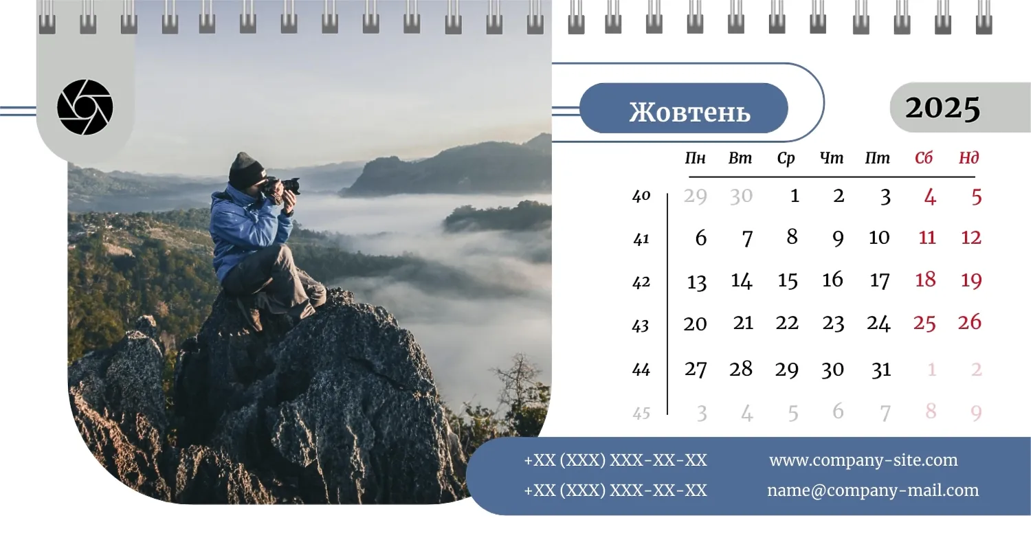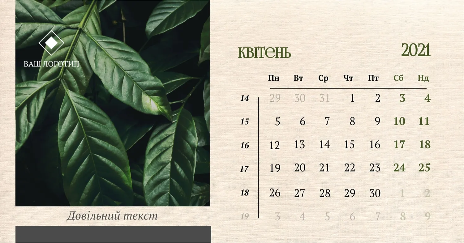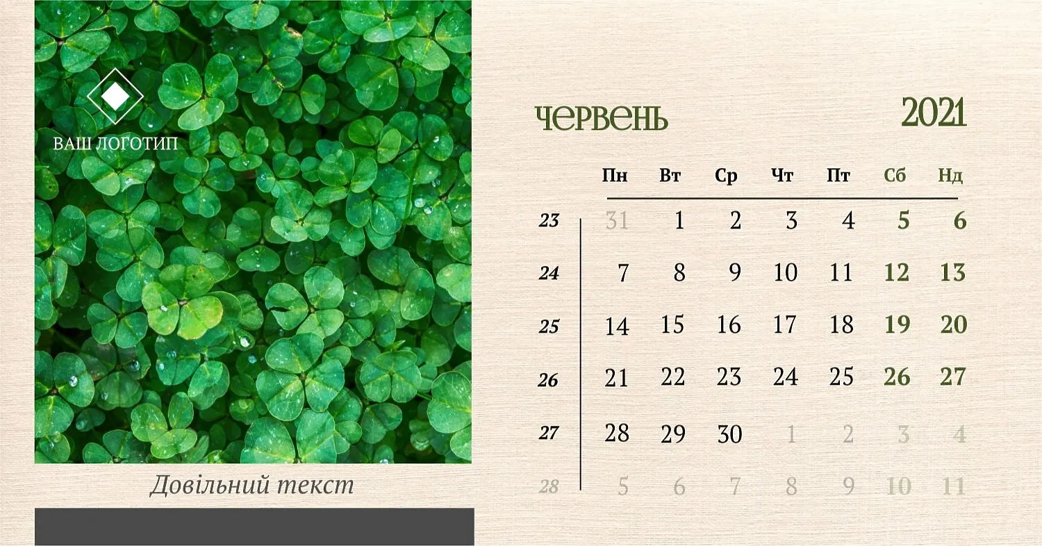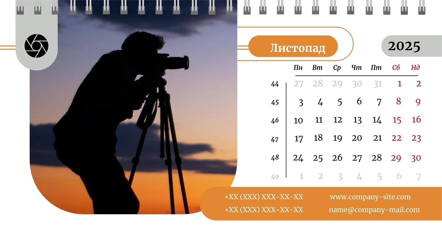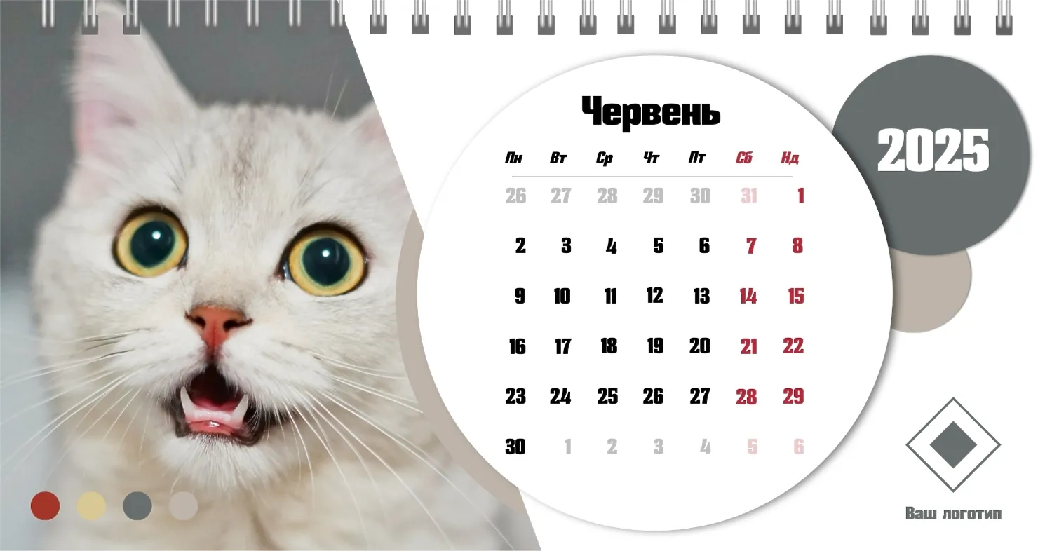 Готовий шаблон настільного горизонтального перекидного календаря з кіньми створений для тих, хто цінує природну гармонію, динаміку і символіку сили. На зображеннях представлені потужні і благородні тварини, які асоціюються зі свободою, прагненням вперед і внутрішньою рівновагою. Такий календар прекрасно підійде для кінних клубів, ферм, ветеринарних центрів, зоомагазинів, а також для тренерів, інструкторів, фотографів і всіх, хто захоплений кінним спортом або просто любить коней. Він буде однаково доречний як в робочому кабінеті, так і в домашньому інтер'єрі, створюючи атмосферу спокою і натхнення. У нашому онлайн-конструкторі цей шаблон можна легко адаптувати під особисті переваги. Ви можете замінити фотографії на свої власні знімки коней, додати логотип клубу або господарства, змінити шрифти, кольори і розстановку елементів. Є можливість підписати місяці, виділити важливі дати, відзначити змагання, тренування, дні народження та інші події. Будь-який елемент календаря – від фону до дрібних деталей-піддається редагуванню, що дозволяє створити дійсно персоналізований варіант. Онлайн-конструктор працює максимально зручно і просто: всі зміни відображаються відразу, можна експериментувати з композиціями, пробувати різні стилі і зберігати кілька варіантів.