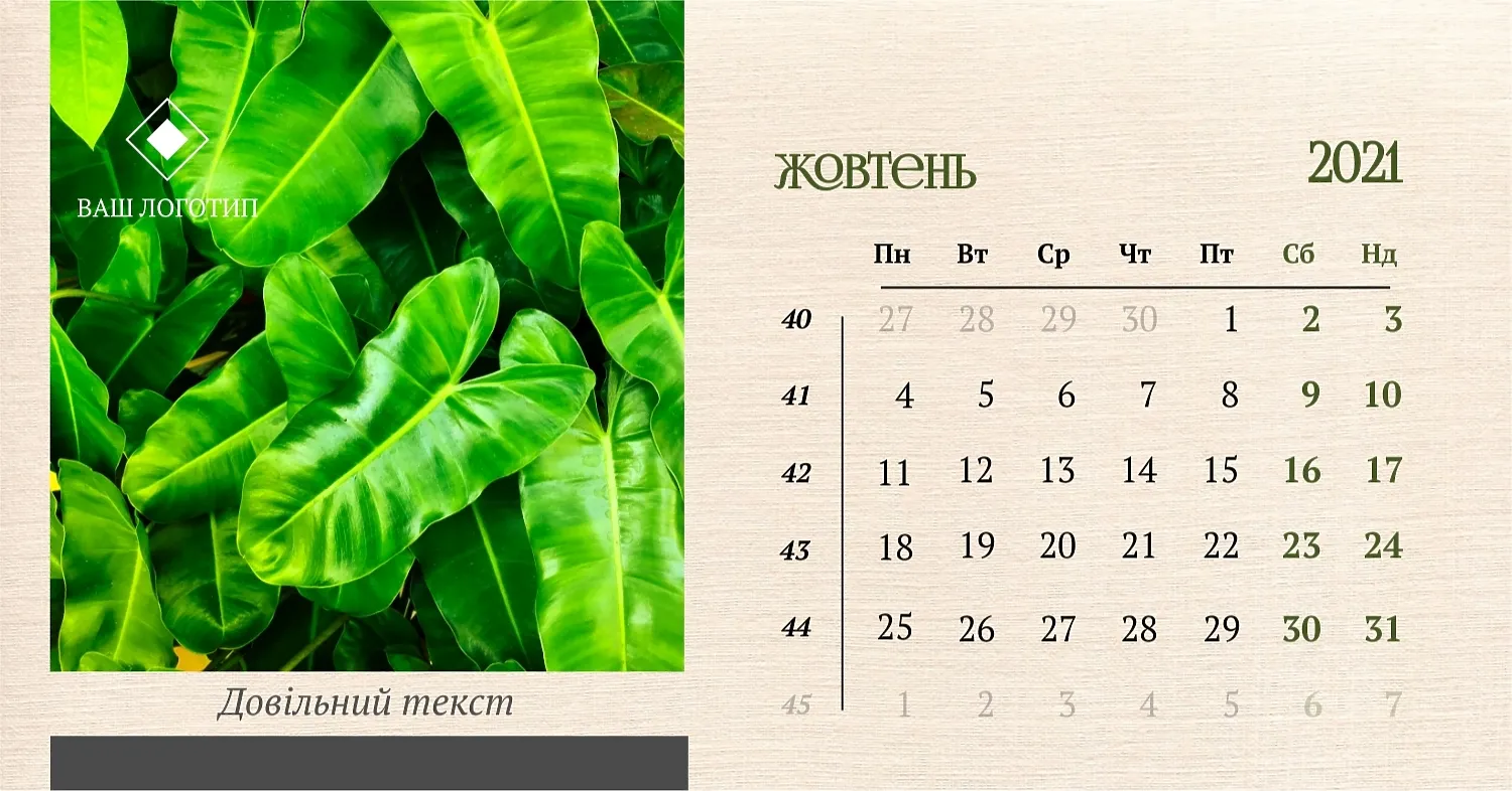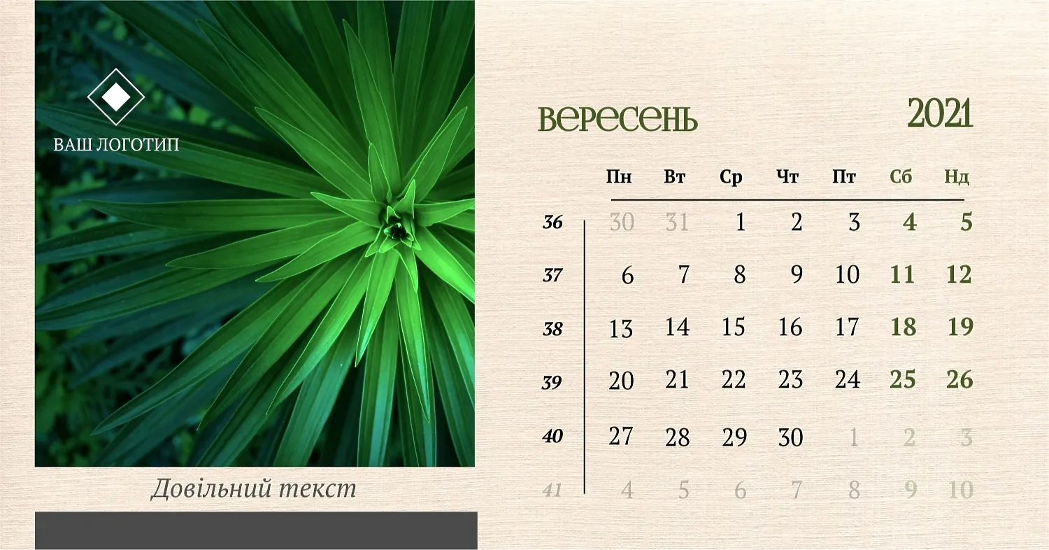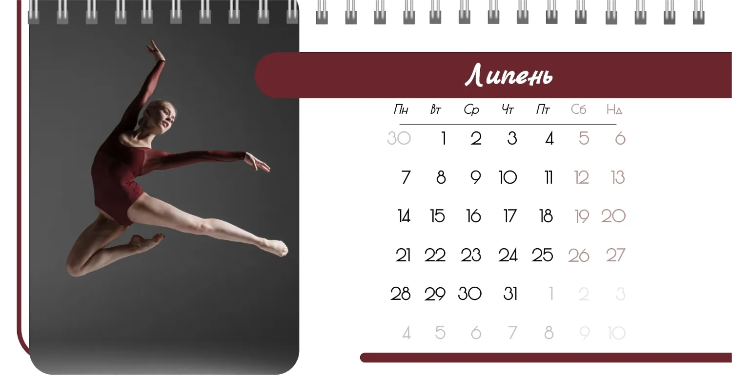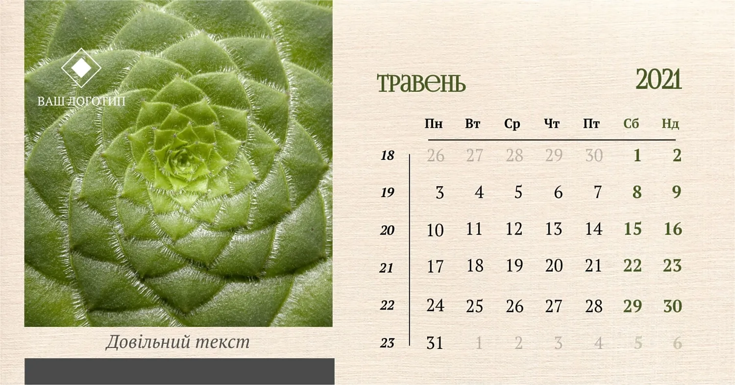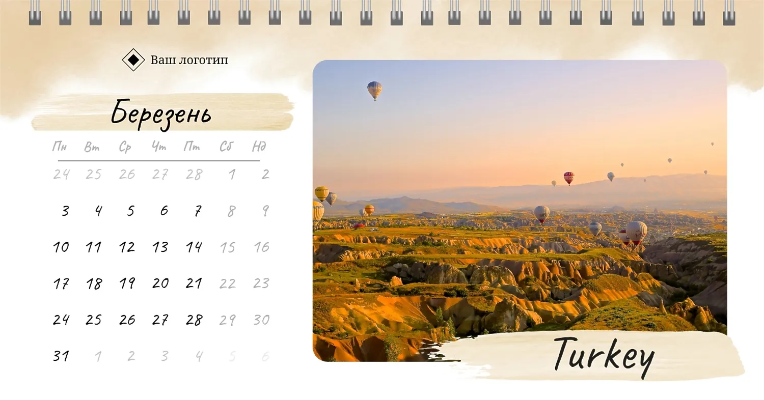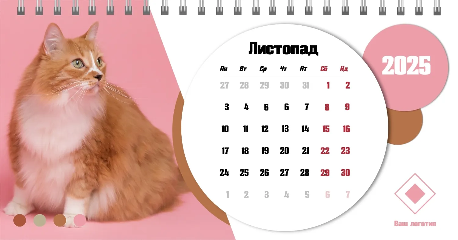 Готовий шаблон настільного горизонтального перекидного календаря з кіньми створений для тих, хто цінує природну гармонію, динаміку і символіку сили. На зображеннях представлені потужні і благородні тварини, які асоціюються зі свободою, прагненням вперед і внутрішньою рівновагою. Такий календар прекрасно підійде для кінних клубів, ферм, ветеринарних центрів, зоомагазинів, а також для тренерів, інструкторів, фотографів і всіх, хто захоплений кінним спортом або просто любить коней. Він буде однаково доречний як в робочому кабінеті, так і в домашньому інтер'єрі, створюючи атмосферу спокою і натхнення. У нашому онлайн-конструкторі цей шаблон можна легко адаптувати під особисті переваги. Ви можете замінити фотографії на свої власні знімки коней, додати логотип клубу або господарства, змінити шрифти, кольори і розстановку елементів. Є можливість підписати місяці, виділити важливі дати, відзначити змагання, тренування, дні народження та інші події. Будь-який елемент календаря – від фону до дрібних деталей-піддається редагуванню, що дозволяє створити дійсно персоналізований варіант. Онлайн-конструктор працює максимально зручно і просто: всі зміни відображаються відразу, можна експериментувати з композиціями, пробувати різні стилі і зберігати кілька варіантів.