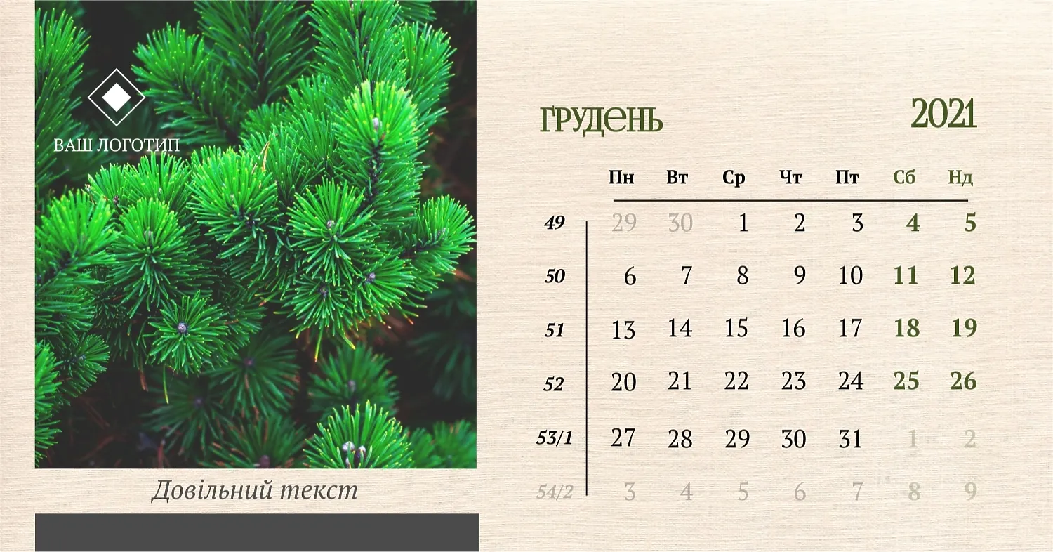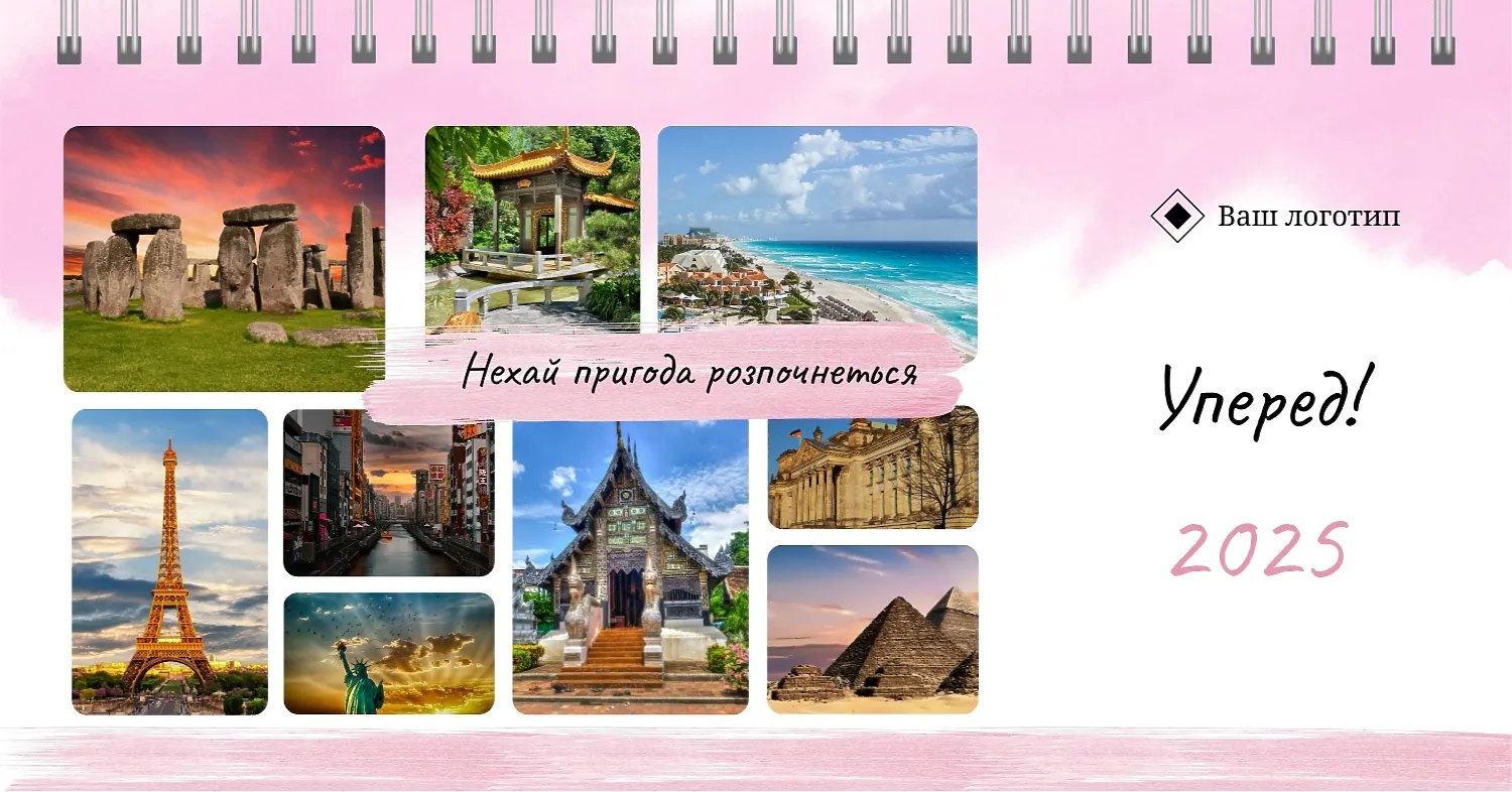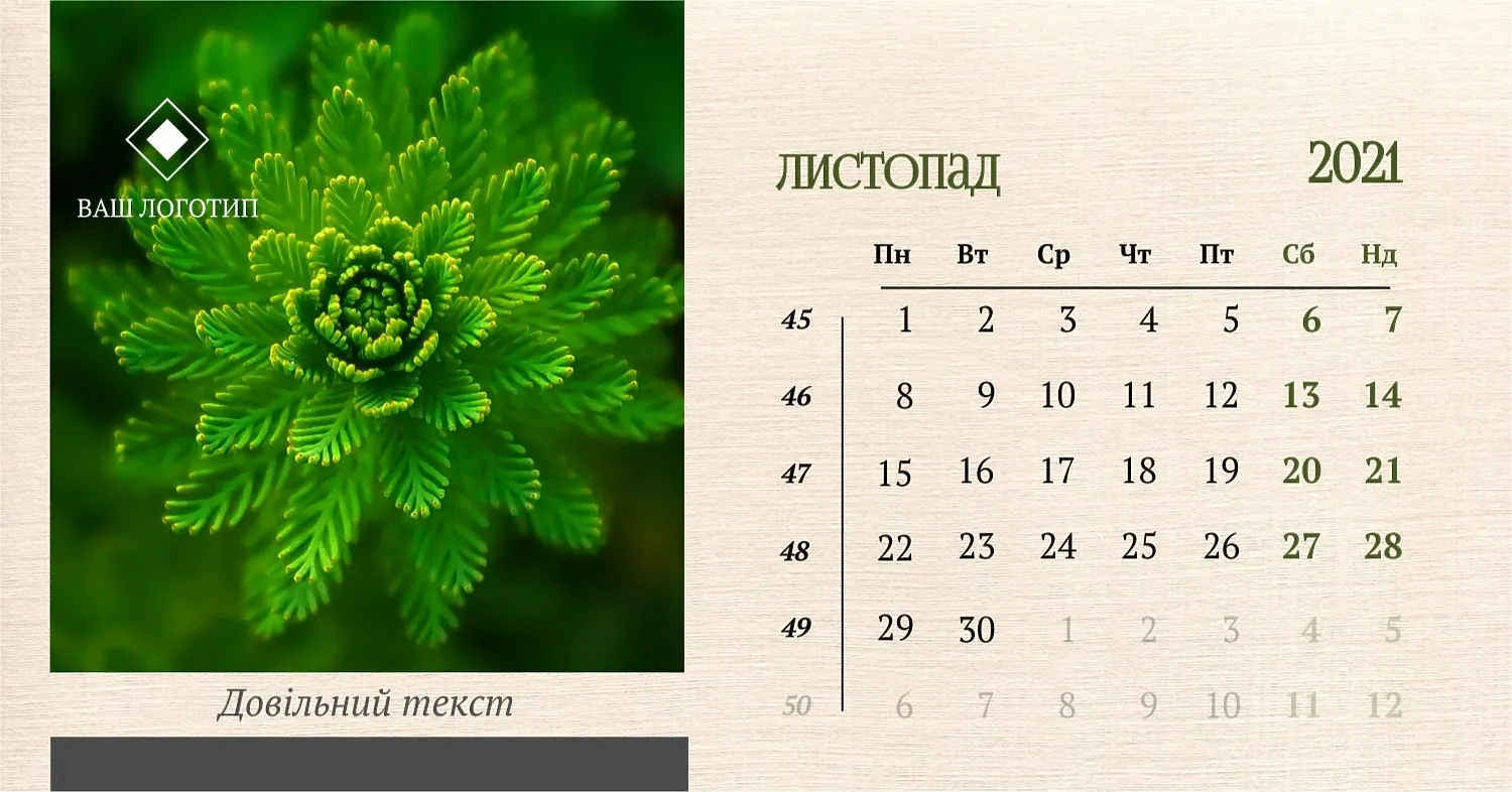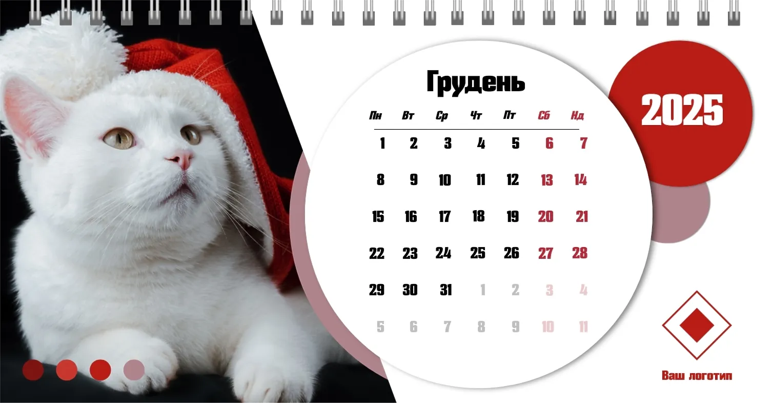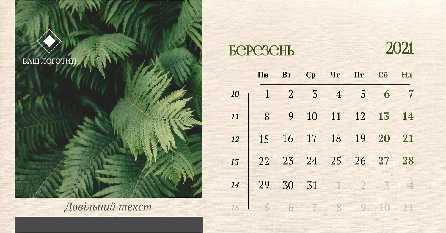 Готовий шаблон настільного горизонтального перекидного календаря з кіньми створений для тих, хто цінує природну гармонію, динаміку і символіку сили. На зображеннях представлені потужні і благородні тварини, які асоціюються зі свободою, прагненням вперед і внутрішньою рівновагою. Такий календар прекрасно підійде для кінних клубів, ферм, ветеринарних центрів, зоомагазинів, а також для тренерів, інструкторів, фотографів і всіх, хто захоплений кінним спортом або просто любить коней. Він буде однаково доречний як в робочому кабінеті, так і в домашньому інтер'єрі, створюючи атмосферу спокою і натхнення. У нашому онлайн-конструкторі цей шаблон можна легко адаптувати під особисті переваги. Ви можете замінити фотографії на свої власні знімки коней, додати логотип клубу або господарства, змінити шрифти, кольори і розстановку елементів. Є можливість підписати місяці, виділити важливі дати, відзначити змагання, тренування, дні народження та інші події. Будь-який елемент календаря – від фону до дрібних деталей-піддається редагуванню, що дозволяє створити дійсно персоналізований варіант. Онлайн-конструктор працює максимально зручно і просто: всі зміни відображаються відразу, можна експериментувати з композиціями, пробувати різні стилі і зберігати кілька варіантів.