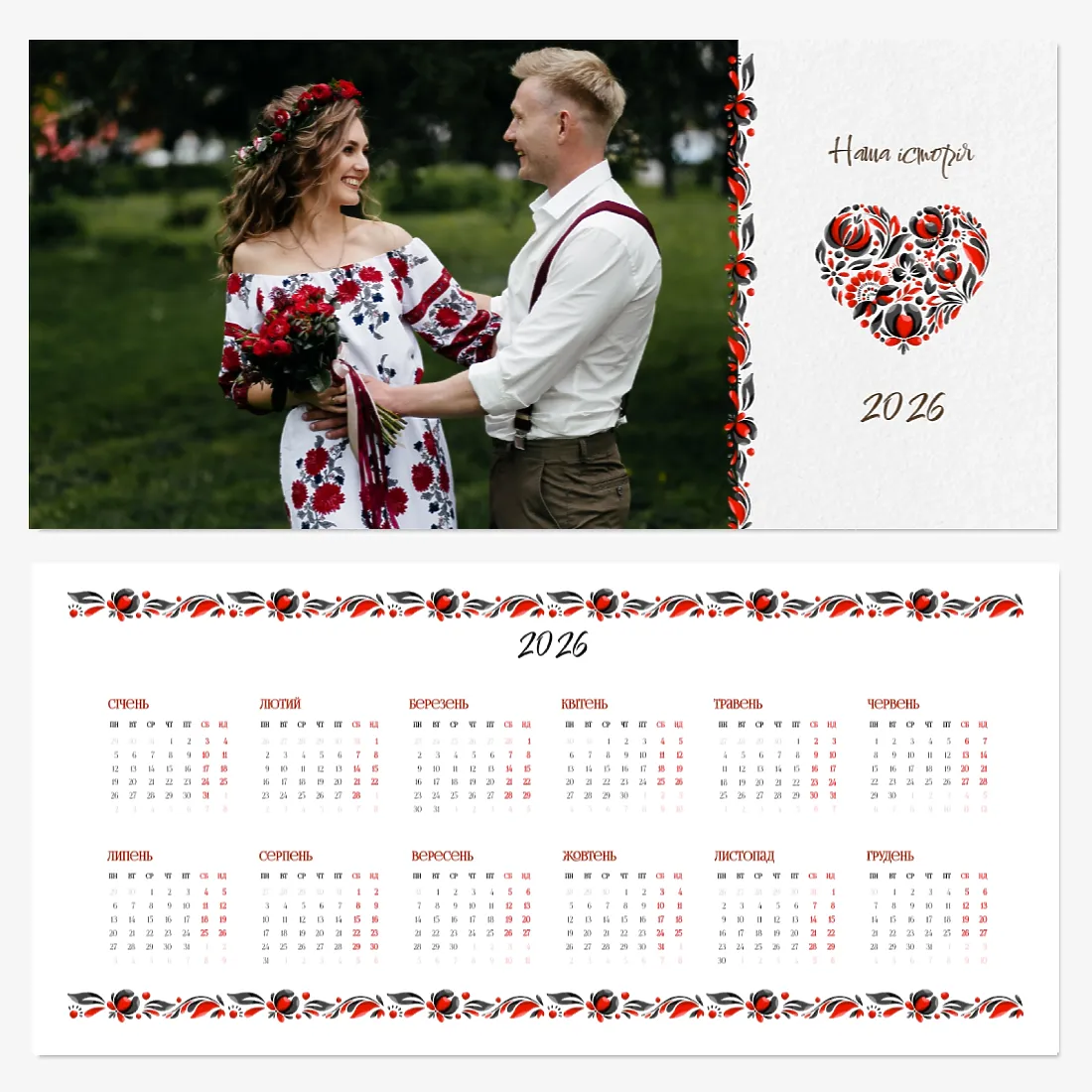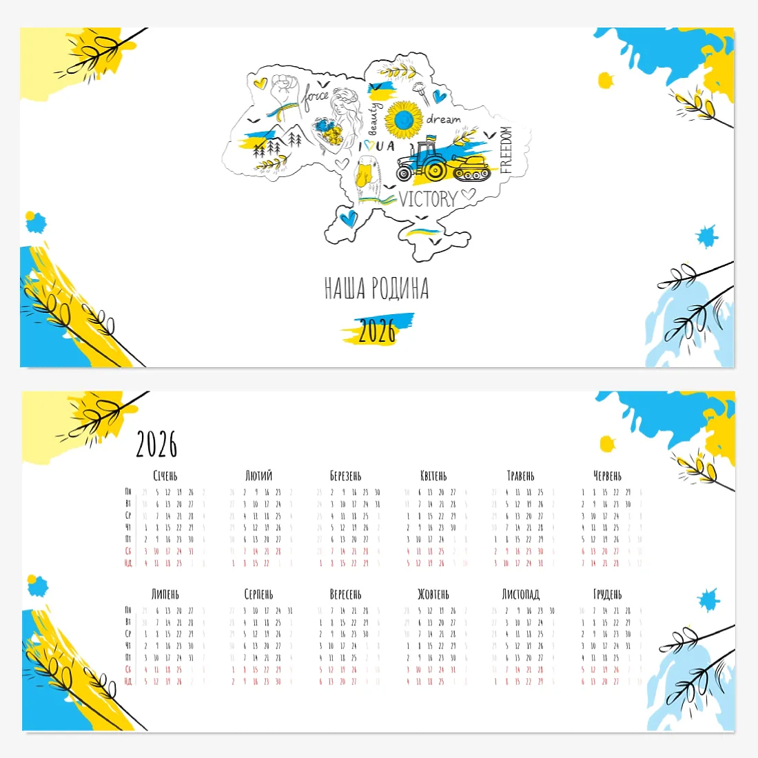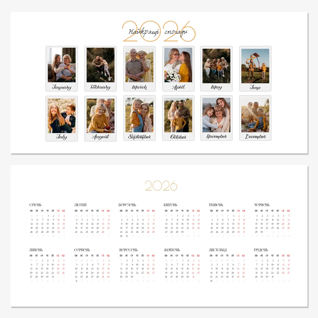 Готовий шаблон невеликого настільного сімейного календаря з поздоровленням виконаний в мінімалістичному і сучасному стилі, де кожен місяць зустрічає користувача коротким привітанням. Такий підхід робить календар не просто інструментом для планування, але і стильним елементом інтер'єру. В онлайн-конструкторі цей шаблон можна легко адаптувати під особисті або корпоративні завдання. Є можливість змінити фон, вибрати інші поєднання шрифтів, замінити привітальні фрази або залишити їх у вихідному вигляді, скорегувати колірну гамму, Додати фотографії, ілюстрації або фірмову графіку. При необхідності можна вставити логотип компанії, контактні дані або мотиваційні цитати, щоб календар став частиною корпоративного стилю або персональним творчим об'єктом для натхнення.
